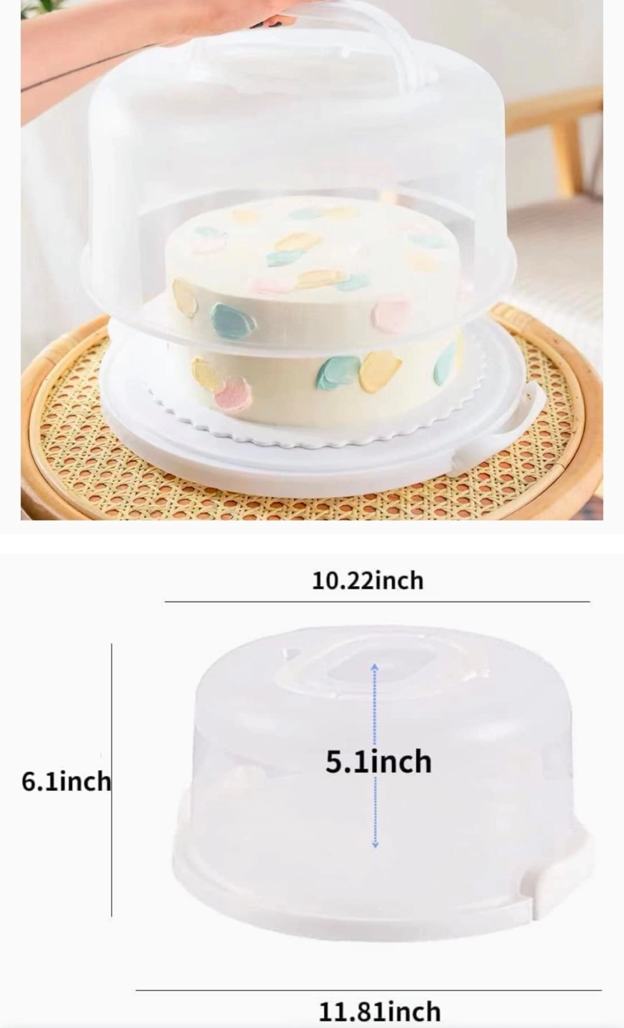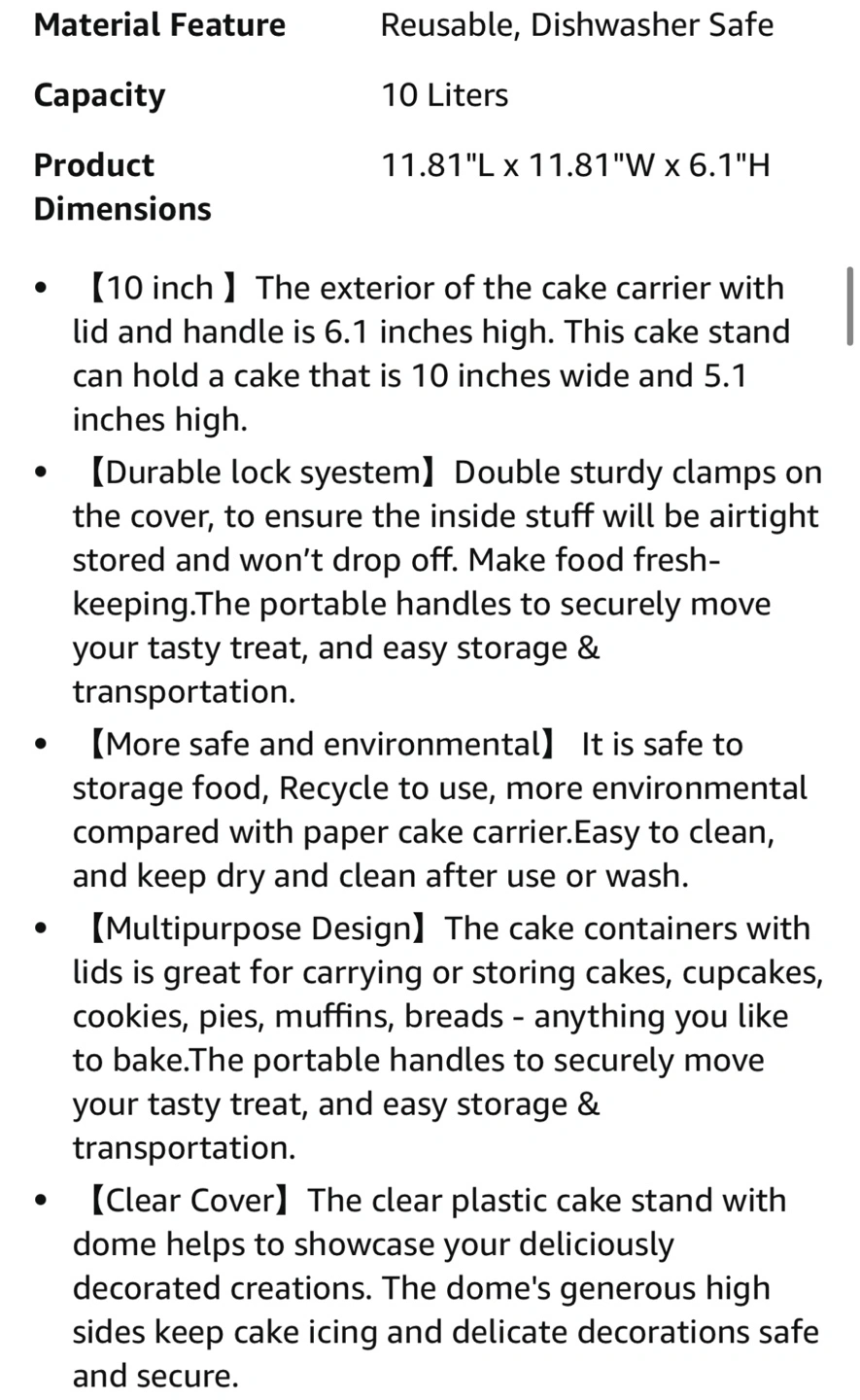 Portable cake carrier. Durable plastic construction. Includes a clear lid. Easy to transport and store. Great for cakes, cupcakes, cookies, and more.