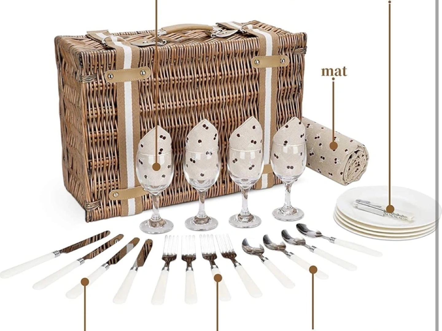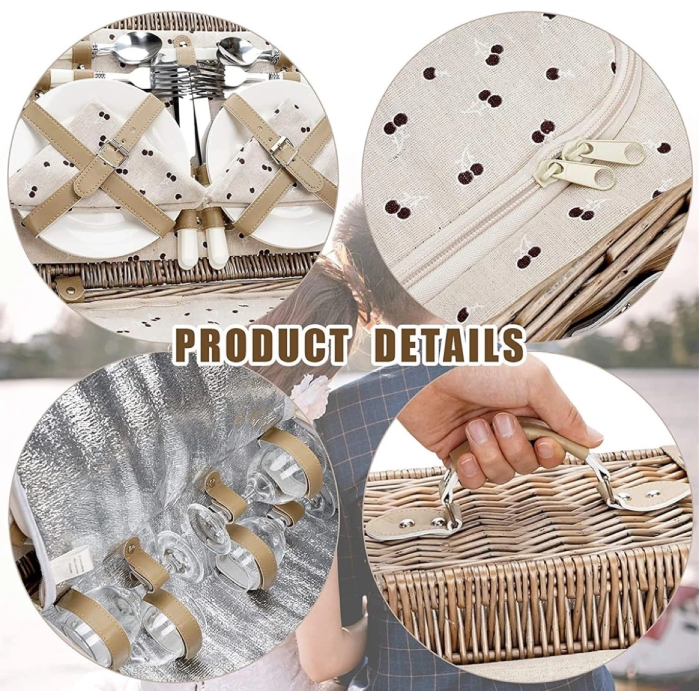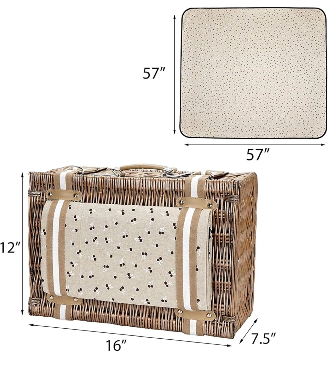 Includes 4 Stainless Steel Cutlery with Plastic Handles (Knife, Fork and Spoon), 4 7" Porcelain Plates, 4 Real Wine Glasses, 4 Linen Waterproof Napkins, 1 Picnic Blanket, Dimensions: 57"X57", 1 Waiter-style bottle opener. 2pcs wraparound canvas straps, not only for decoration but also to help secure your picnic blanket.