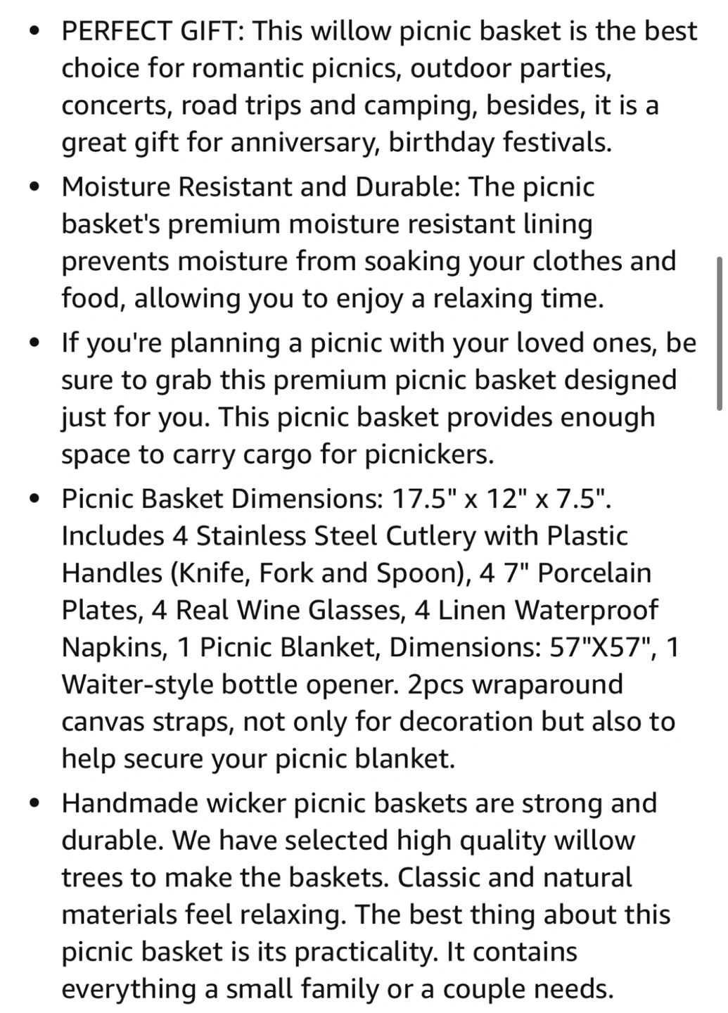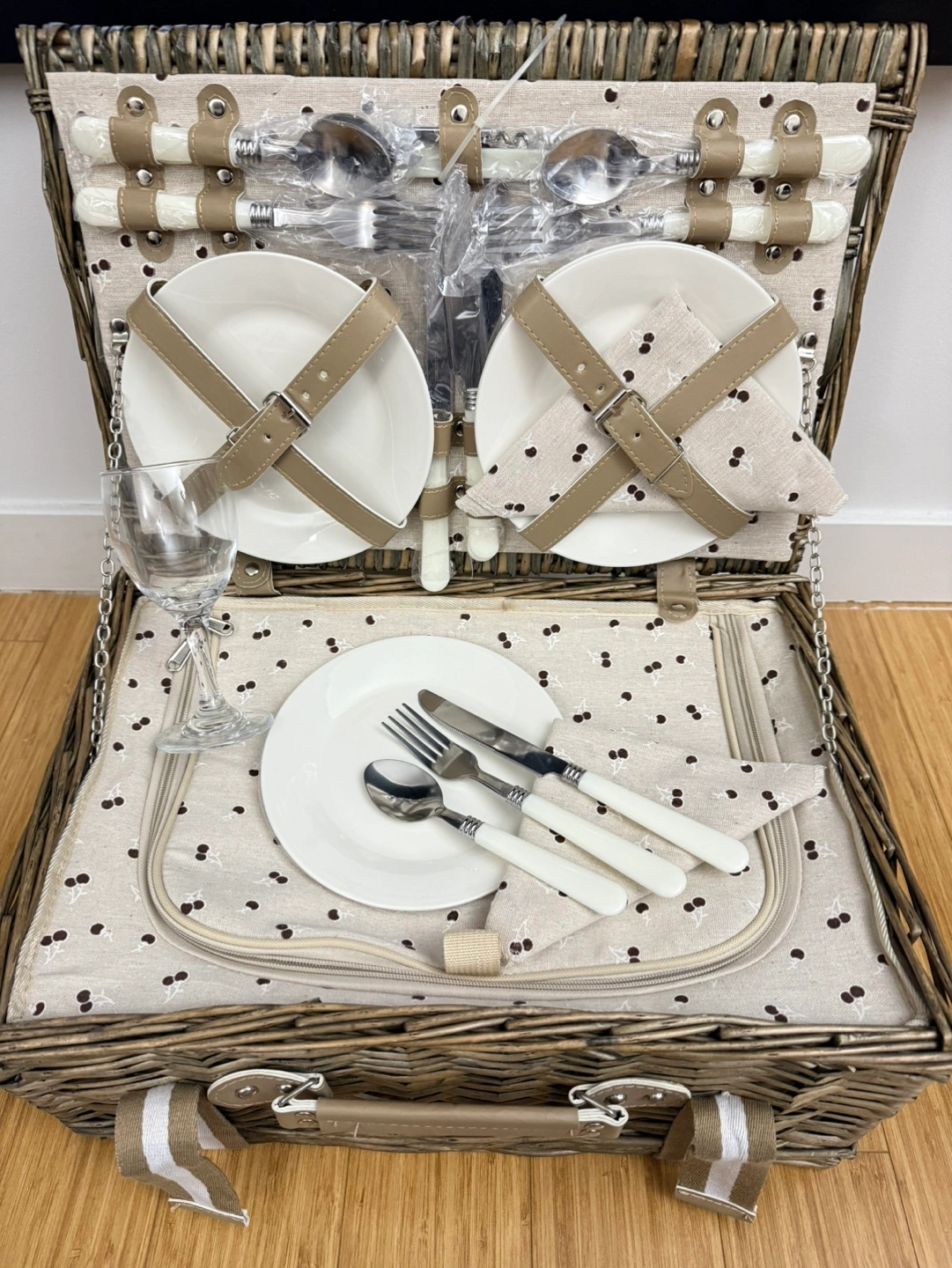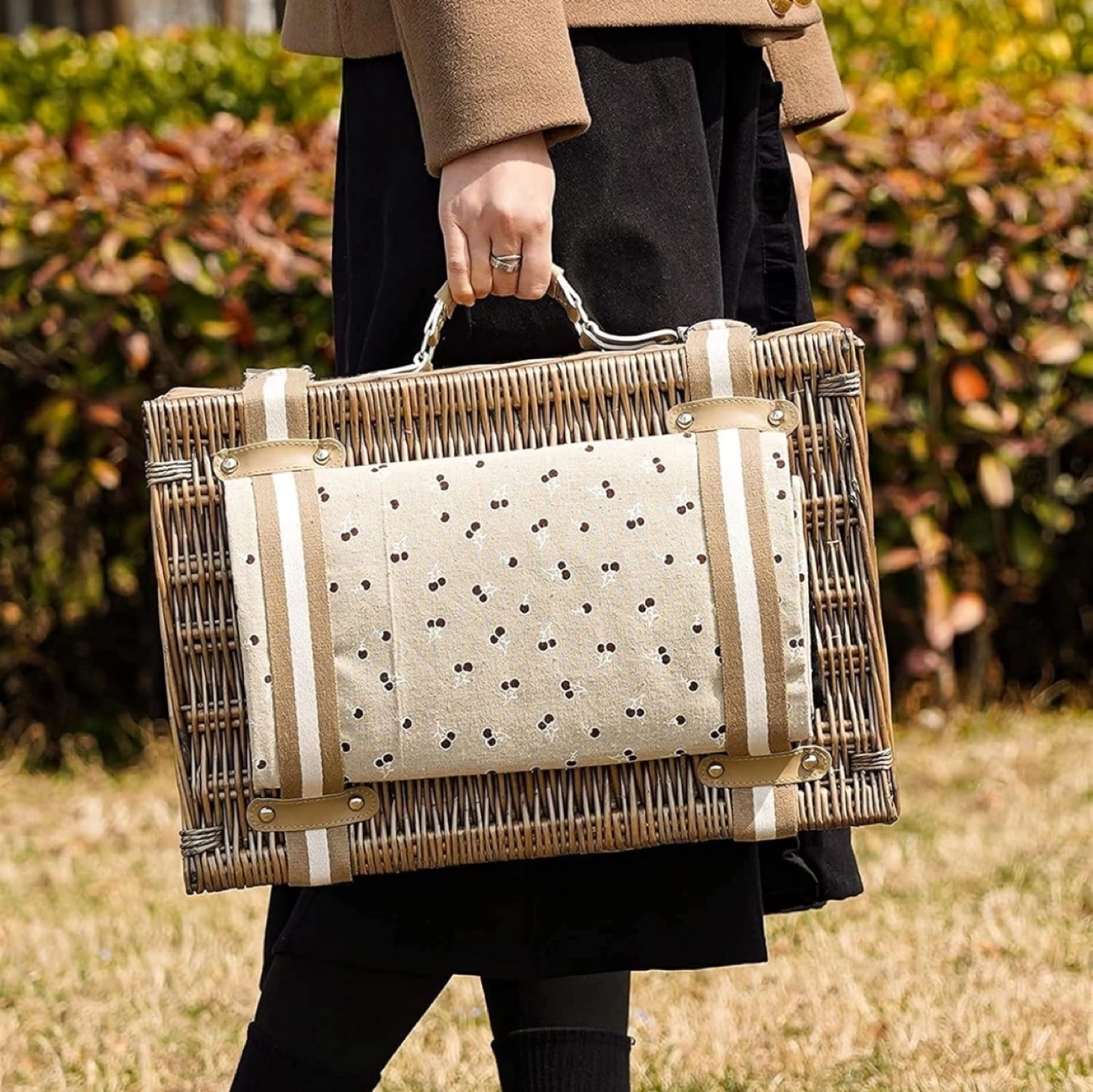 Includes 4 Stainless Steel Cutlery with Plastic Handles (Knife, Fork and Spoon), 4 7" Porcelain Plates, 4 Real Wine Glasses, 4 Linen Waterproof Napkins, 1 Picnic Blanket, Dimensions: 57"X57", 1 Waiter-style bottle opener. 2pcs wraparound canvas straps, not only for decoration but also to help secure your picnic blanket.