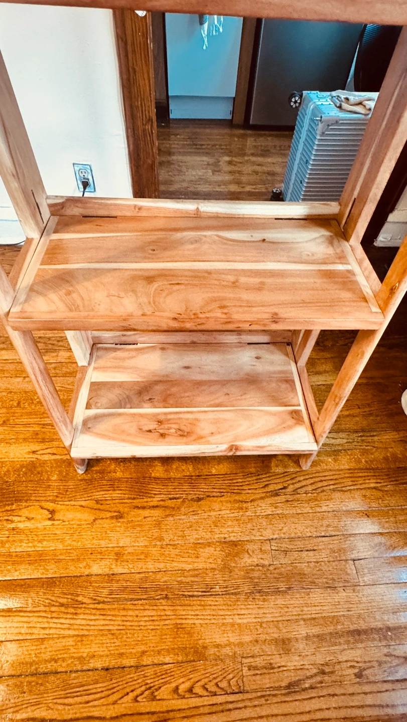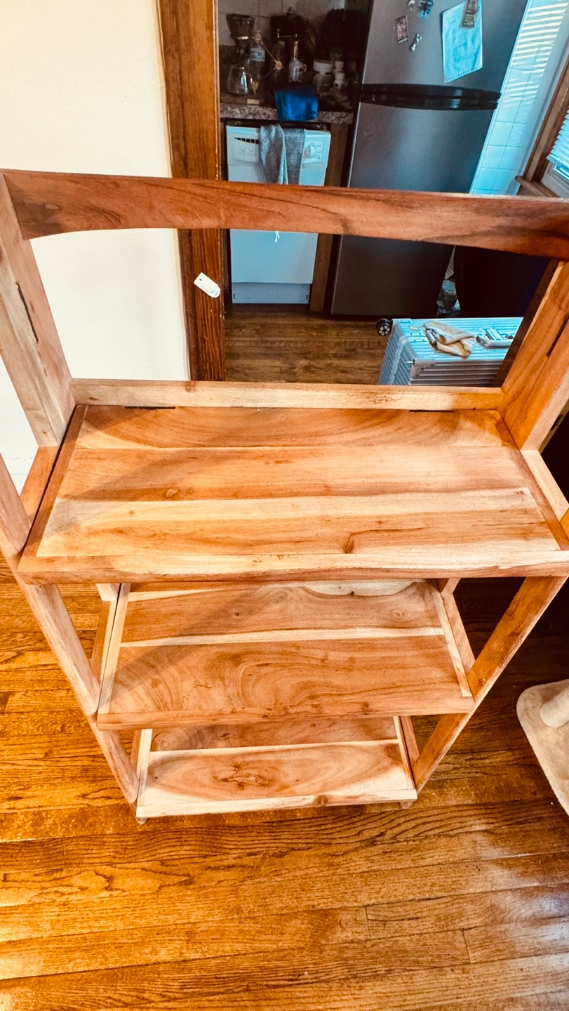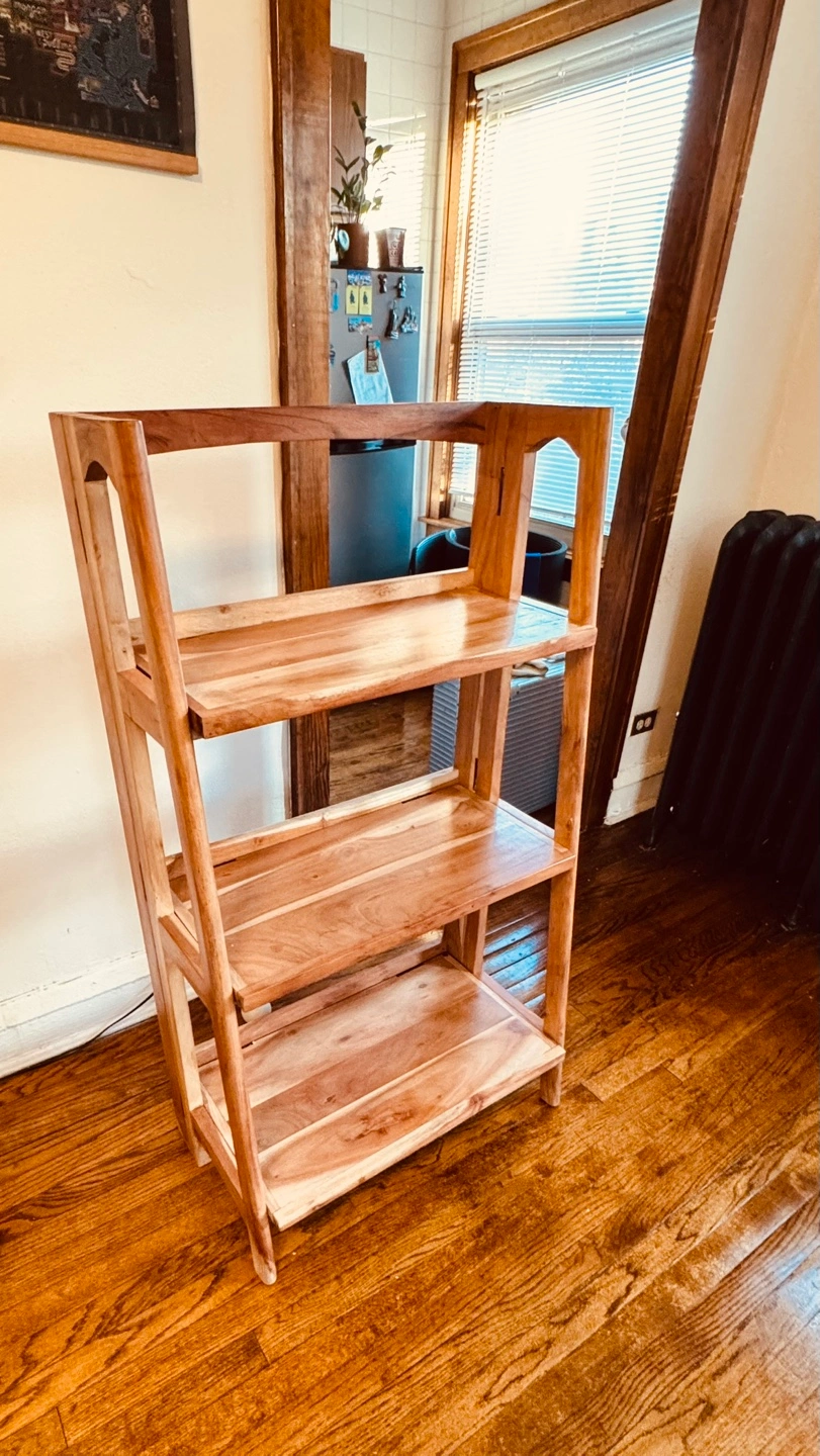 Free-standing wooden shelf. Three shelves. Solid wood construction. I purchased it a year ago, and I have been using it to place my coffee equipment and plants.