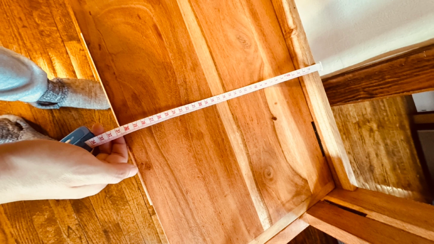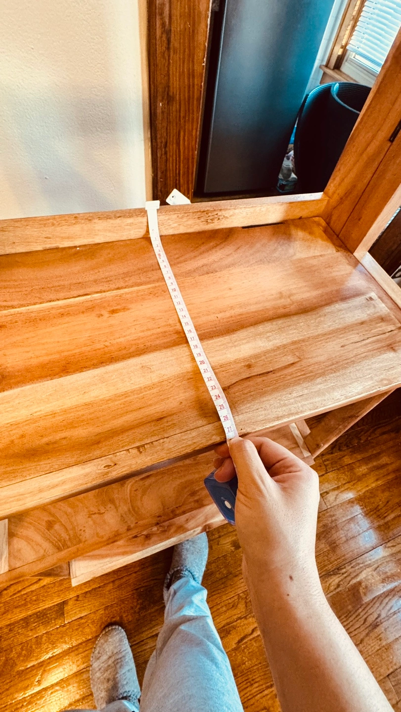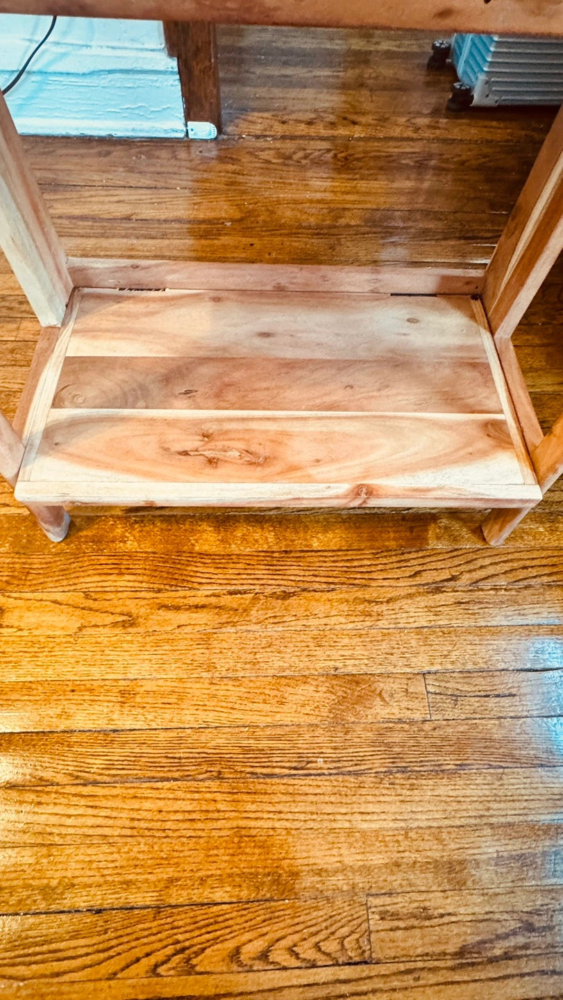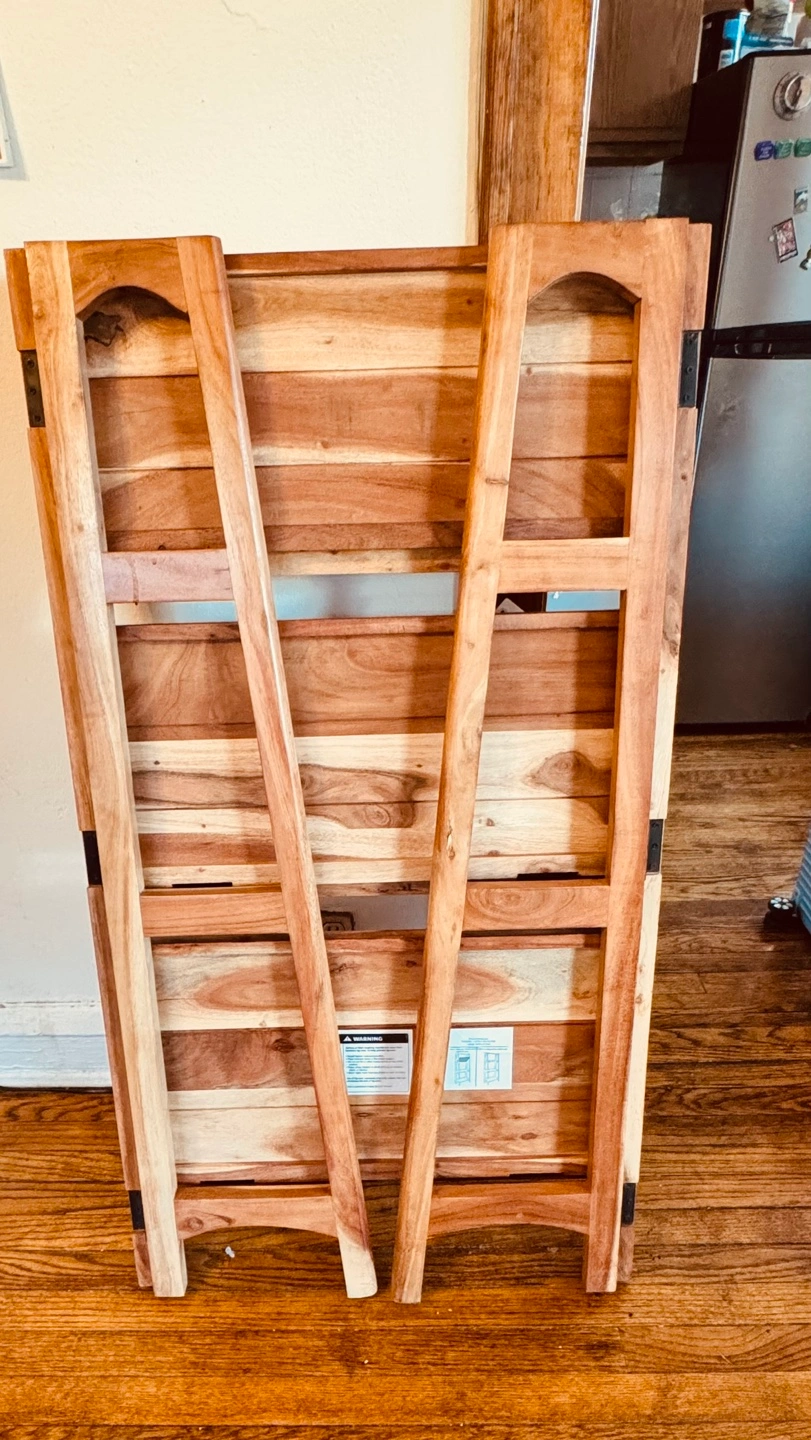 Free-standing wooden shelf. Three shelves. Solid wood construction. I purchased it a year ago, and I have been using it to place my coffee equipment and plants.