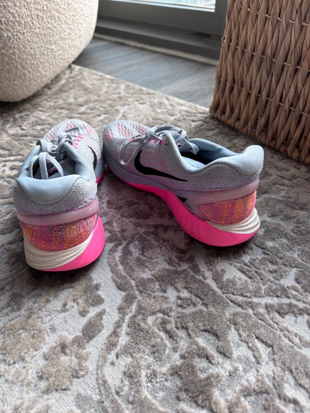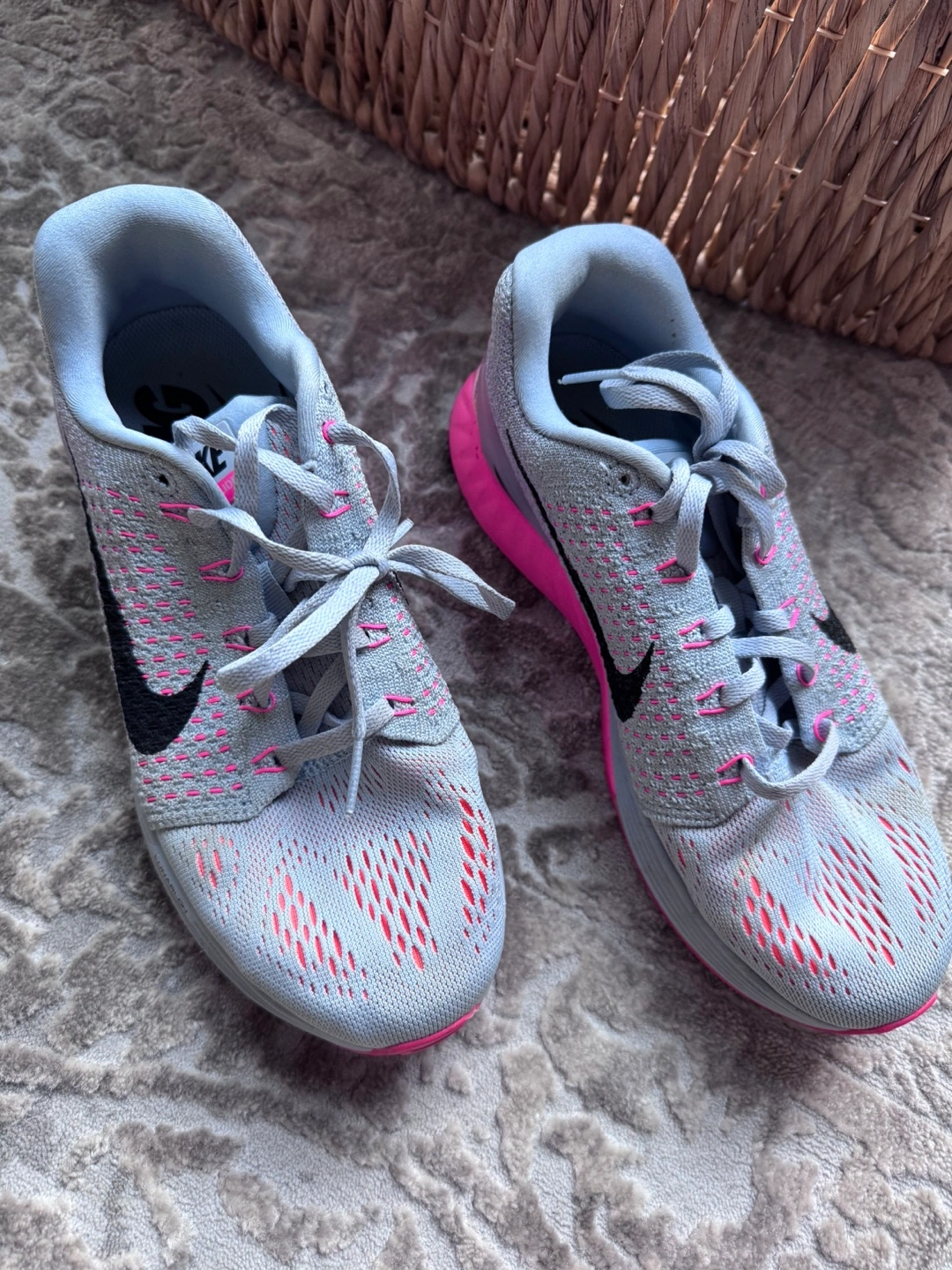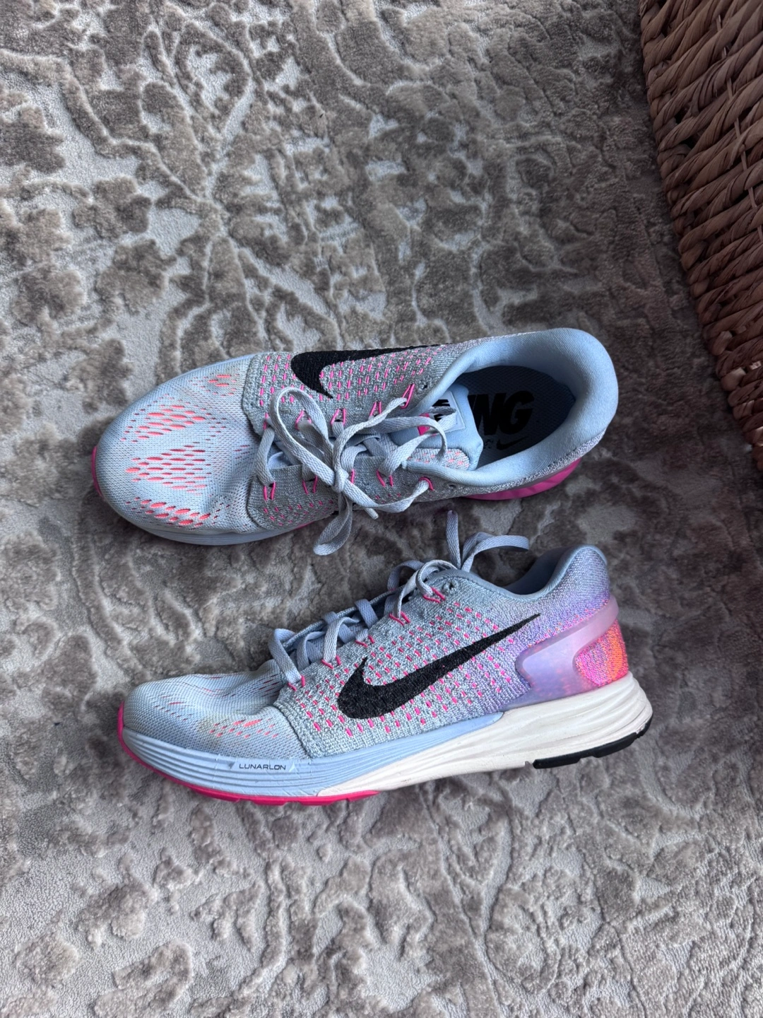 65Lightly used Nike LunarGlide 8 running shoes. Light blue and pink colorway. Great for workouts or everyday wear. Comfortable and supportive. Features Lunarlon cushioning.