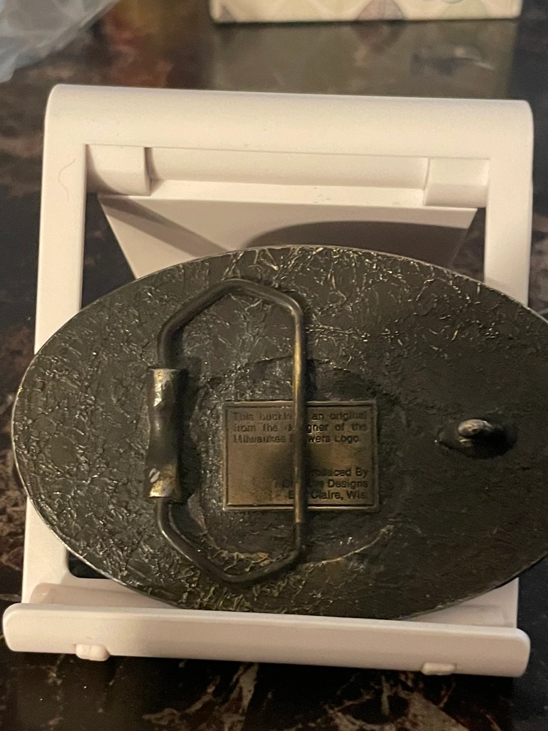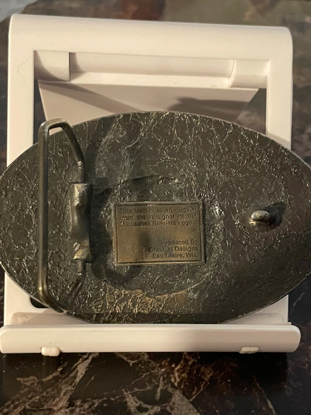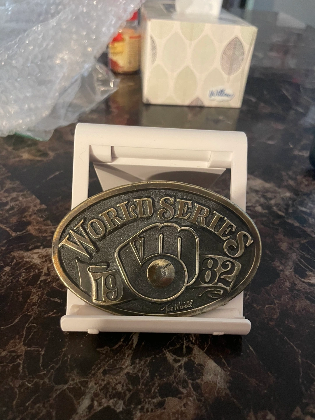 Brass belt buckle. Commemorates the 1982 World Series. Features the Milwaukee Brewers logo. Designed by Crown Designs, Eau Claire, WI. Tom Meinel signature.