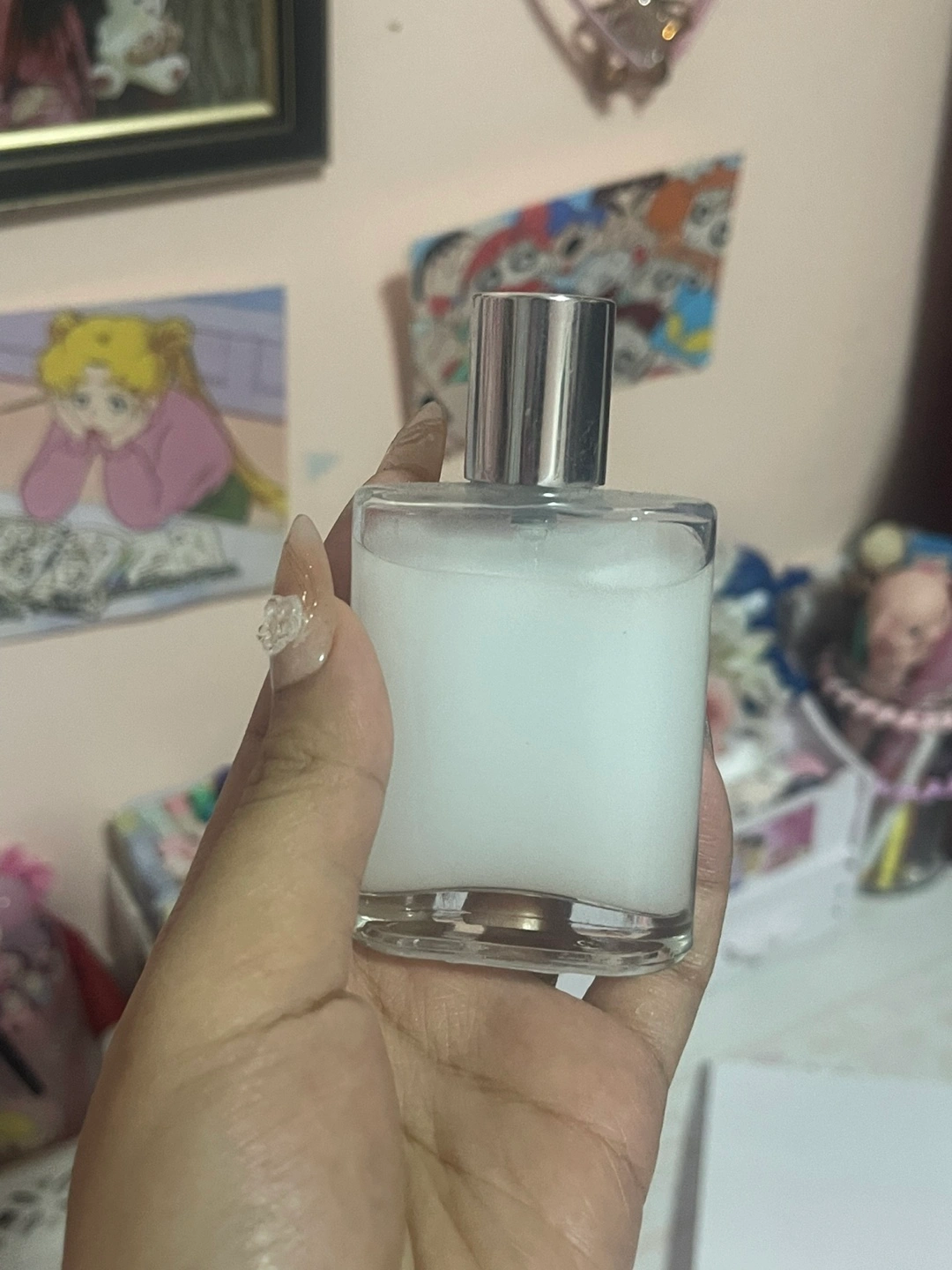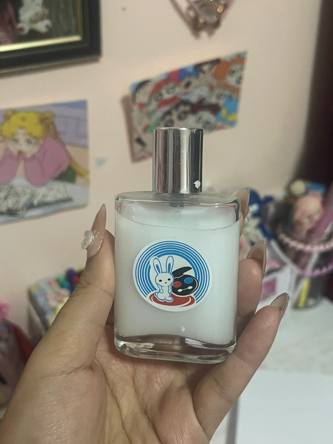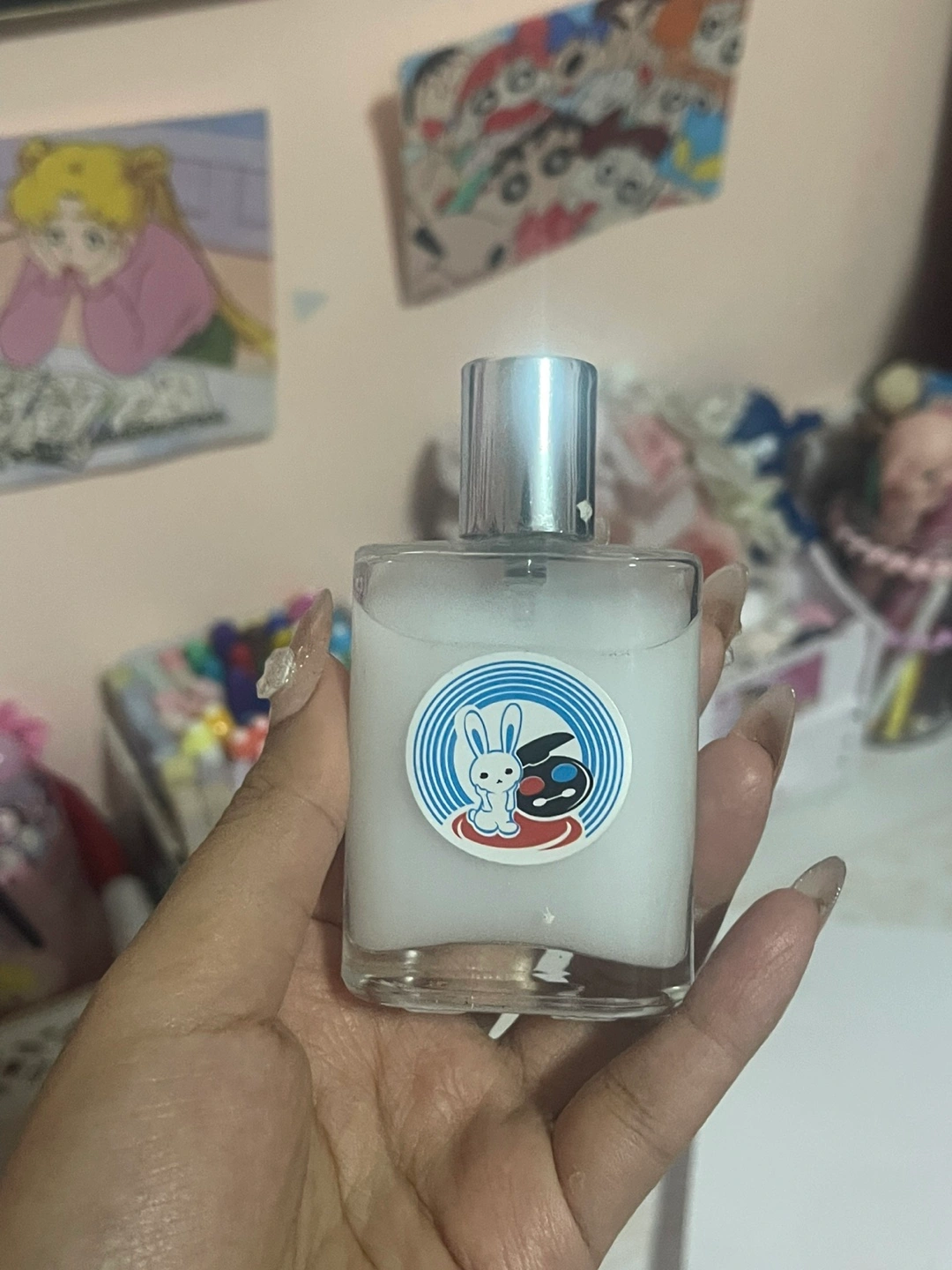 90Small bottle of perfume. Clear glass bottle with silver spray top. Features an adorable cartoon rabbit and cat design on the label. Unique and charming scent.