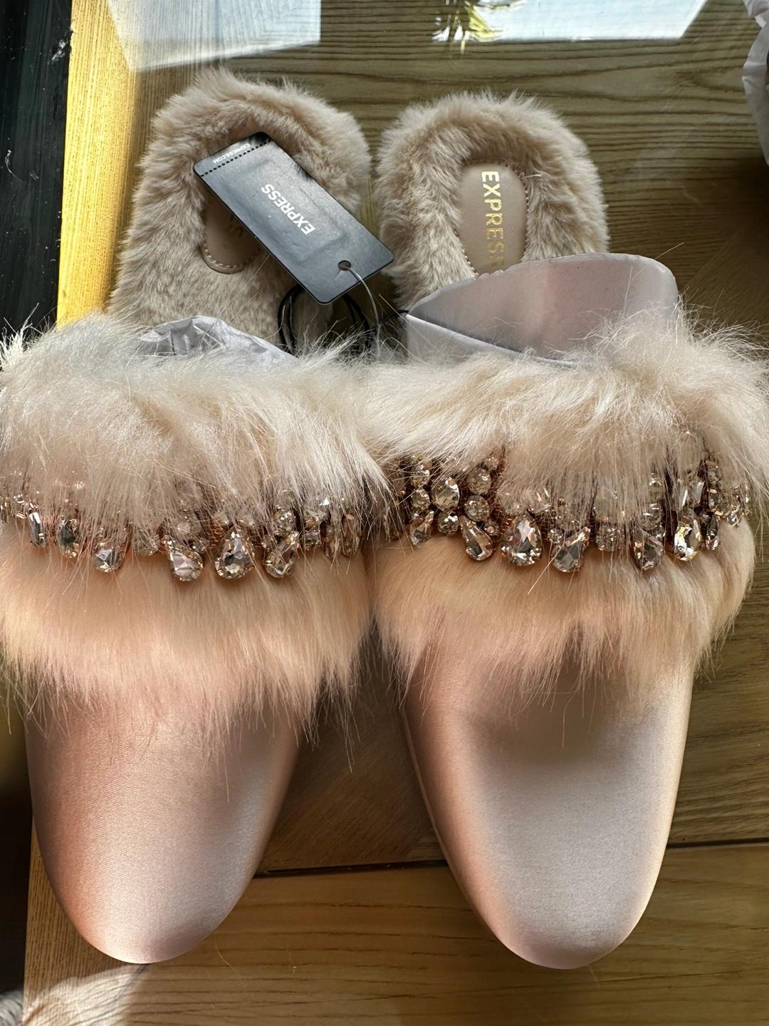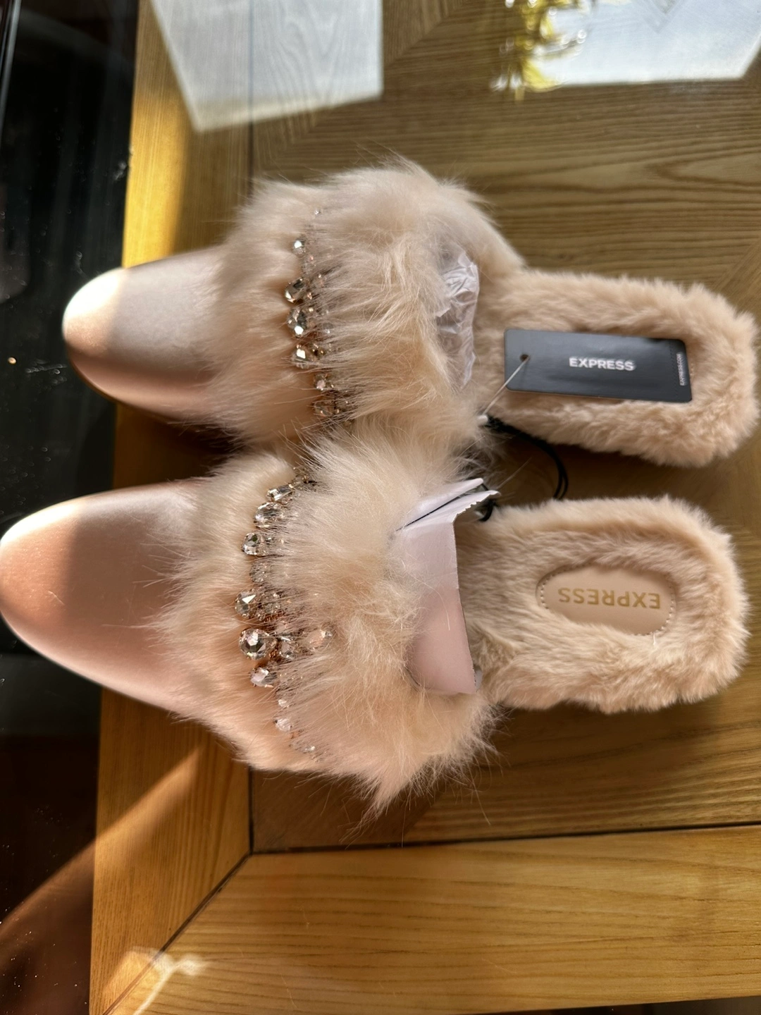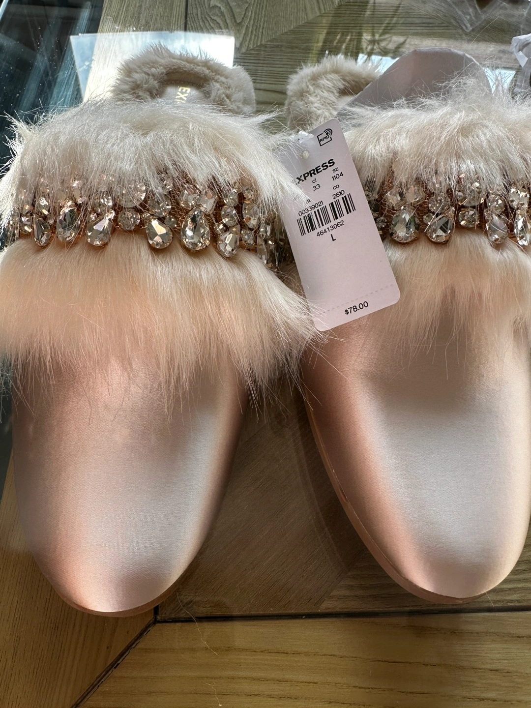 Brand new Express mules. Champagne satin upper. Faux fur trim. Crystal embellishment. Size large.
