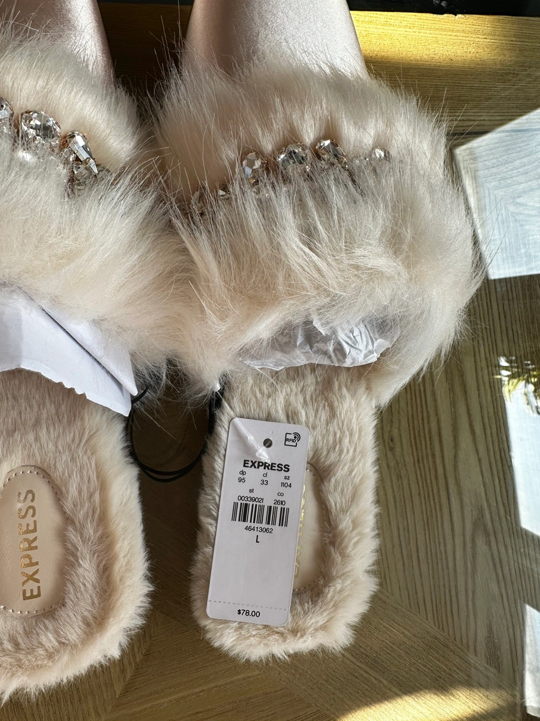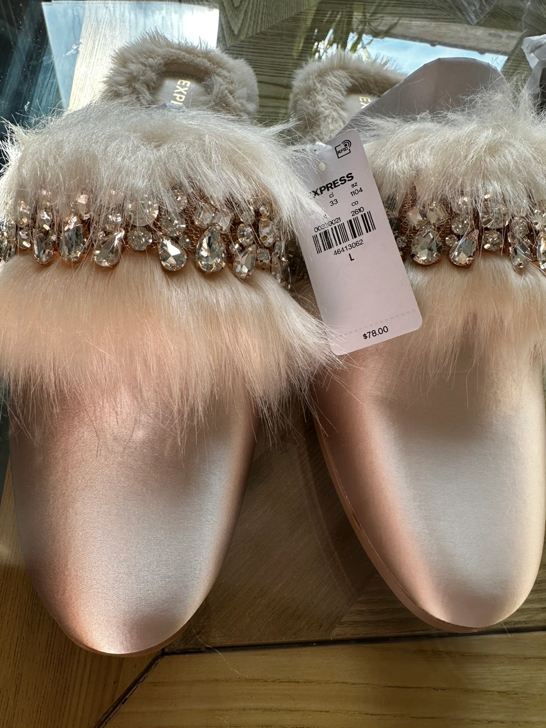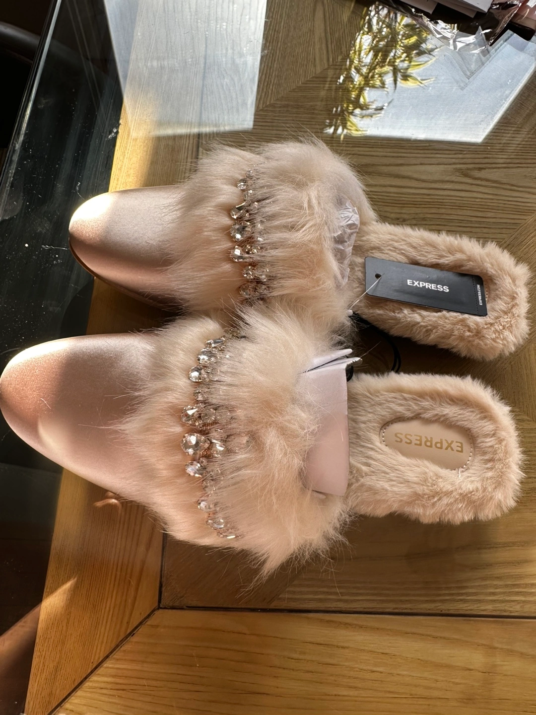Brand new Express mules. Champagne satin upper. Faux fur trim. Crystal embellishment. Size large.