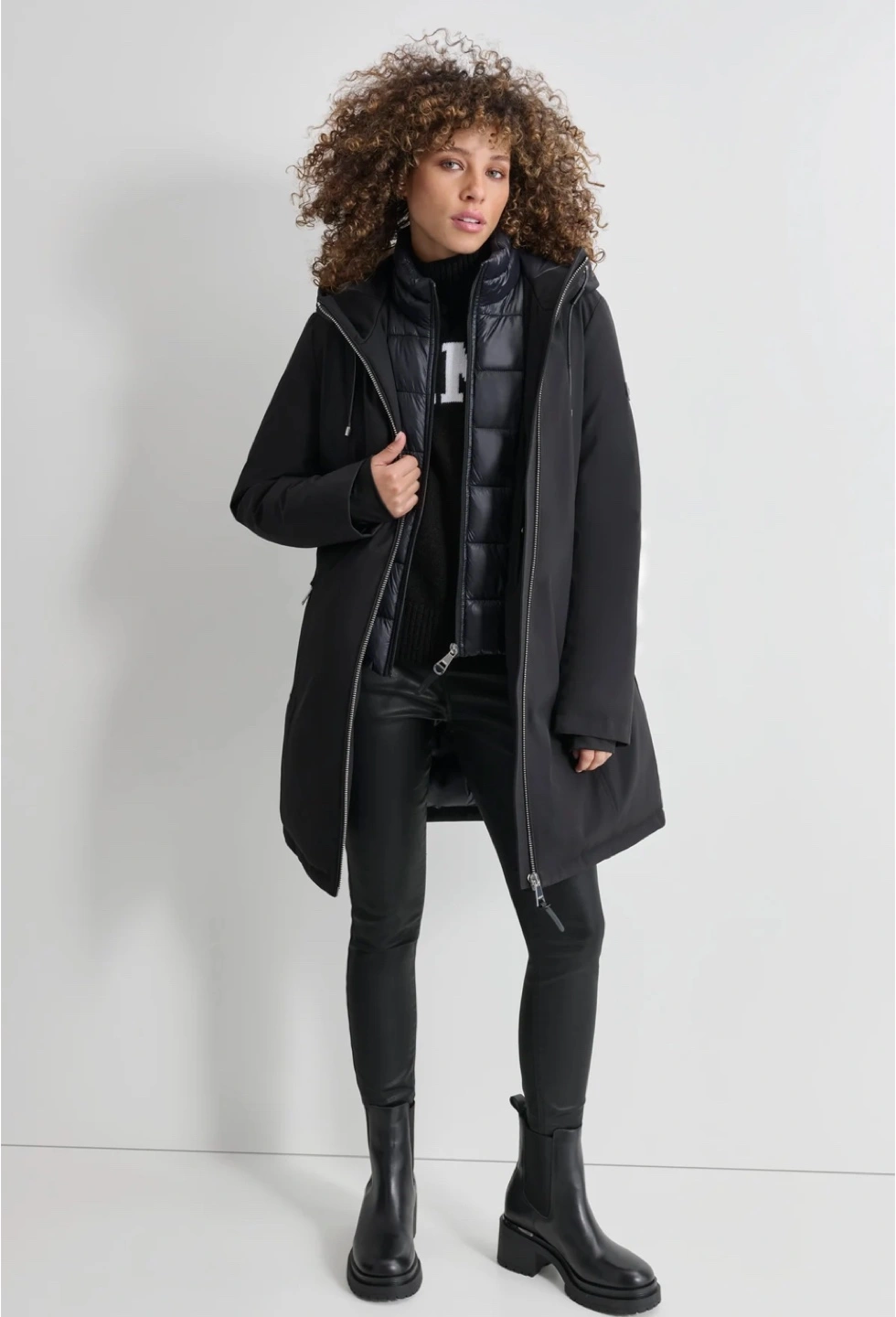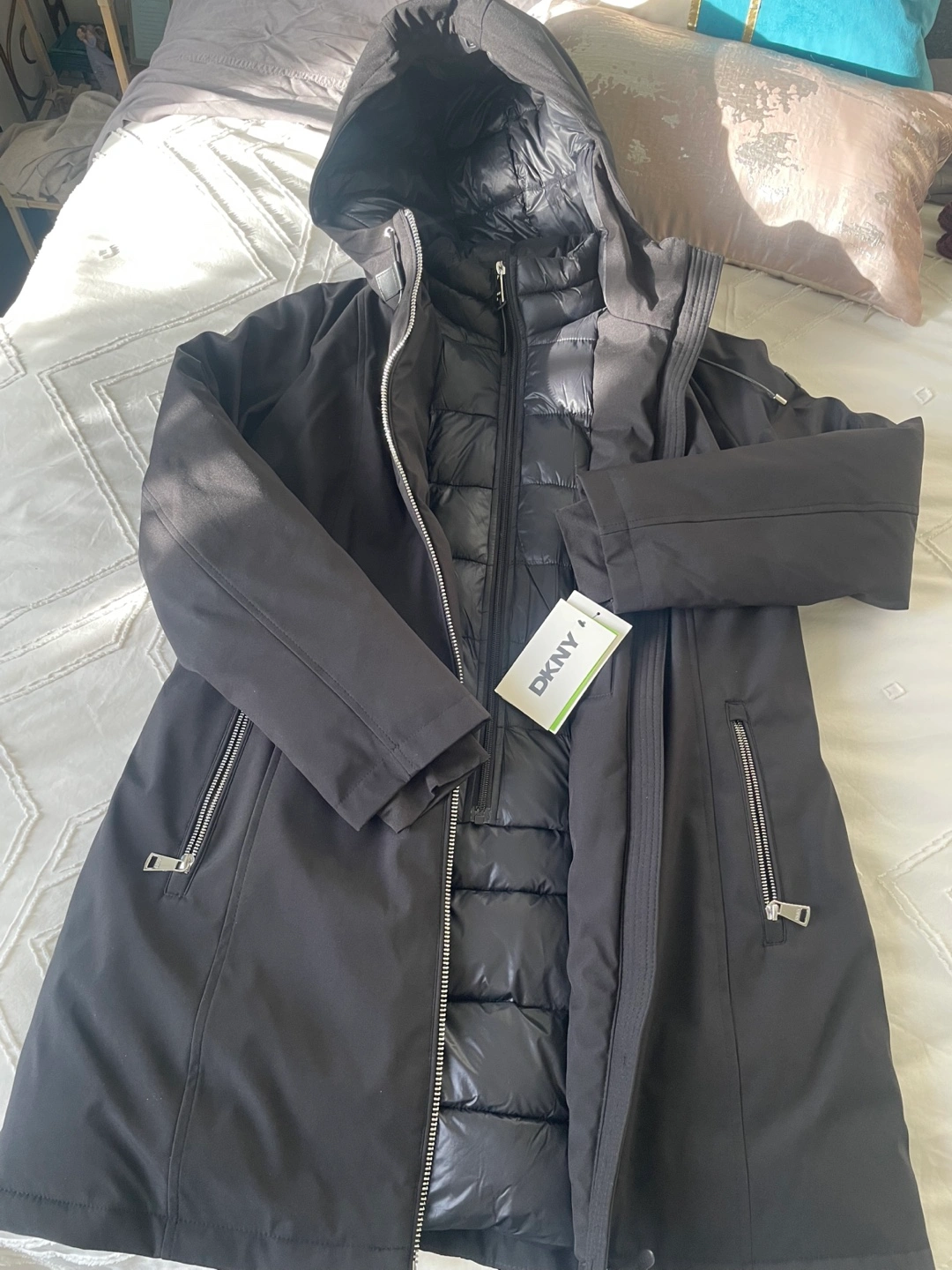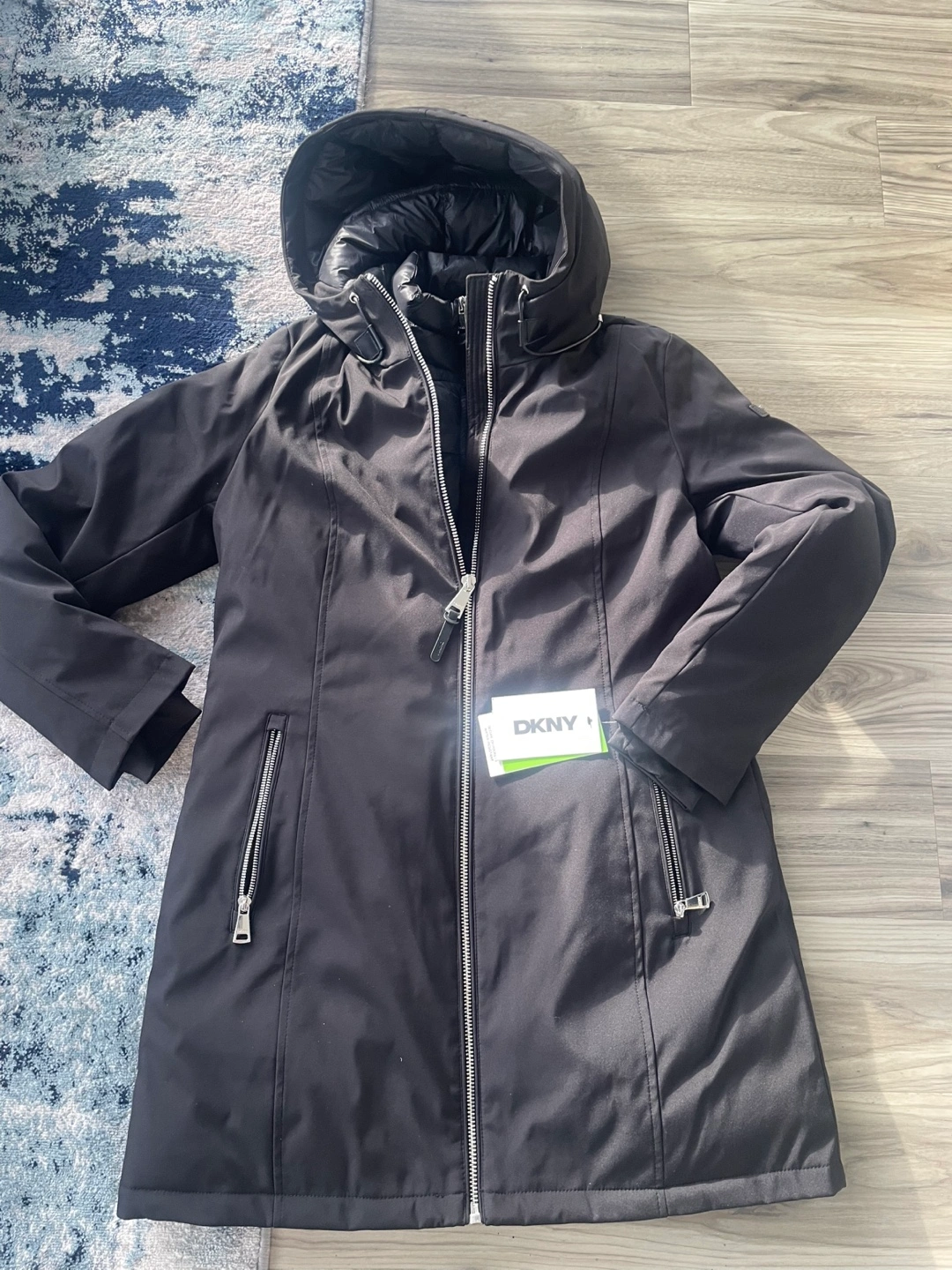 73Long-sleeved hooded jacket. Features an inner vest. Zipper closure. Two pockets. Great for winter weather. Mid Length Brand new tags still on