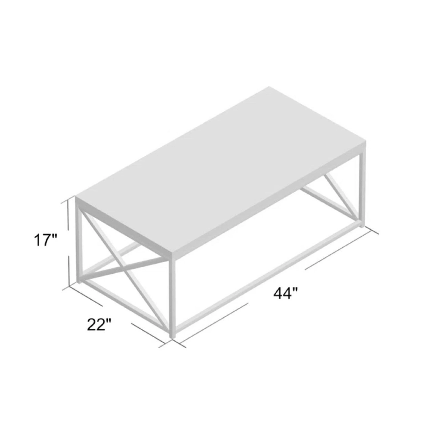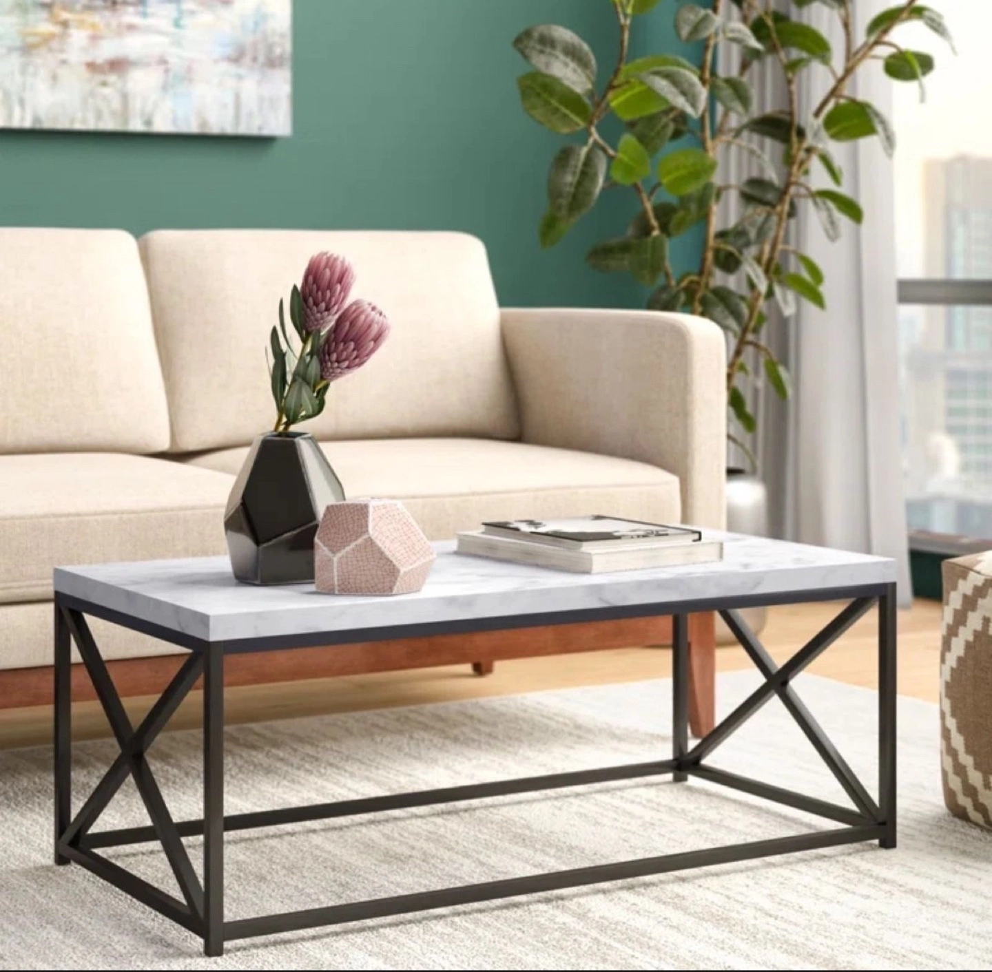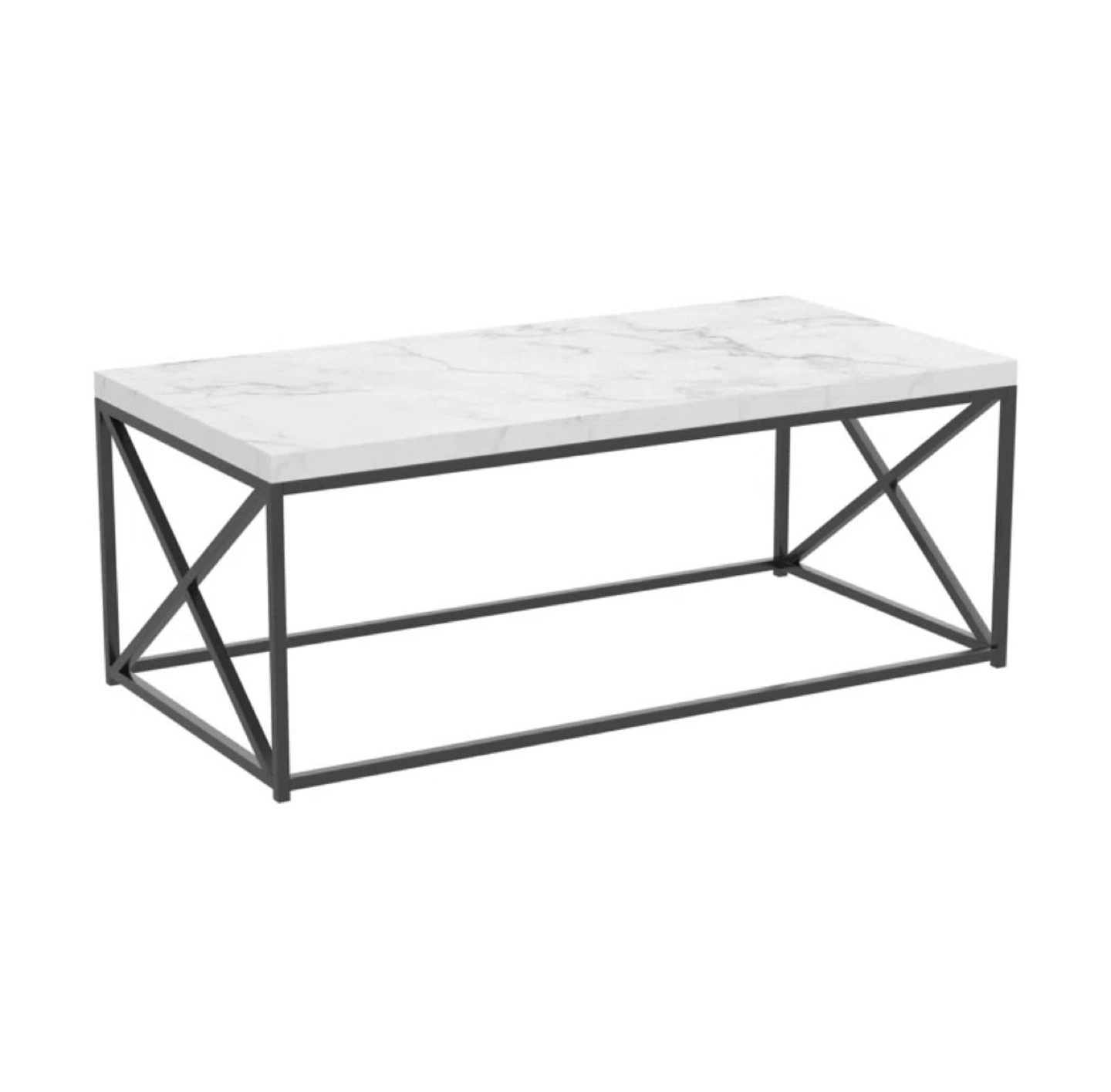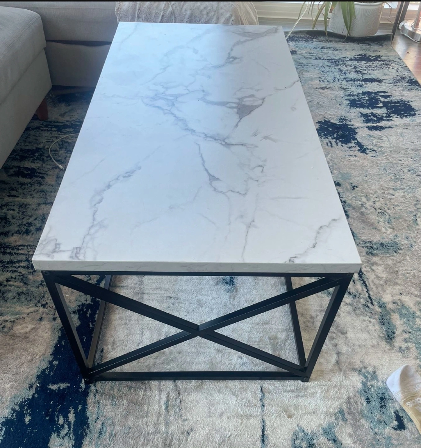 73Stylish coffee table. Features a white marble top and black metal frame. Perfect for living room. Good condition. Measures 44"L x 22"W x 17"H.