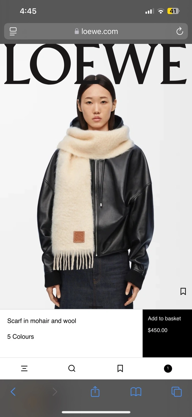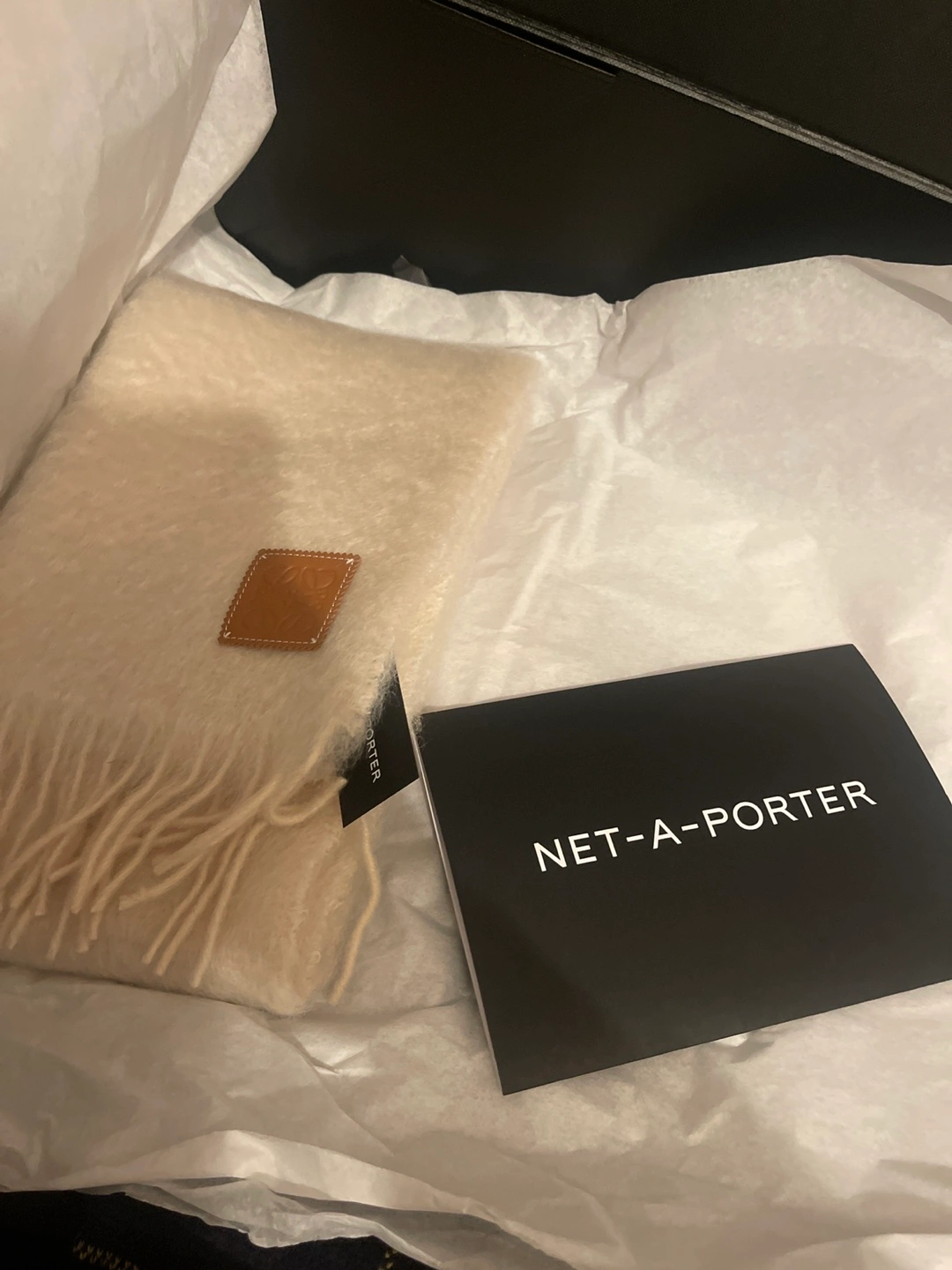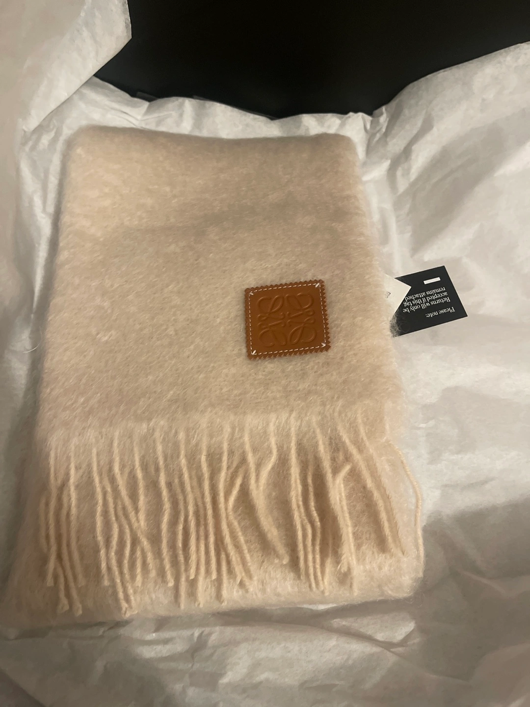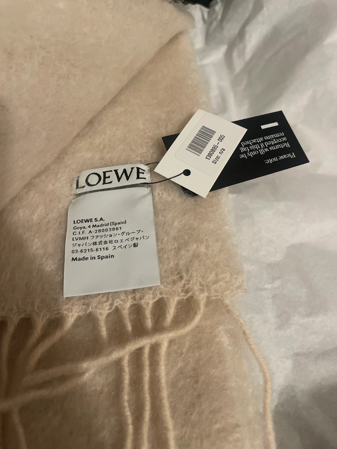 352Bought it for $450+tax. Very good deal. Cream colored Loewe scarf. Mohair and wool blend. Fringe detail. Purchased from Net-a-Porter. Brand new with tags.