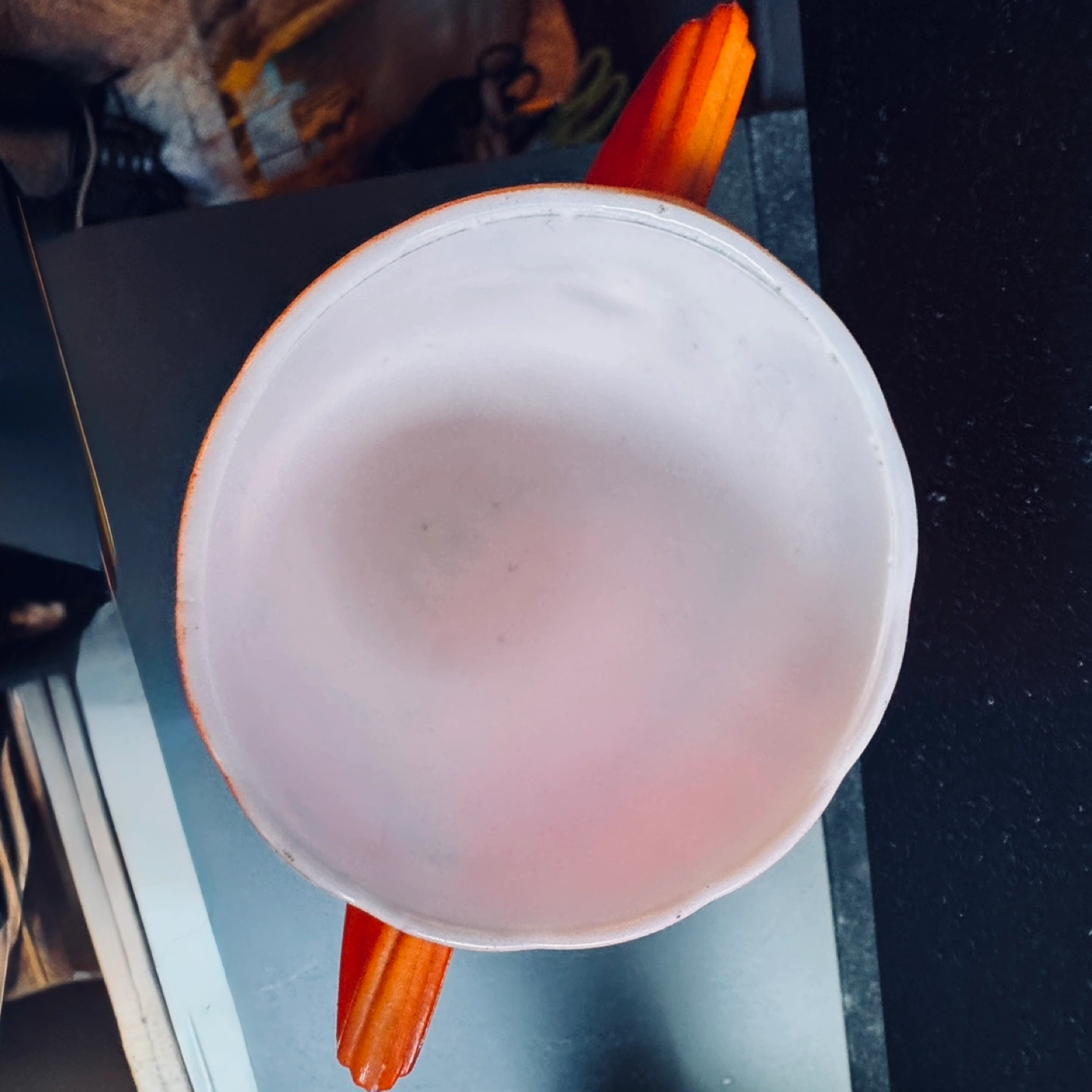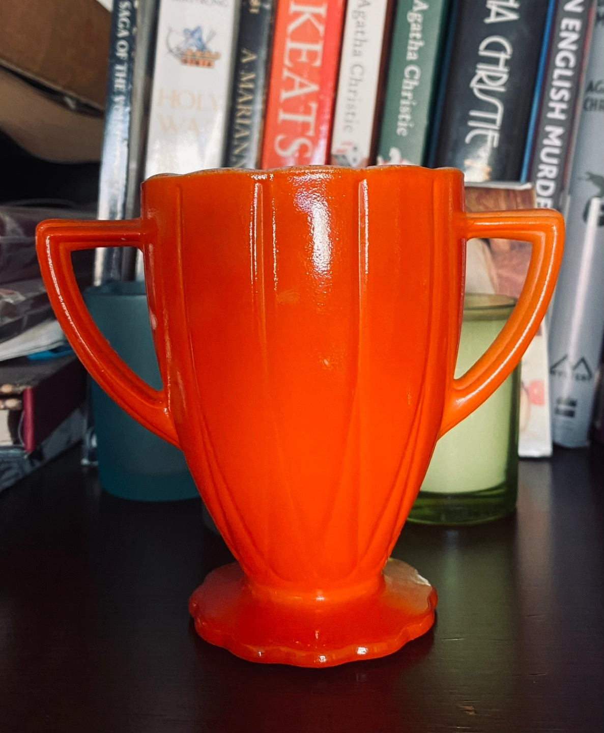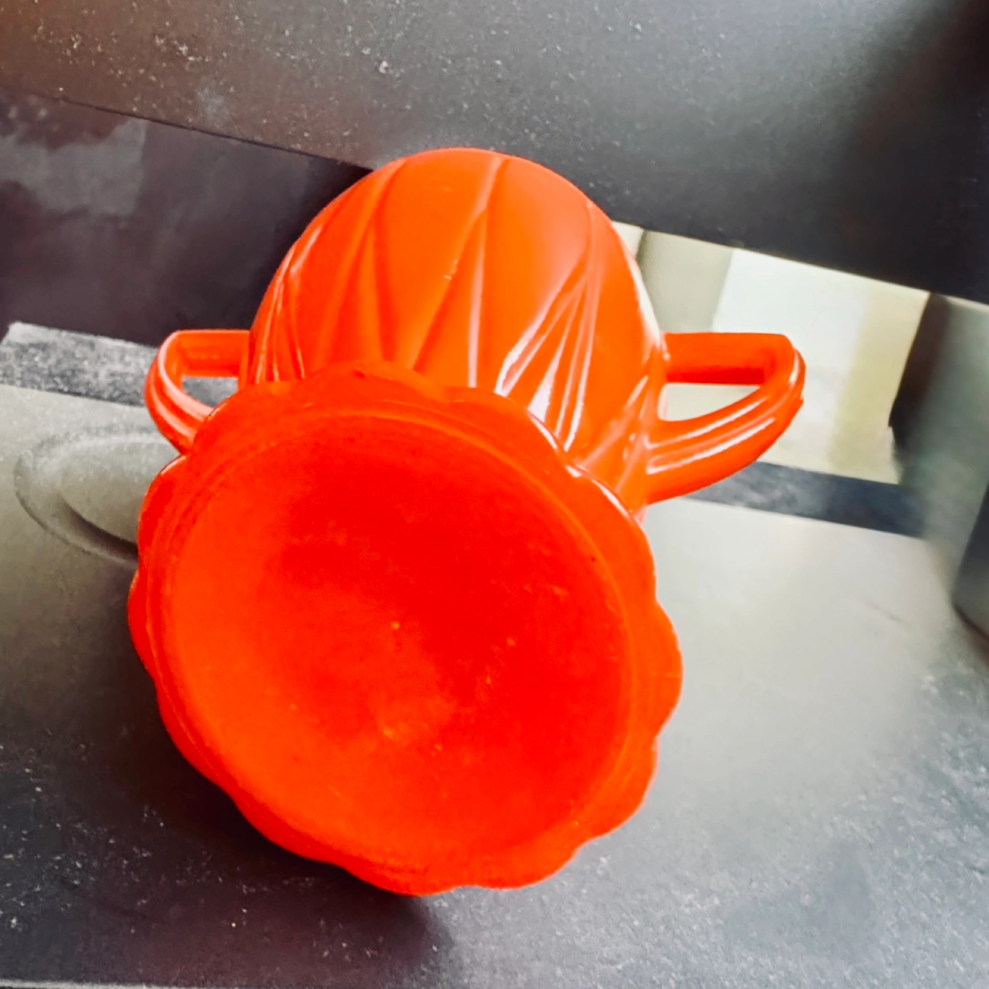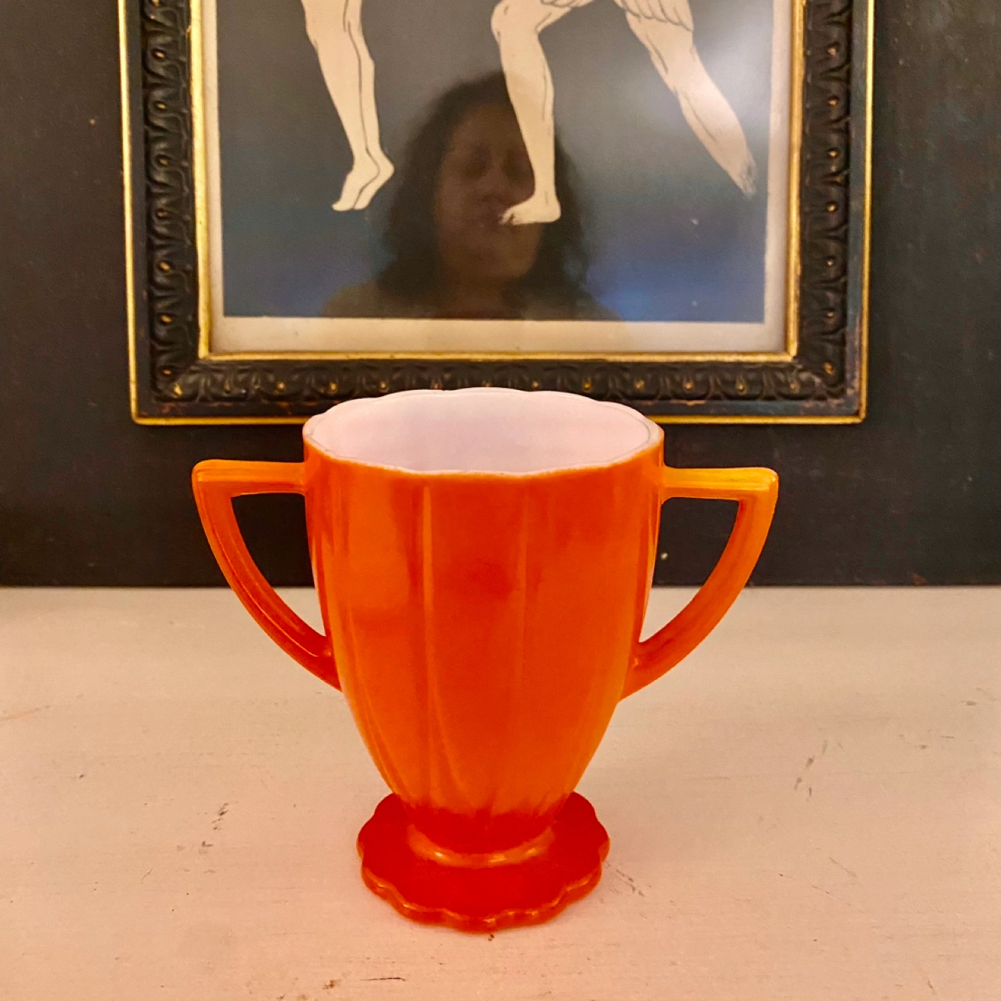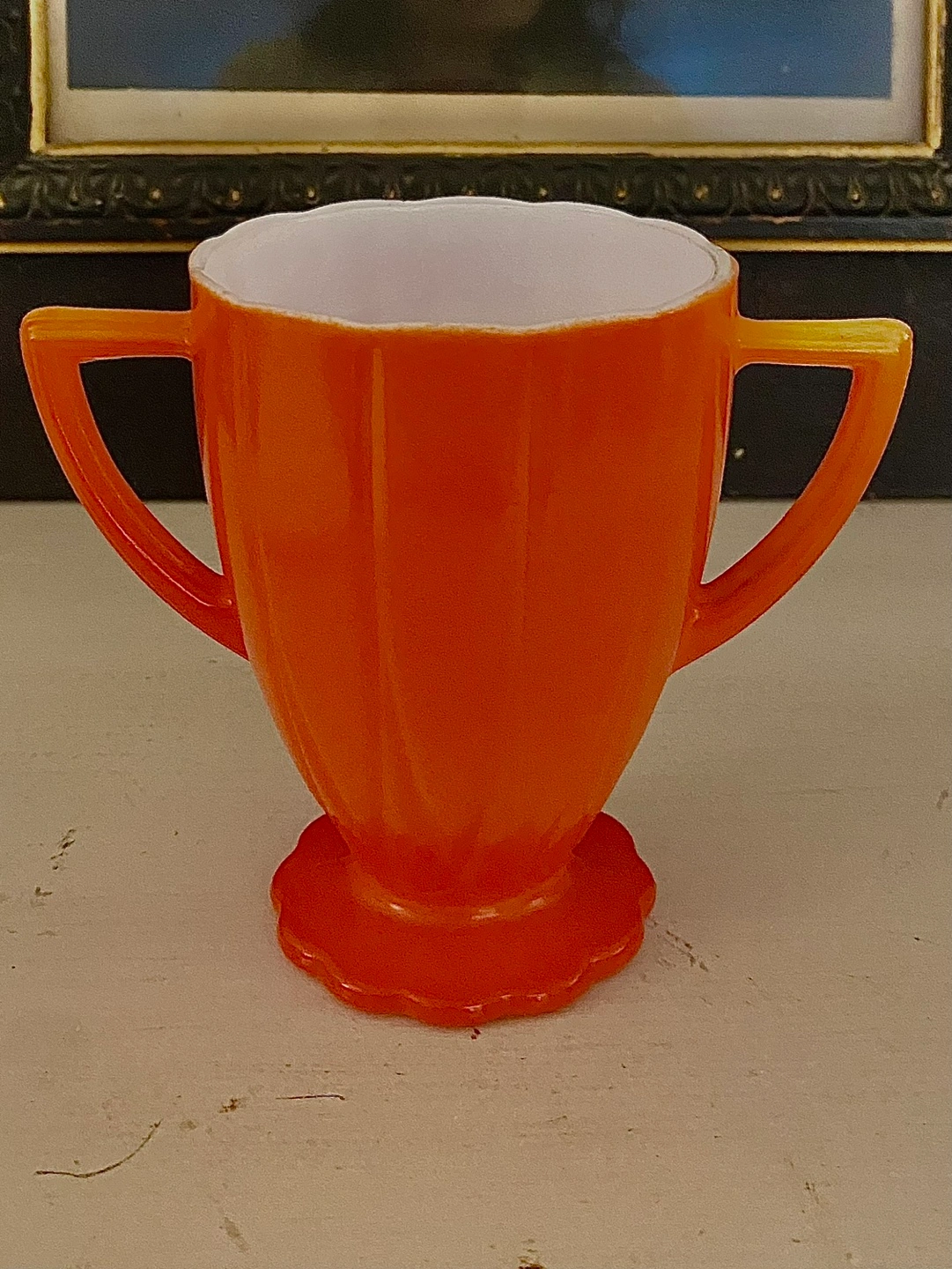 441Vintage Hazel Atlas Newport/hairpin Bright Orange open sugar bowl. Orange glass with fluted design. Two handles. White interior. Small size, perfect for a creamer or sugar bowl. Feel free to ask questions. If it’s hard to come to my place, we can arrange a meeting point. It looks like new. Some faint smudges inside.