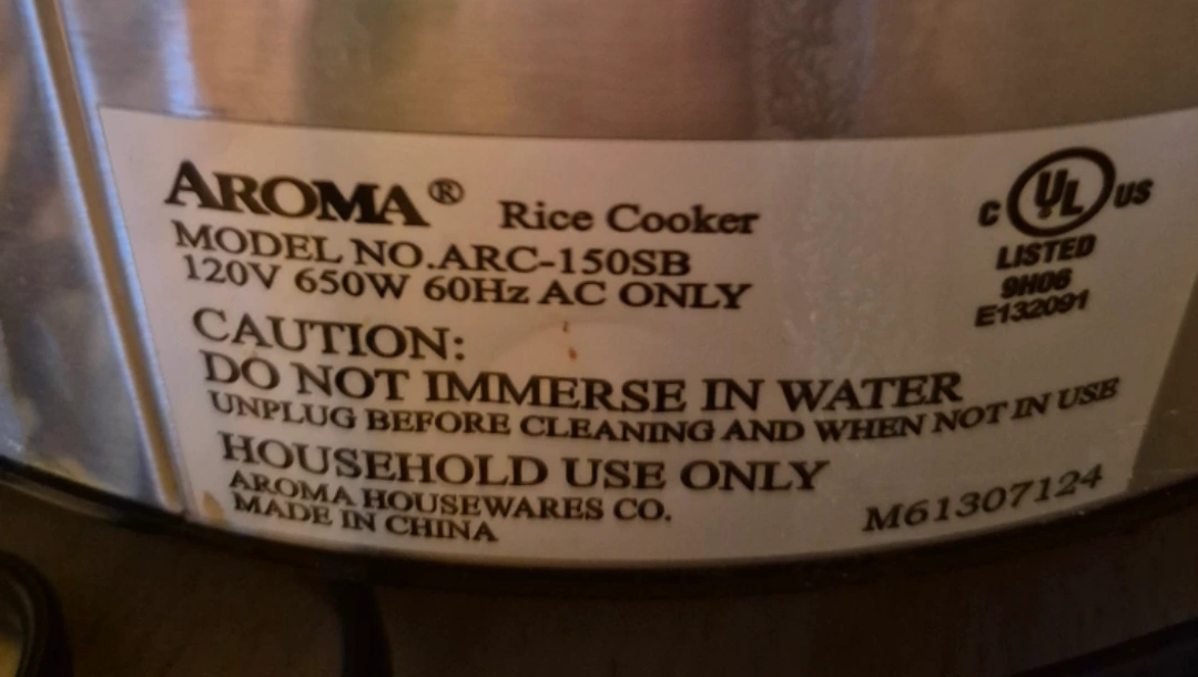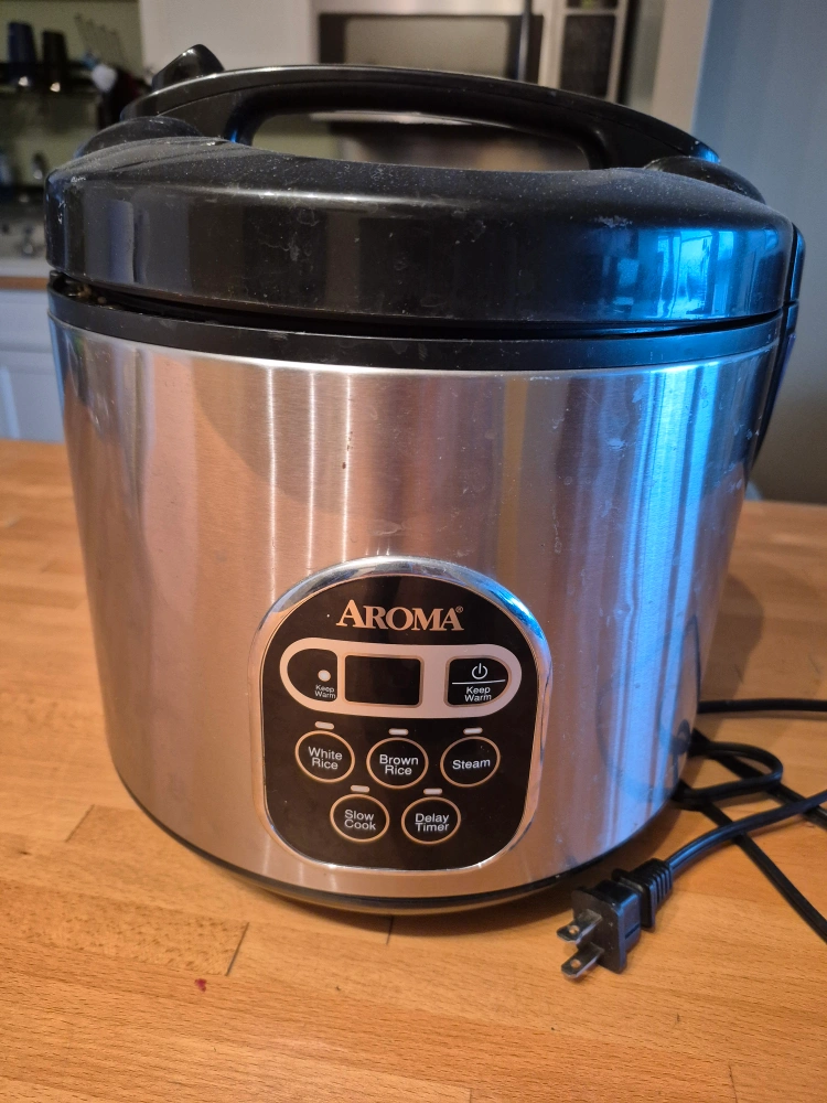 Stainless steel rice cooker. Multiple functions: white rice, brown rice, steam, slow cook, and delay timer. Includes power cord. Model ARC-150SB.