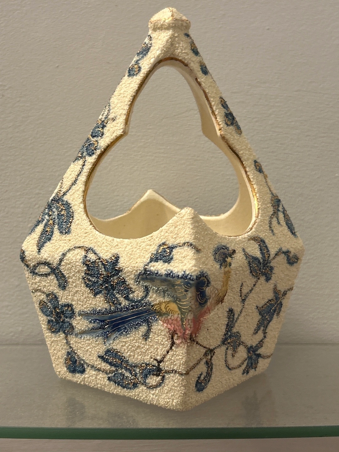 Unique vintage porcelain basket. Features a textured surface, gold accents, and hand-painted birds and floral details. Cream-colored base with blue and gold accents. Small, decorative item.