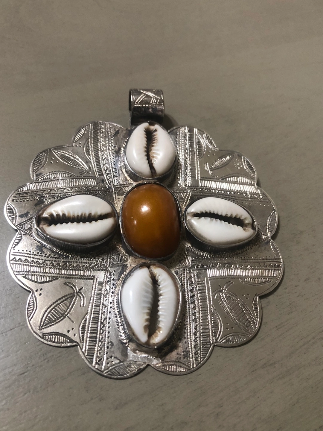 23Ornate silver pendant. Features five cowrie shells and an amber stone. Intricate detailing. Unique design.