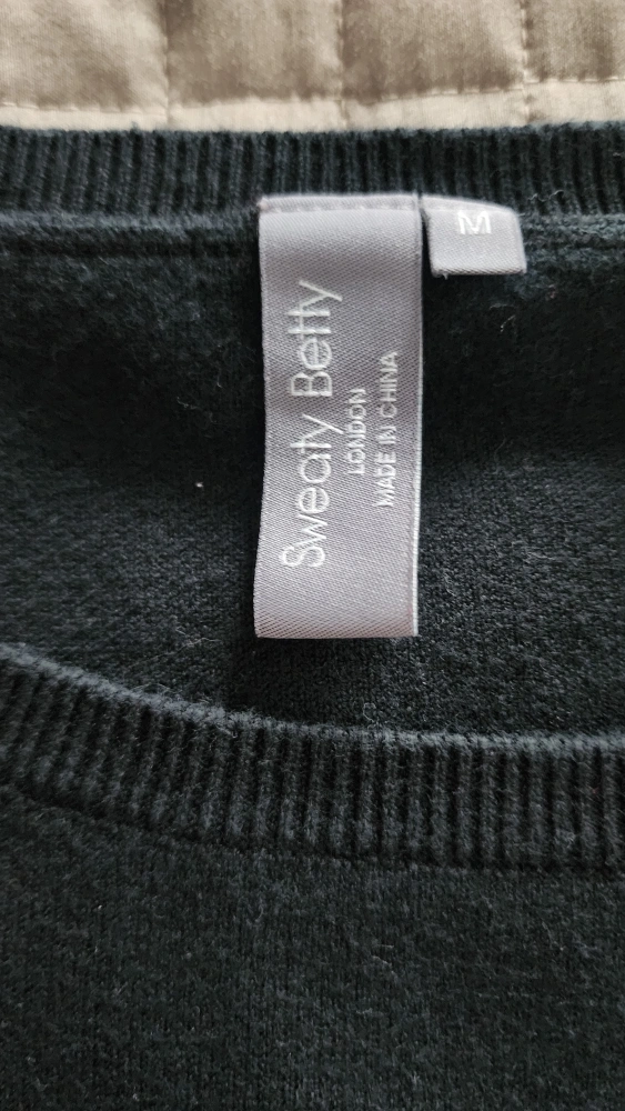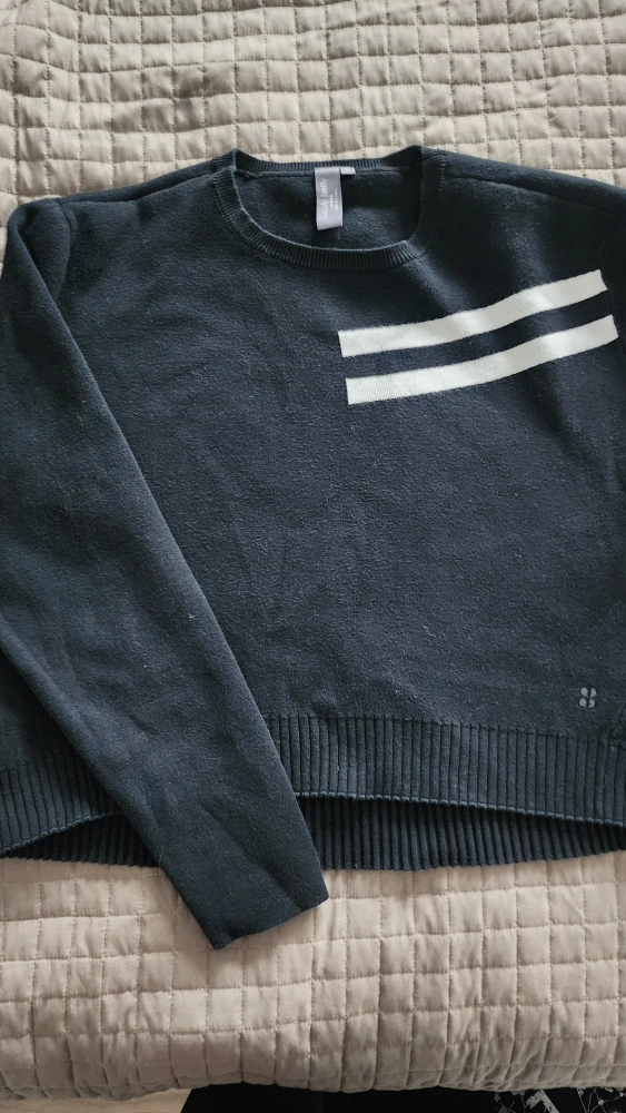 Black cropped sweater. Features white stripes on the upper right side. Medium size. Long sleeves. Crew neck.