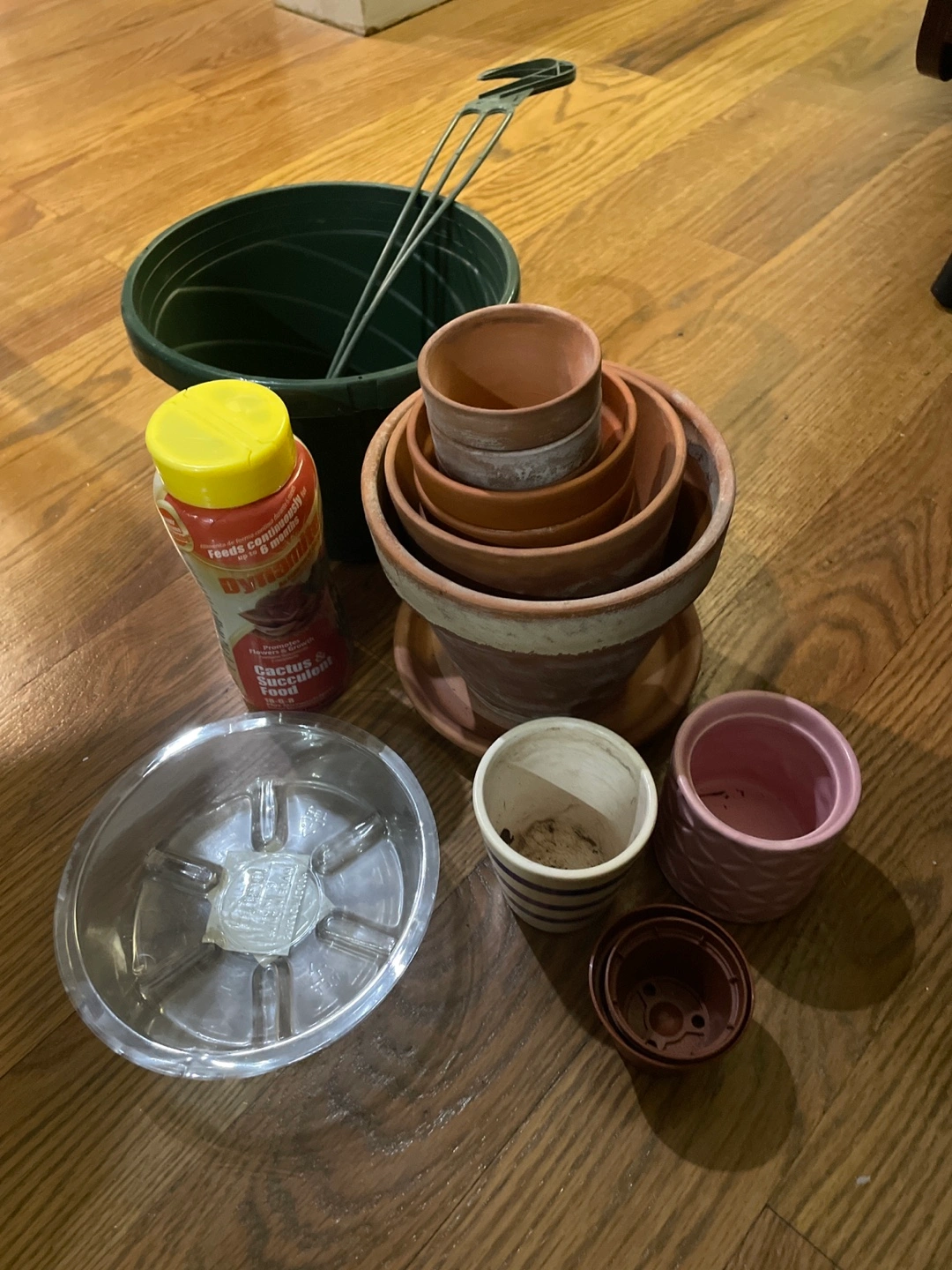Collection of terracotta pots and planters, various sizes, styles, and quality. Includes saucers, succulent and cactus food, and a hanging planter. Message for any questions.