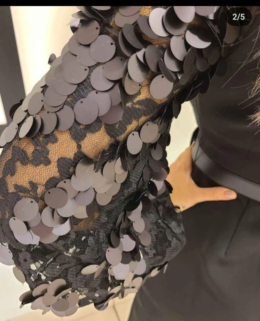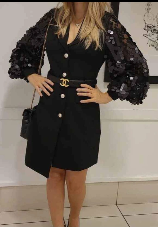 Elegant black mini dress. Sequin and lace detail on sleeves. Button front. Asymmetrical hem. Great for a night out.
