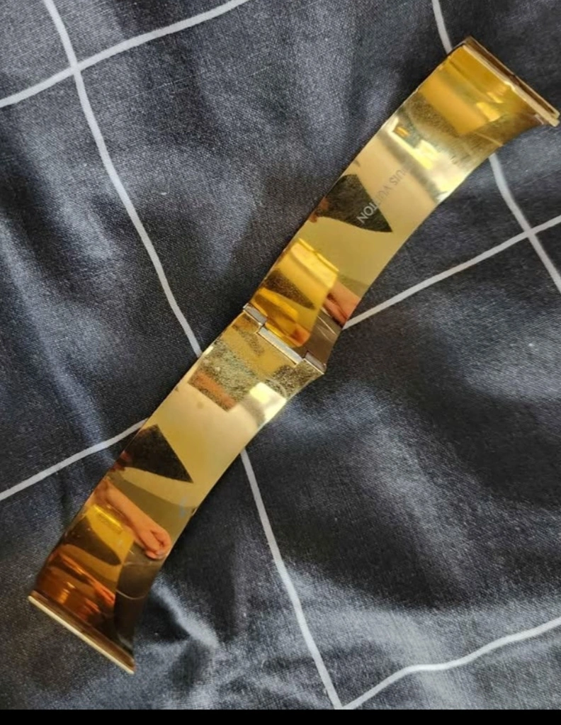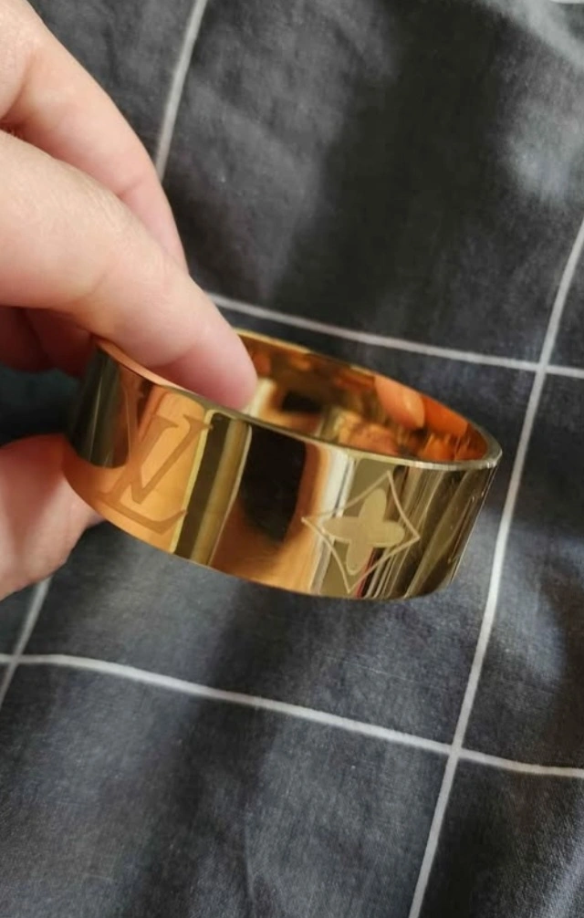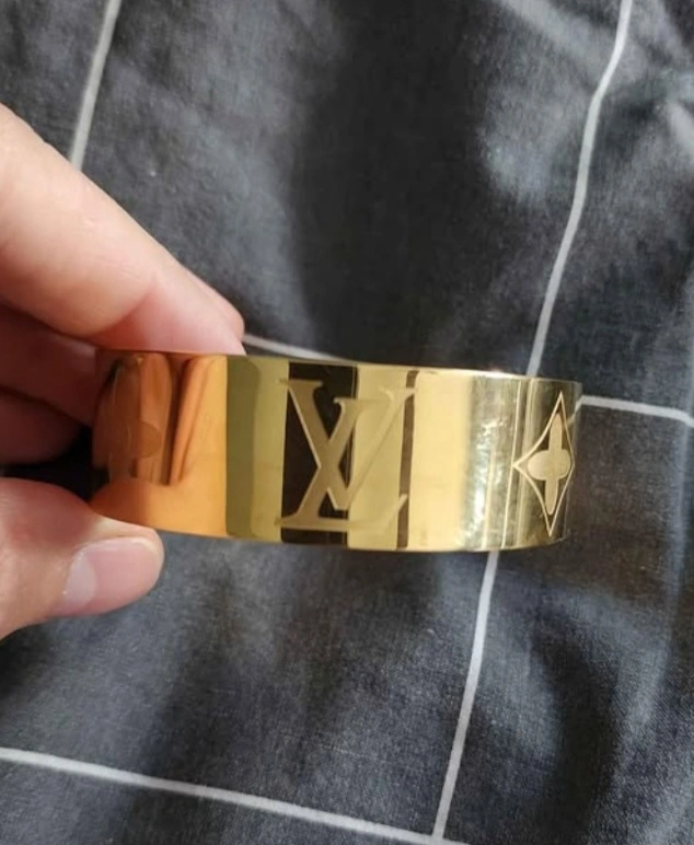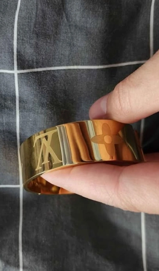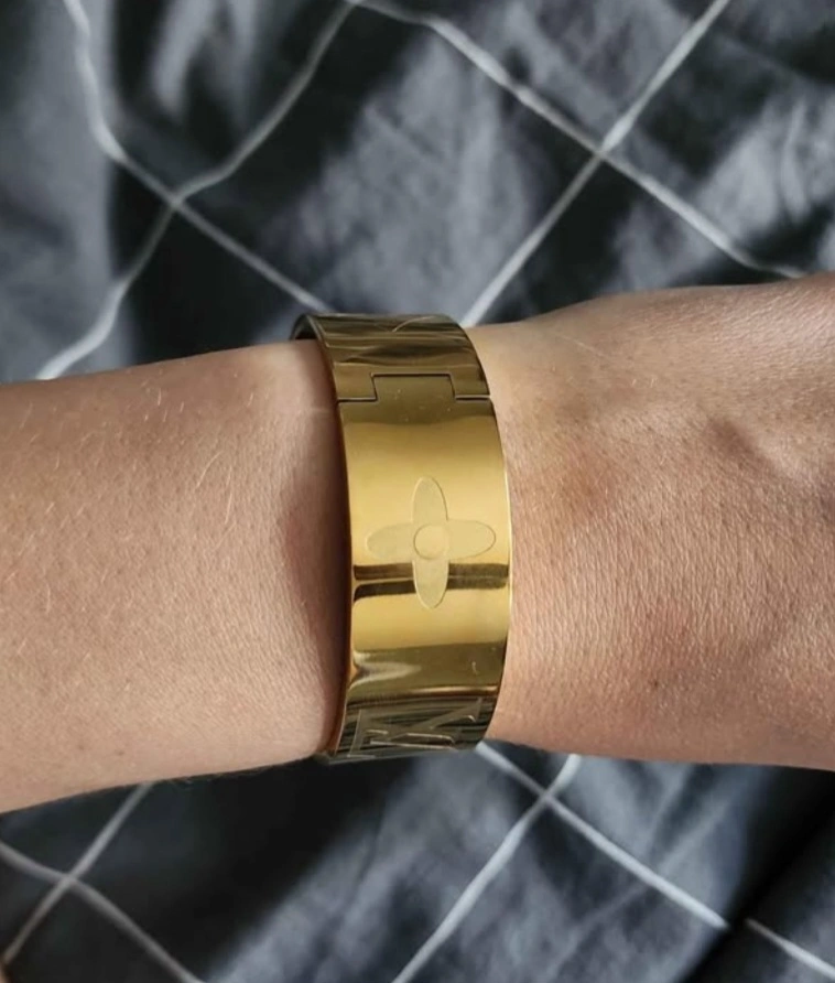 Gold-tone metal bracelet. Features Louis Vuitton-inspired logo. Hinged closure. Stylish accessory.
