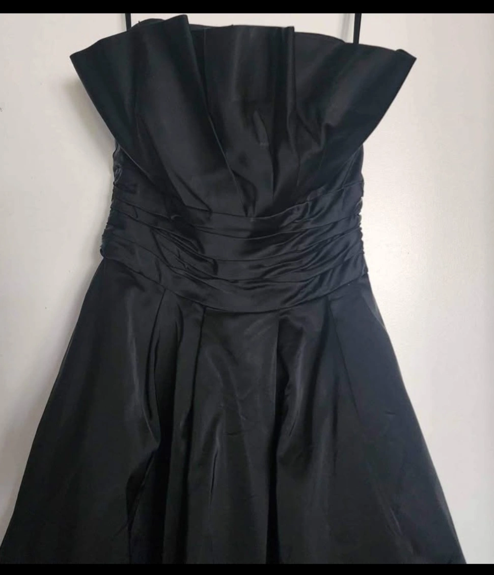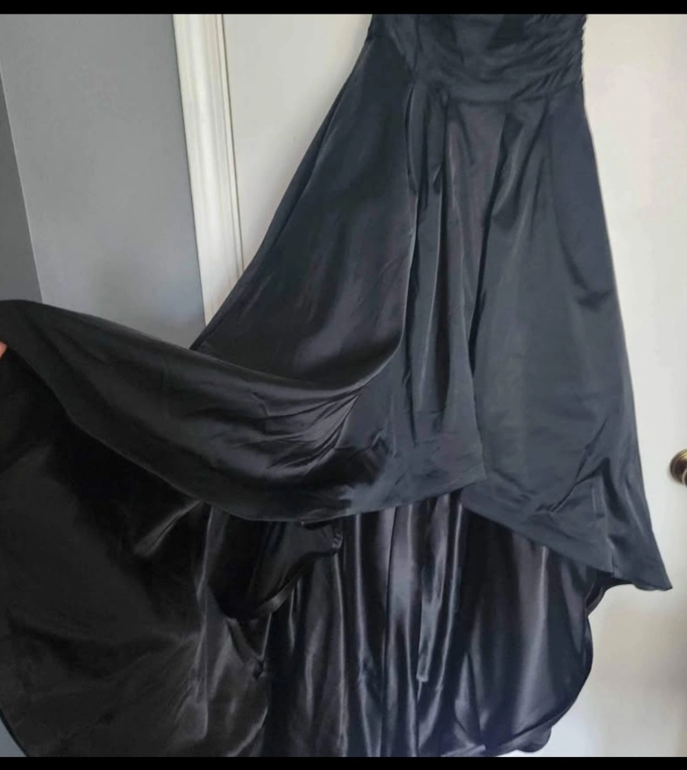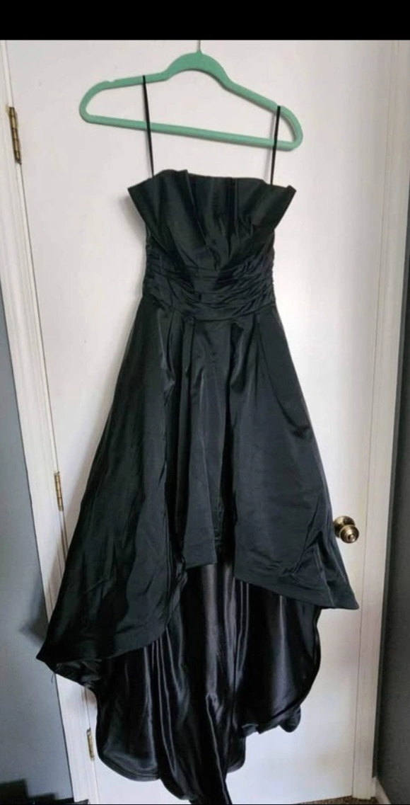 Beautiful black formal dress. Strapless, high-low hemline. Size 4. Made of satin-like material. Elegant and flattering style. Perfect for prom, wedding, or special occasion.