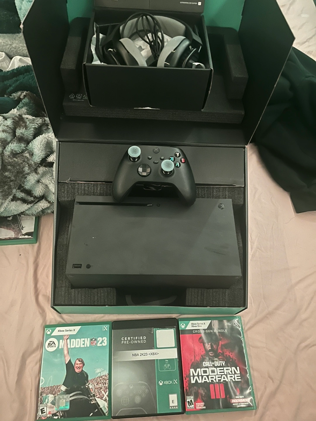 70Xbox Series X console, Astro A10 gaming headset, and three Xbox Series X games: Madden NFL 23, NBA 2K23, and Call of Duty Modern Warfare II. Includes controller. Great gaming setup. Firm on price not looking for trades but hit me up