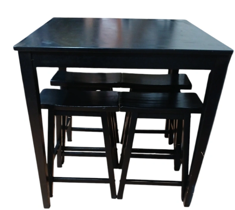 pub table set, four stools, black finish table is counter/bar height. The table was used as computer desk as you will see on the photos it have a little hole were wires past by you just put a table cover over it.