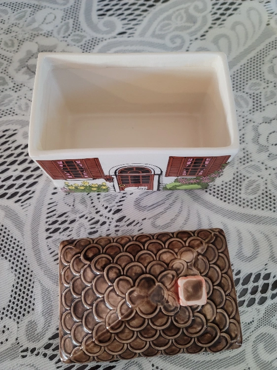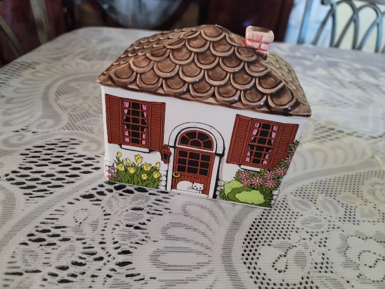18Adorable vintage trinket box. House design. Brown roof and white walls. Small cat on the front porch. Opens from the top. Copyright 1980. made in japan cash and pick up only