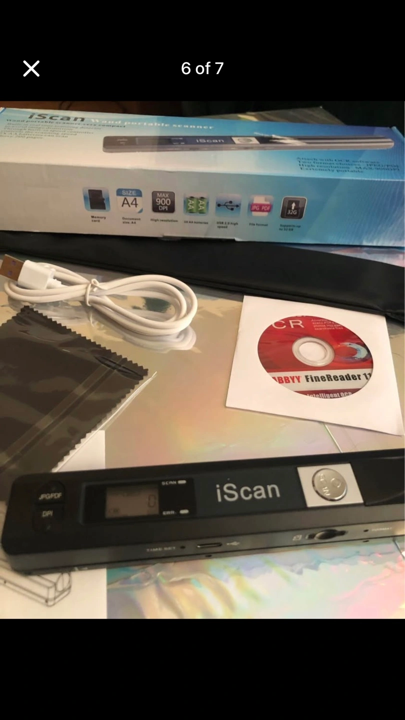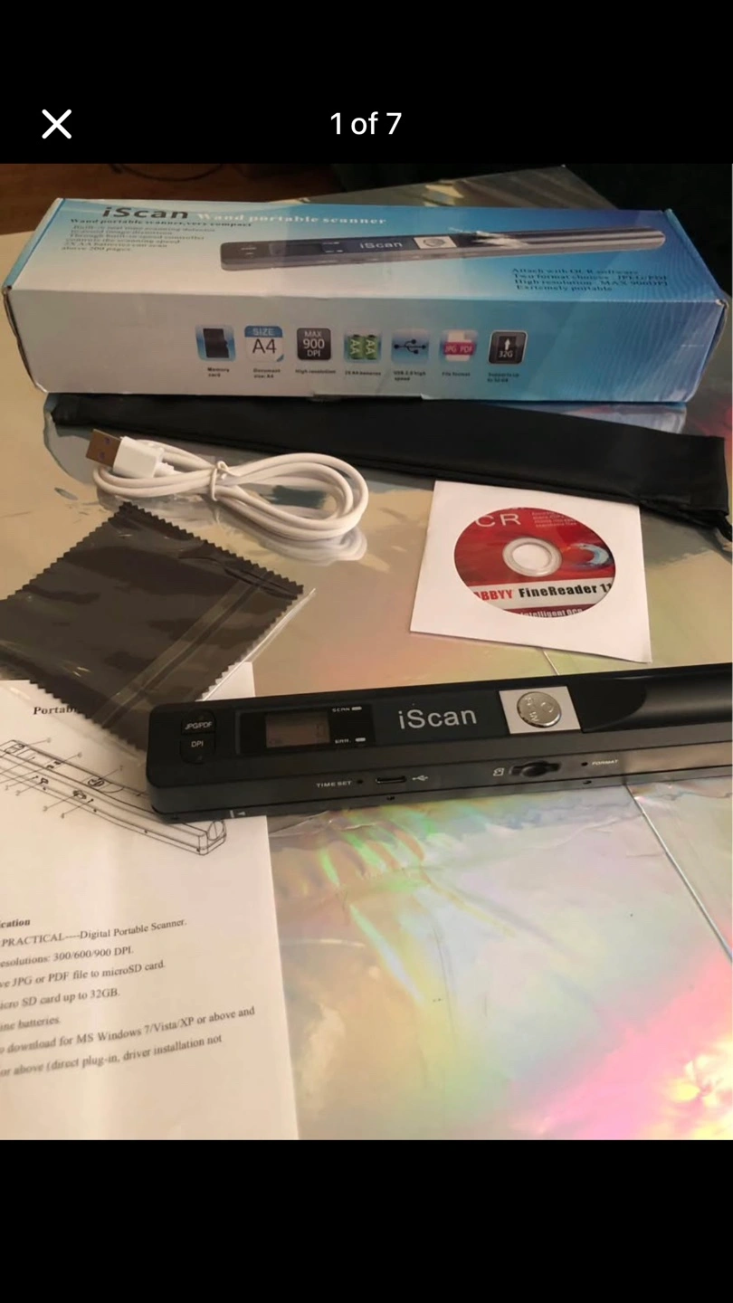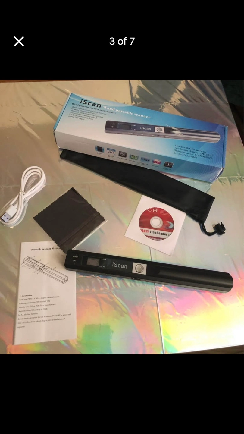 MGbeauty iScan portable scanner. Scans documents. Includes USB cable, cleaning cloth, software CD, and carrying pouch. A4 size.