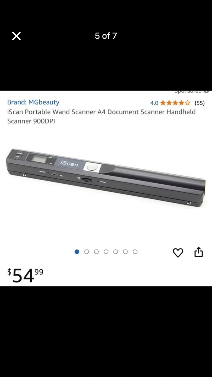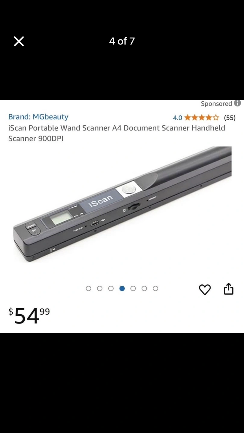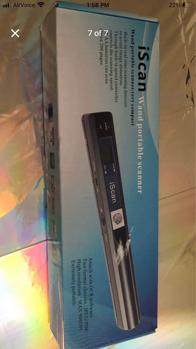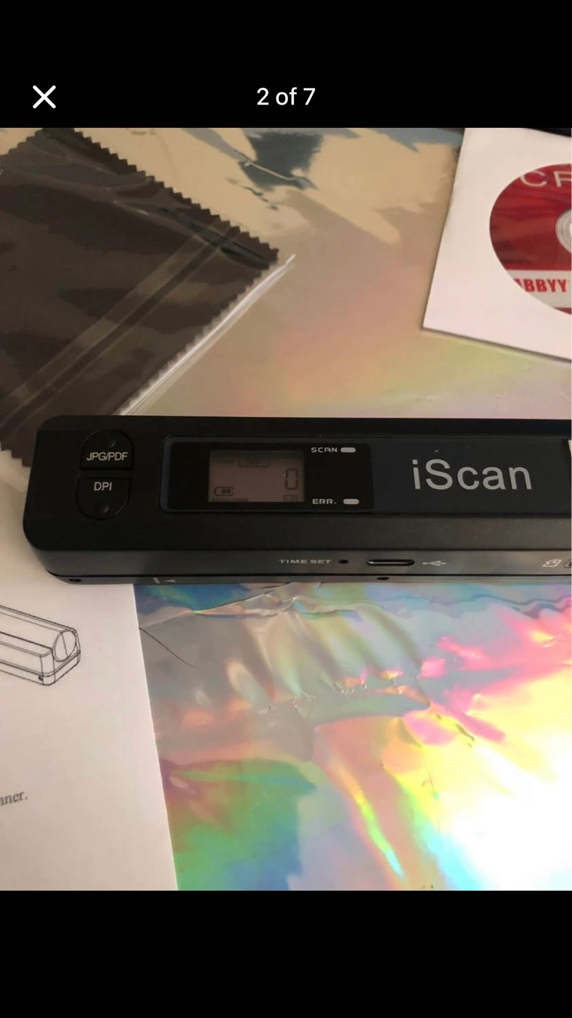 MGbeauty iScan portable scanner. Scans documents. Includes USB cable, cleaning cloth, software CD, and carrying pouch. A4 size.