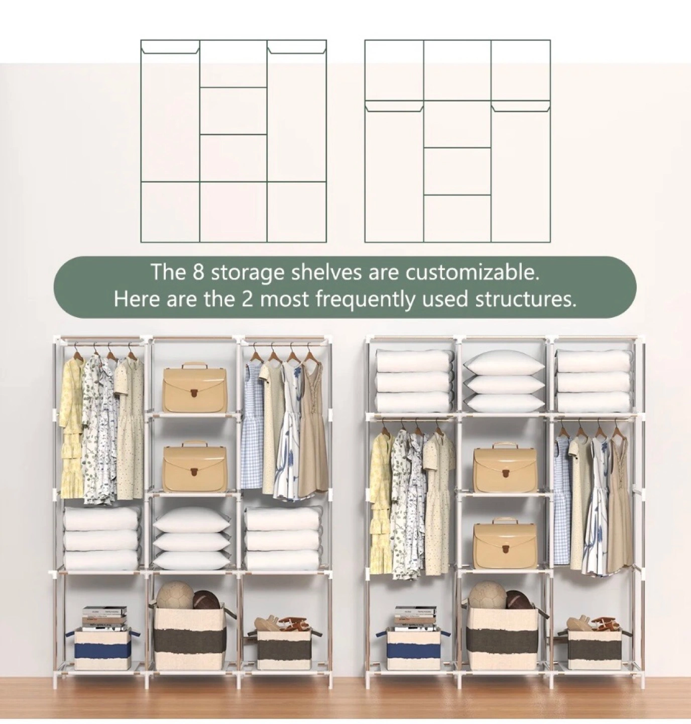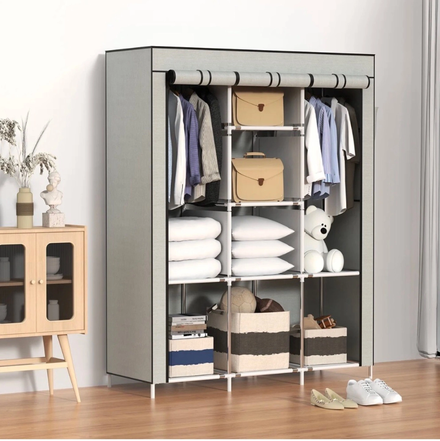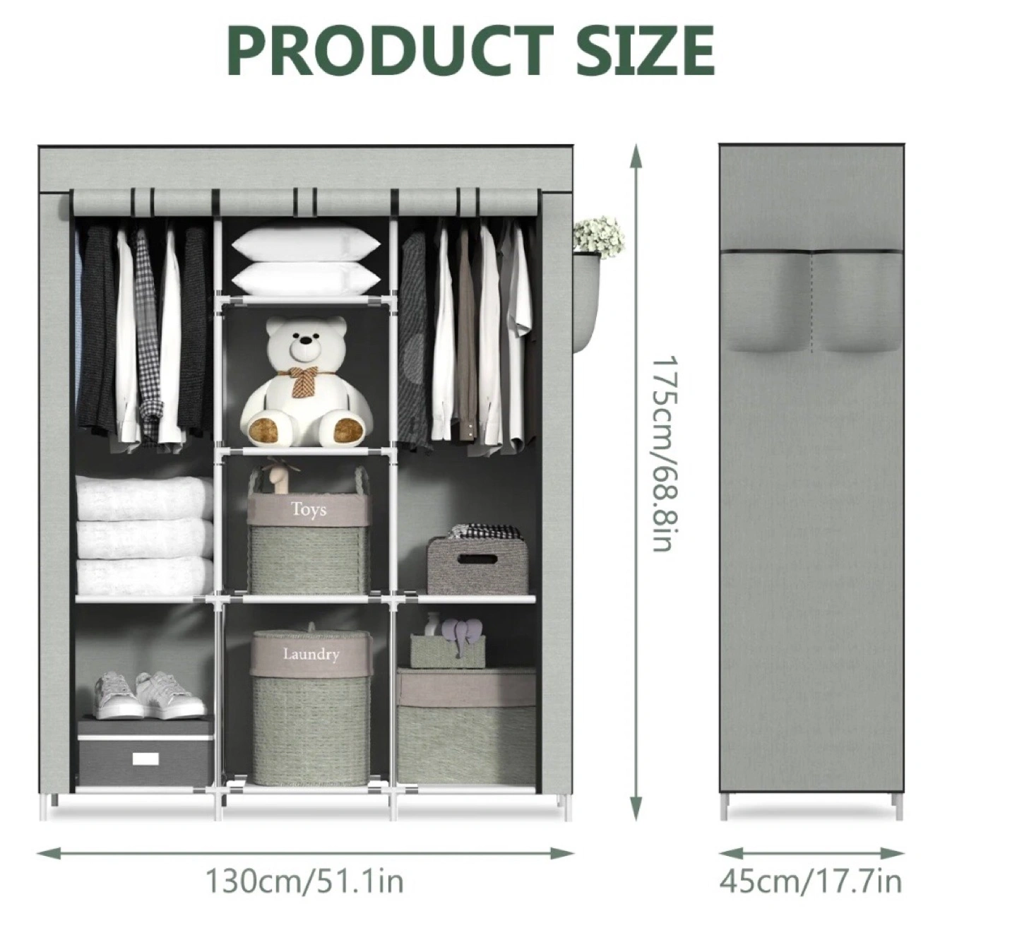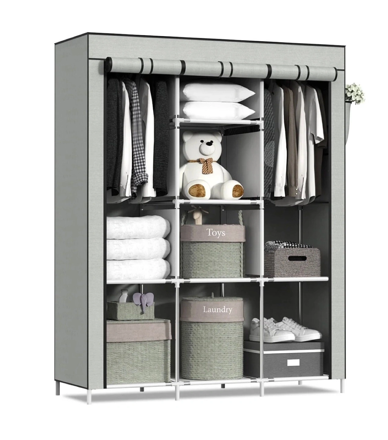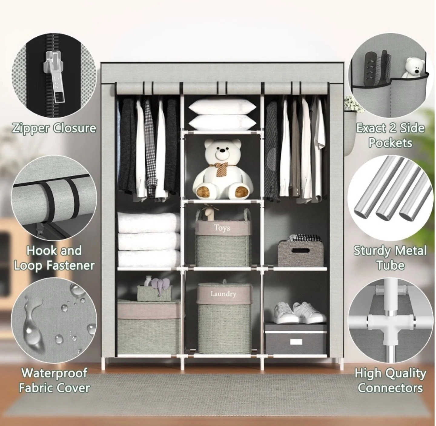 Grey fabric wardrobe closet organizer. Sturdy metal frame. Multiple shelves and hanging rods. Zipper closure and side pockets. Waterproof fabric cover. Easy assembly. Great for clothes, shoes, toys, and more.