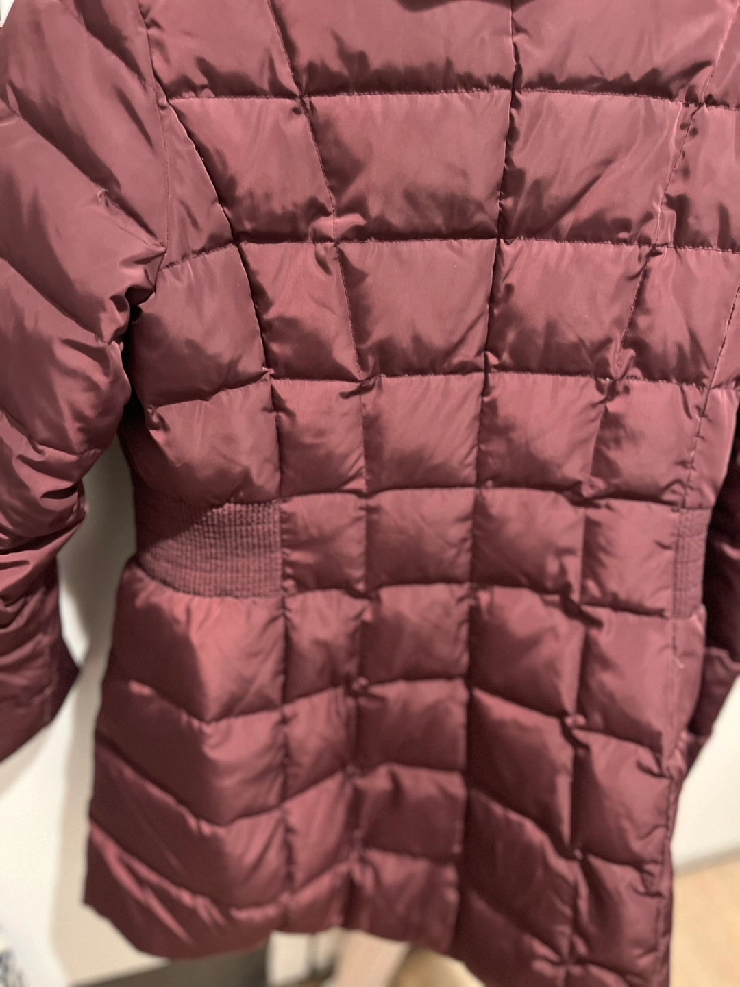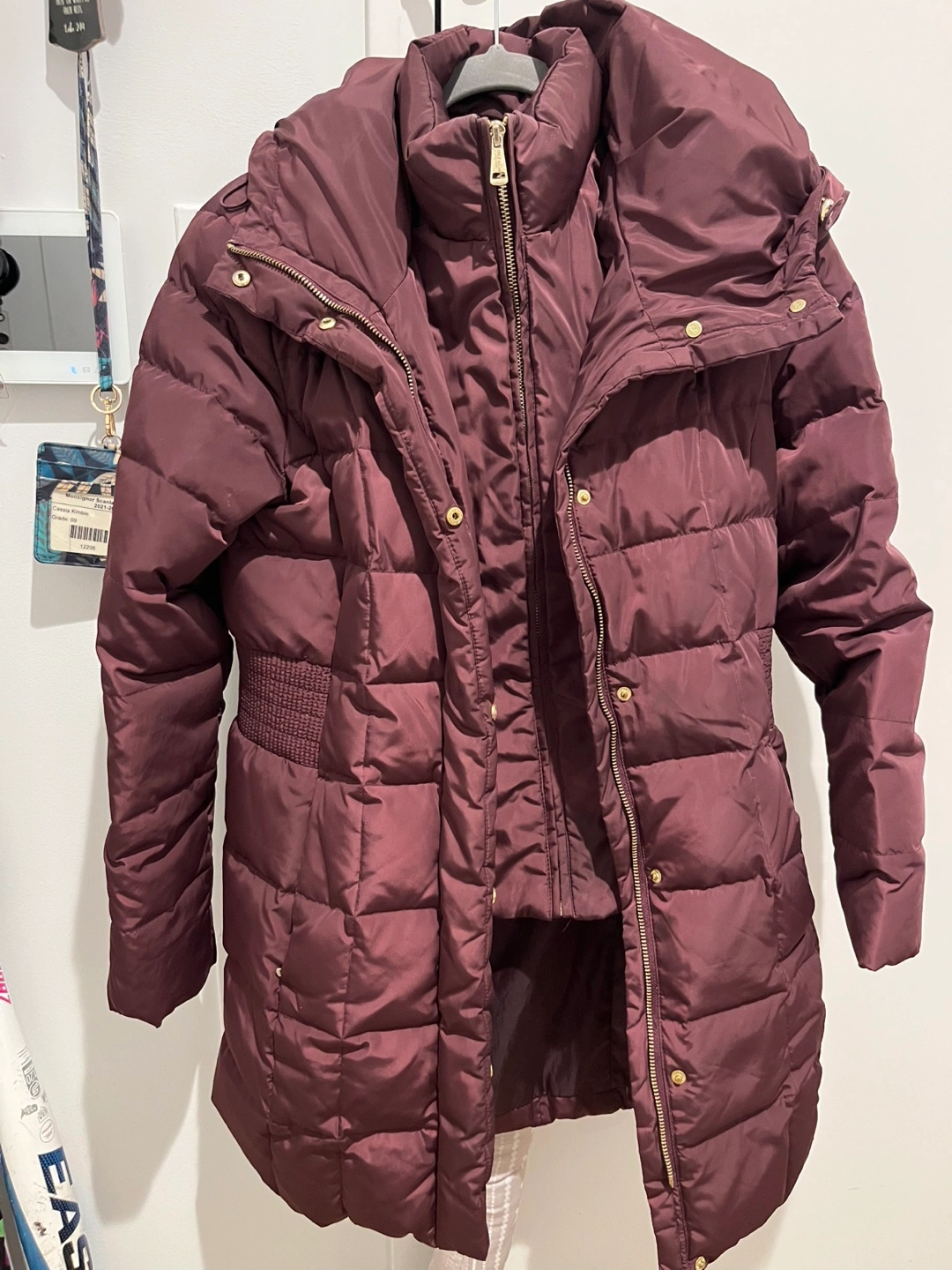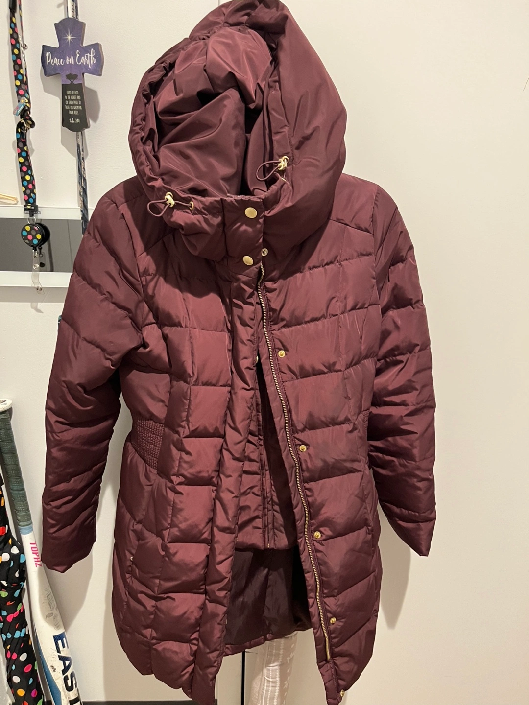 Warm winter coat. Burgundy color. Long sleeves. Hooded. Zipper and snap closure. Belted, elastic sides for added room. Good condition.