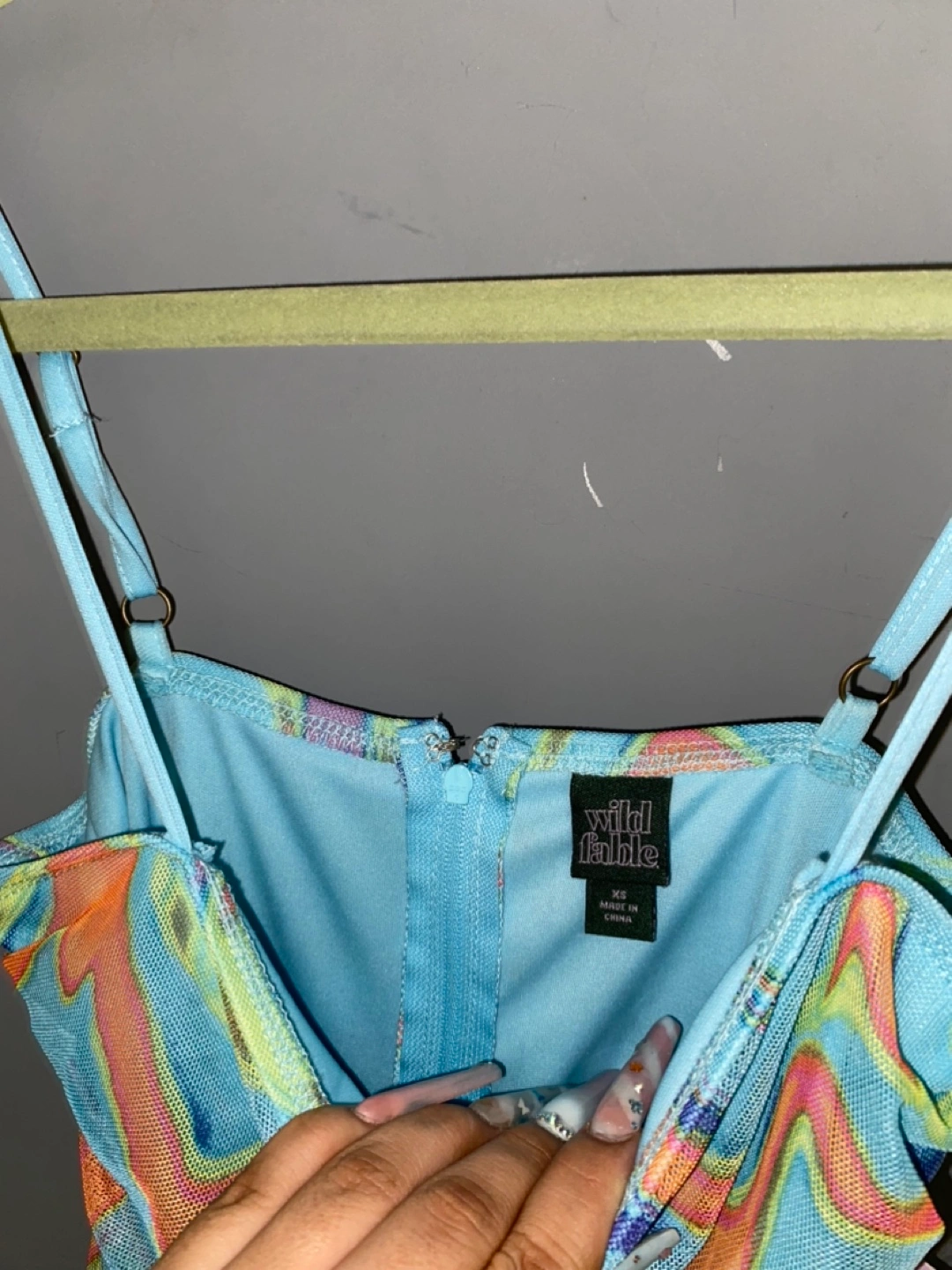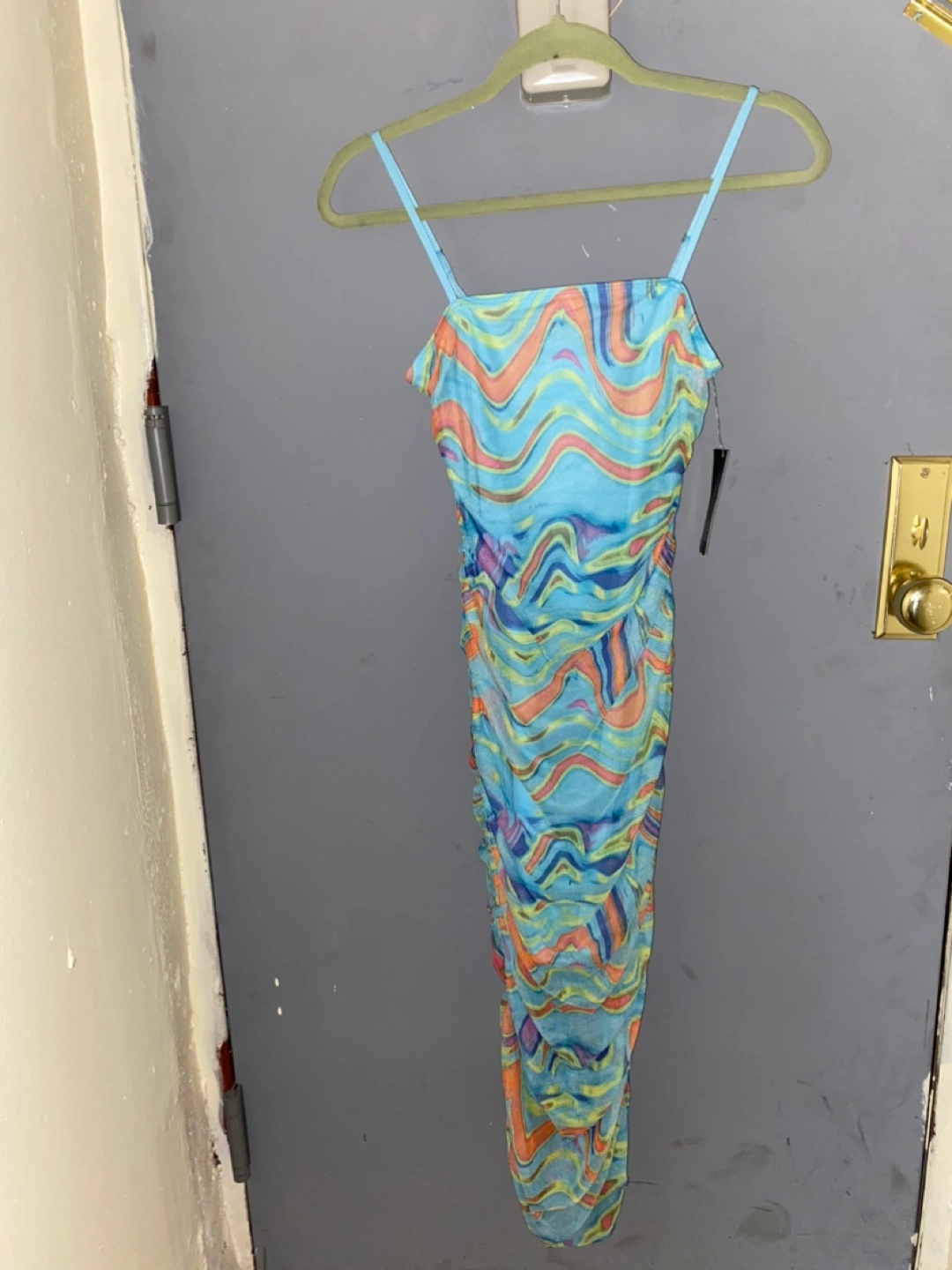 Beautiful blue maxi dress. Mesh material. Abstract print. Size XS. Spaghetti straps. Back zipper.