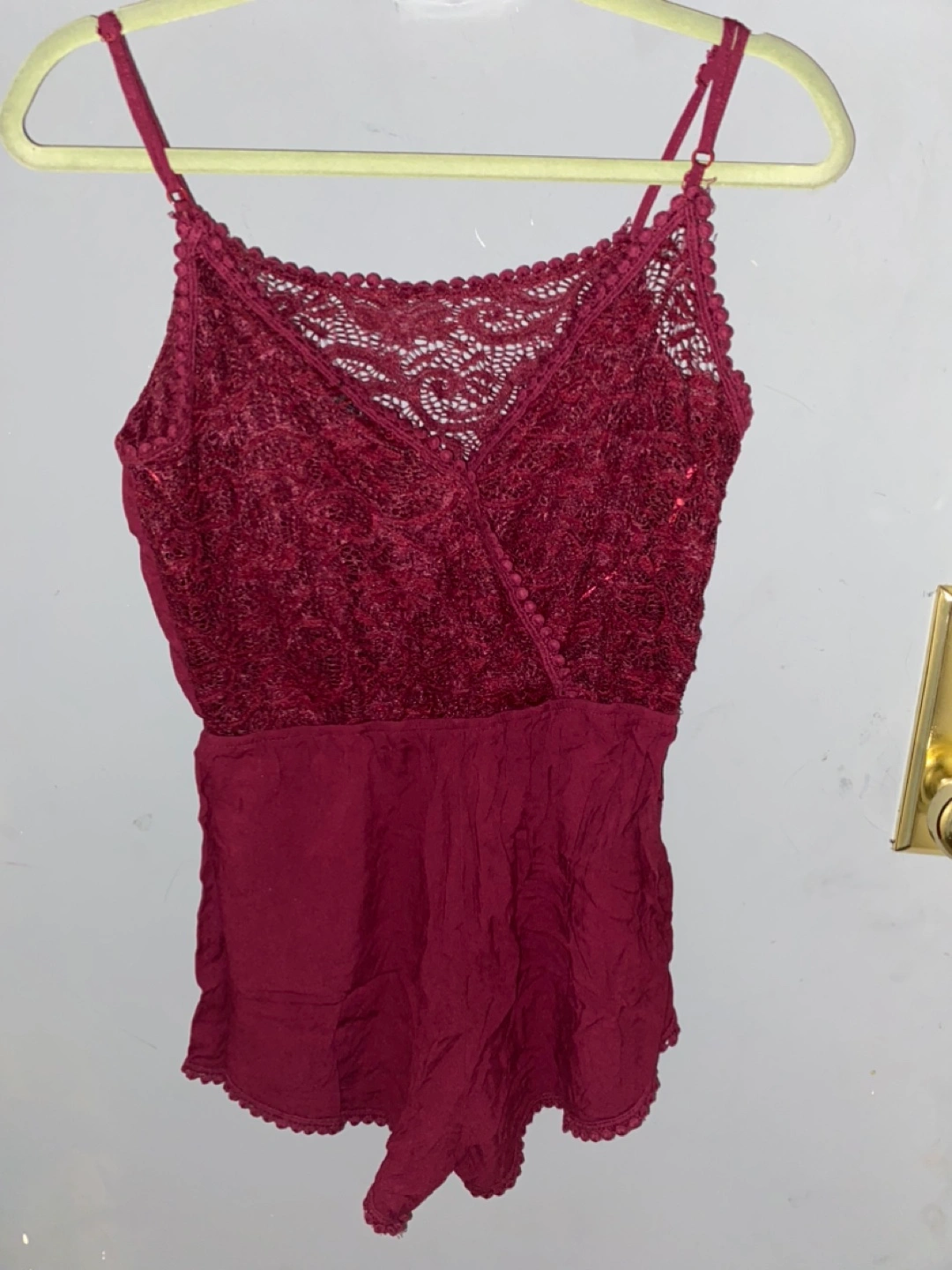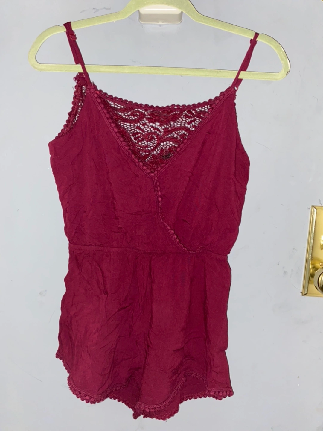 Women's burgundy romper. Features delicate lace detailing at the top and a relaxed fit. Adorable and perfect for summer.