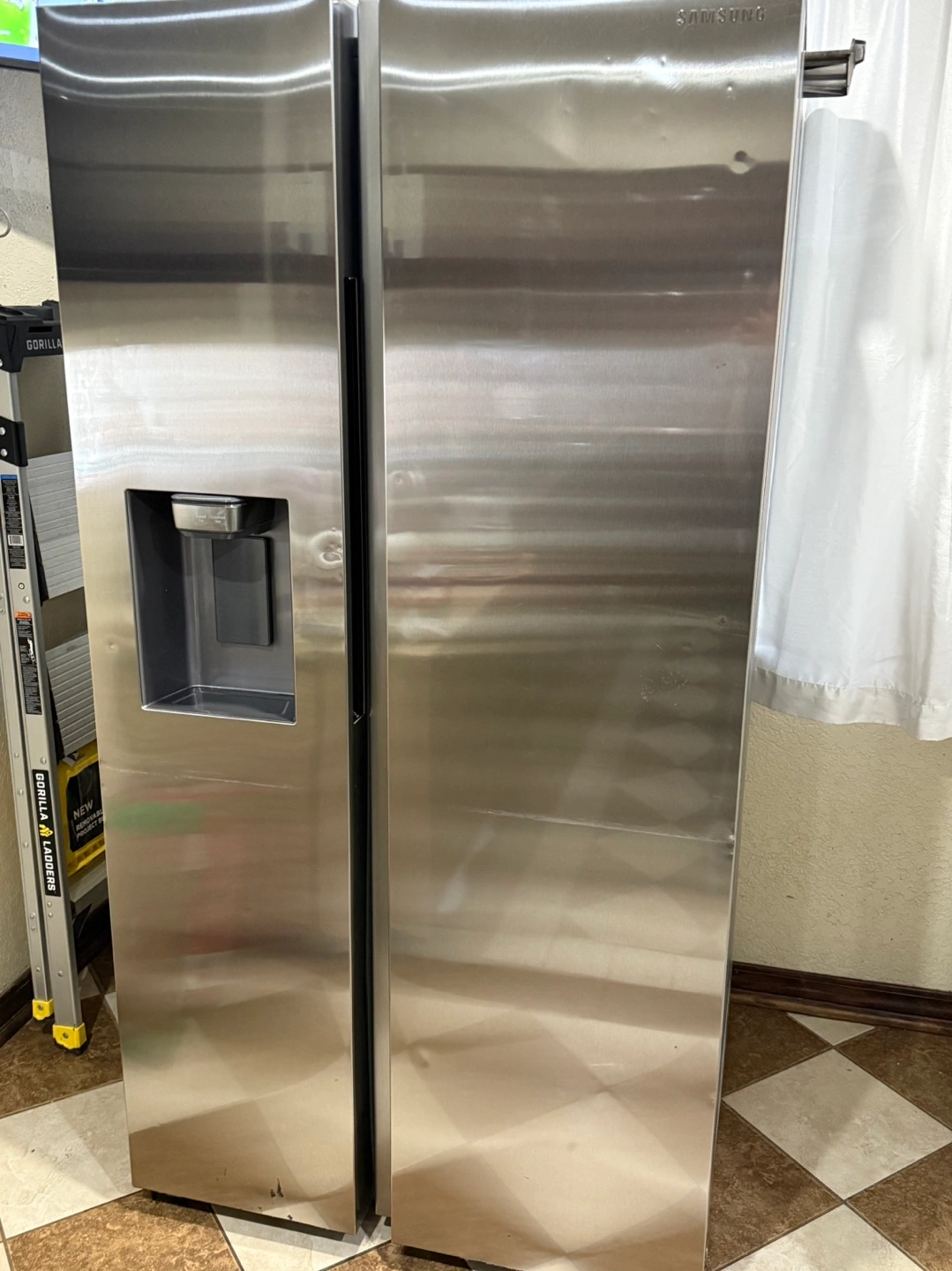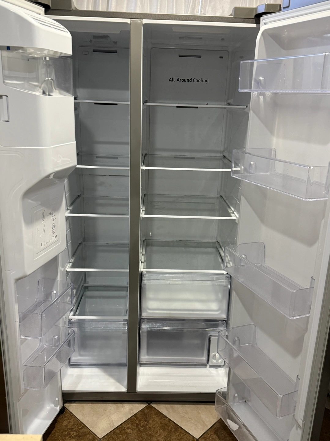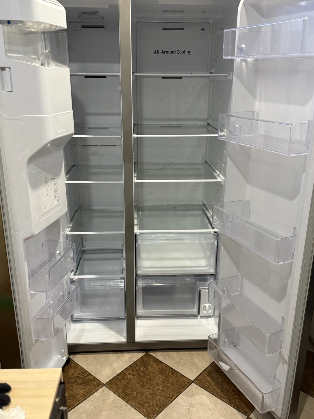 Stainless steel French door refrigerator. Ice and water dispenser. Multiple shelves and drawers. All-around cooling.