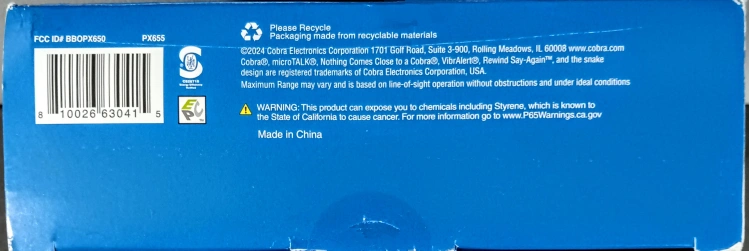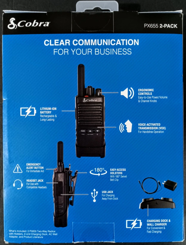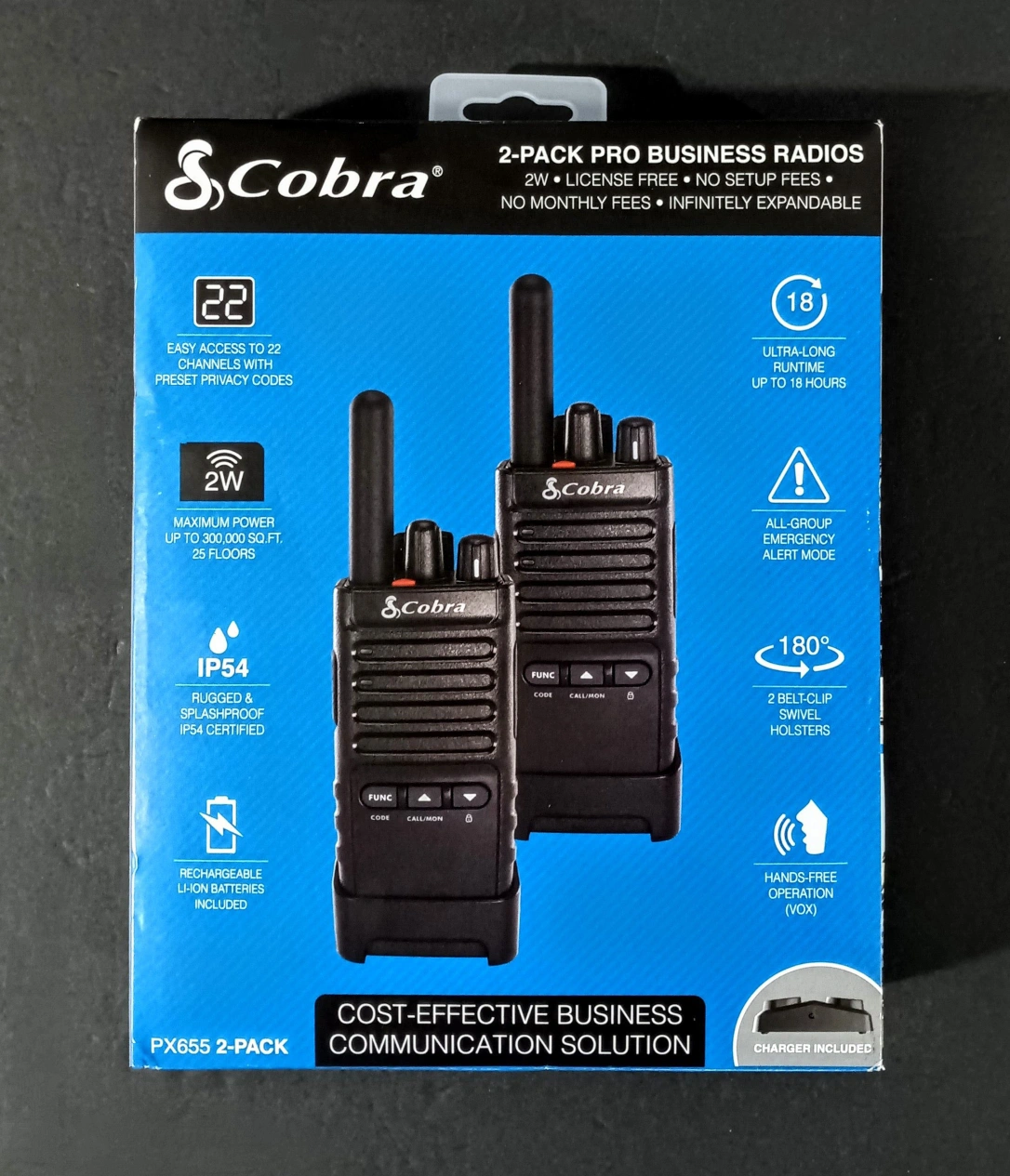 Cobra PX655 Pro Business 2W FRS Two-Way Radios (2-Pack) Is Brand New. Features & Details: *PROFESSIONAL AND DISCREET DESIGN - Designed for business use with up to 300,000 sq. ft/25 floor range. Communicate effortlessly in working areas like retail, restaurants, events, warehouses and more. *22 CHANNELS AND 121 PRIVACY CODES – These easy-to-use walkie-talkies combine 22 channels and 121 privacy codes to secure your conversations from surrounding hikers, hunters or wherever your adventure takes you. *VOICE-ACTIVATED TRANSMISSION (VOX) – Hands-free usage to automatically transmit when you speak so you can keep your arms and hands free. Great when hunting or for construction sites or other working conditions. *ULTRA-LONG RUNTIME - All-day usage up to 18 hours (90% Standby / 5% Talk / 5% Listen) so you can operate the whole workday without a charge. The swivel holster allows you to rotate in multiple positions for optimal comfort. *WATER RESISTANT (IPX4) RATING - Protects from splashing water, no matter the direction. Built with a strong shell so your radio can withstand harsh conditions. The water-resistant design allows clear communication, rain or shine. *2662 CHANNEL COMBINATIONS and preset with privacy code to minimize interference. *SWIVEL HOLSTER - Rotate the holster in multiple positions for optimal comfort. *UNIT DIMENSIONS & WEIGHT: Weight: 4 ounces, Dimensions: 1.91" L x 2.2" W x 6.94" H *WHAT'S INCLUDED: 2 Cobra Walkie Talkies, 2-Port Charging Dock, Wall Adapter, Belt Clips, Manual.