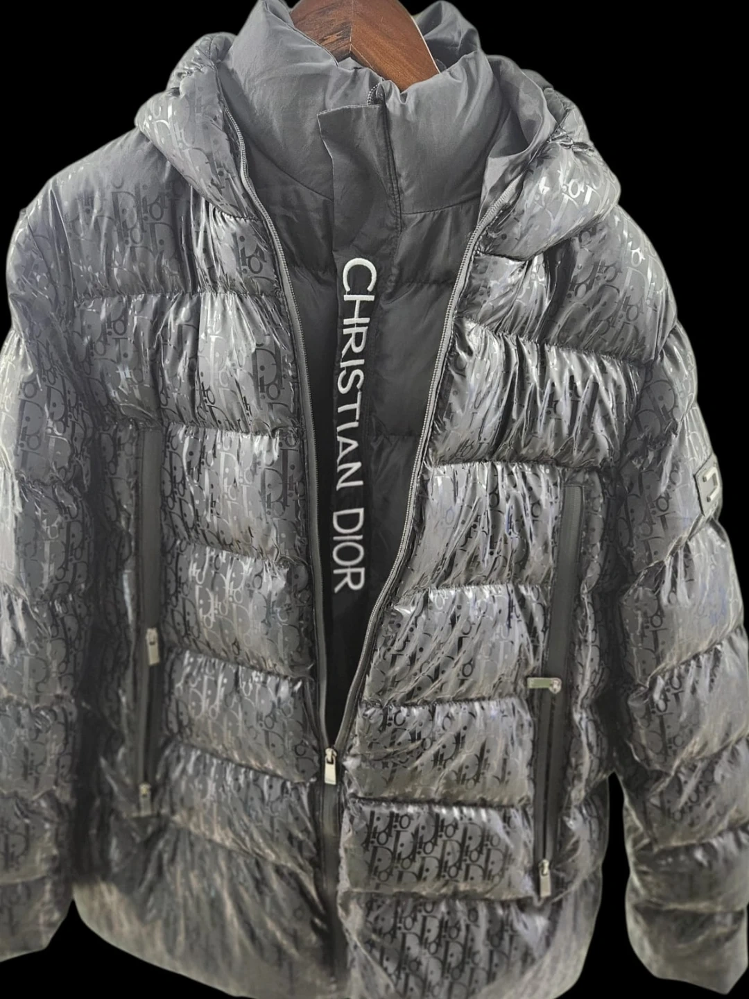 Check out this stylish Dior puffer jacket! It features a sleek black design with the iconic Dior logo pattern throughout. Perfect for staying warm and fashionable this winter!