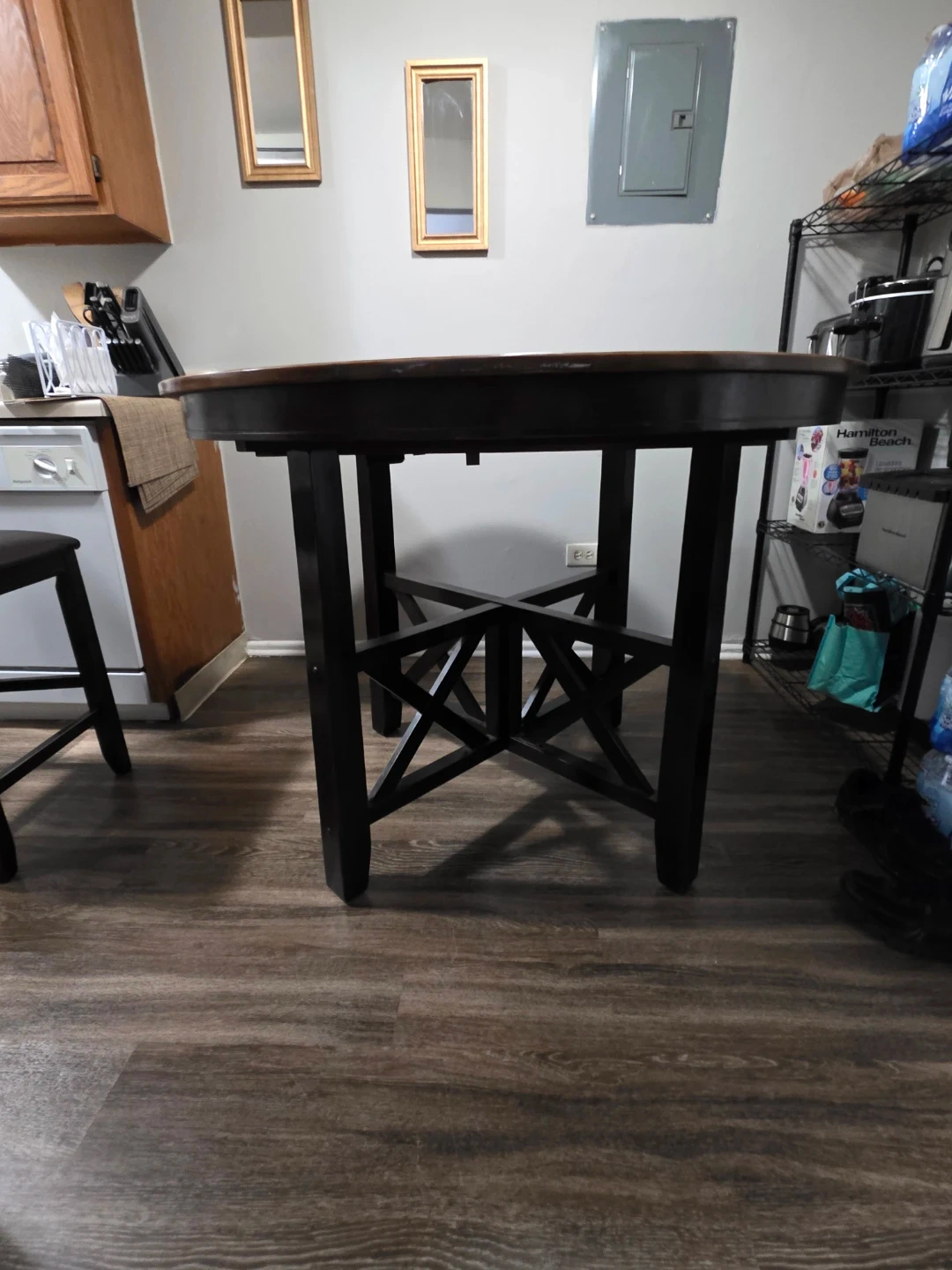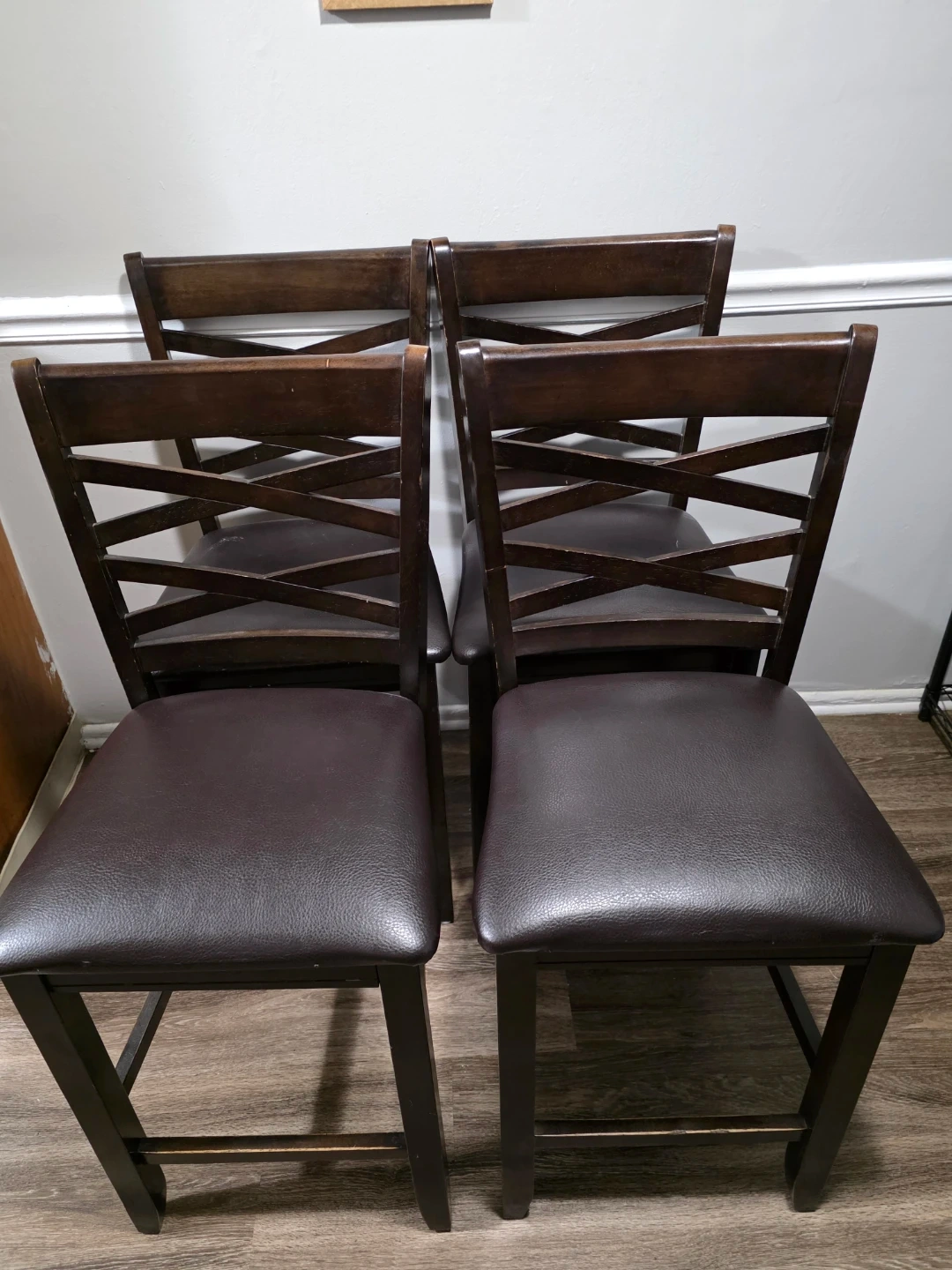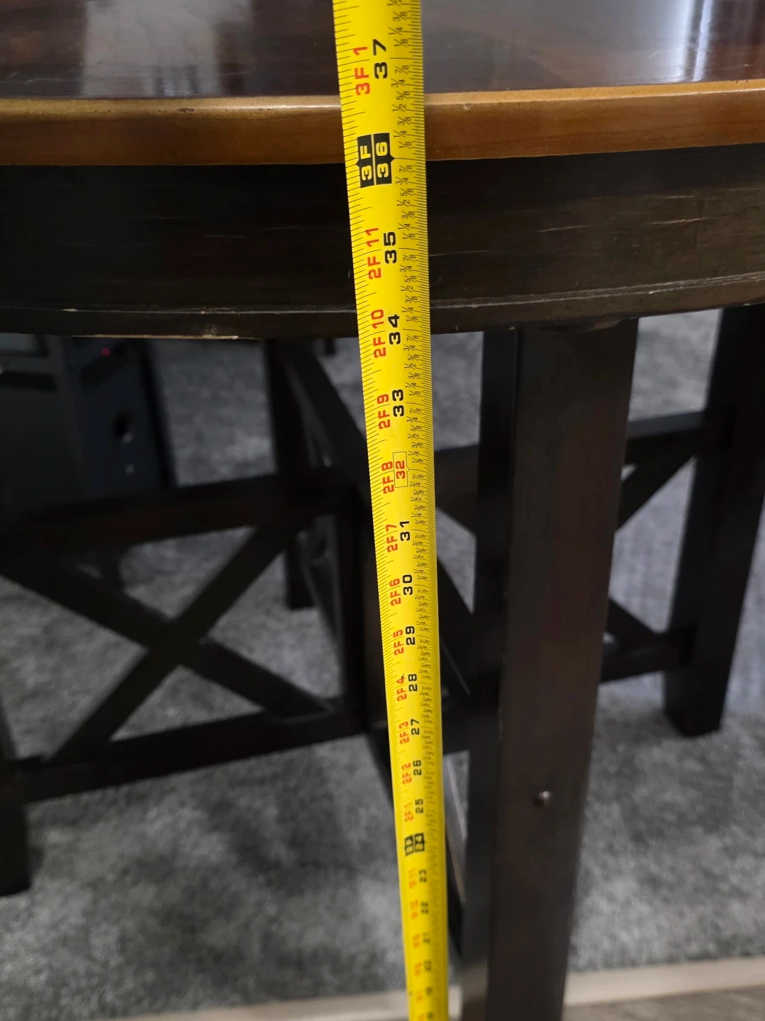5 pc counter height dining set. Very sturdy and in good condition with built-in leaf extends the table an extra 18in. Minor blemishes on the table. 4 chairs, one has a small crack in the seat. (see photo) Dimensions are in the pics.