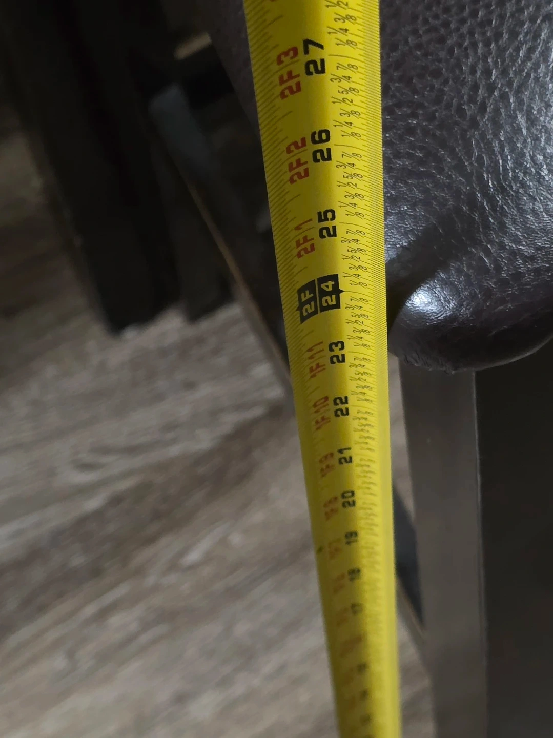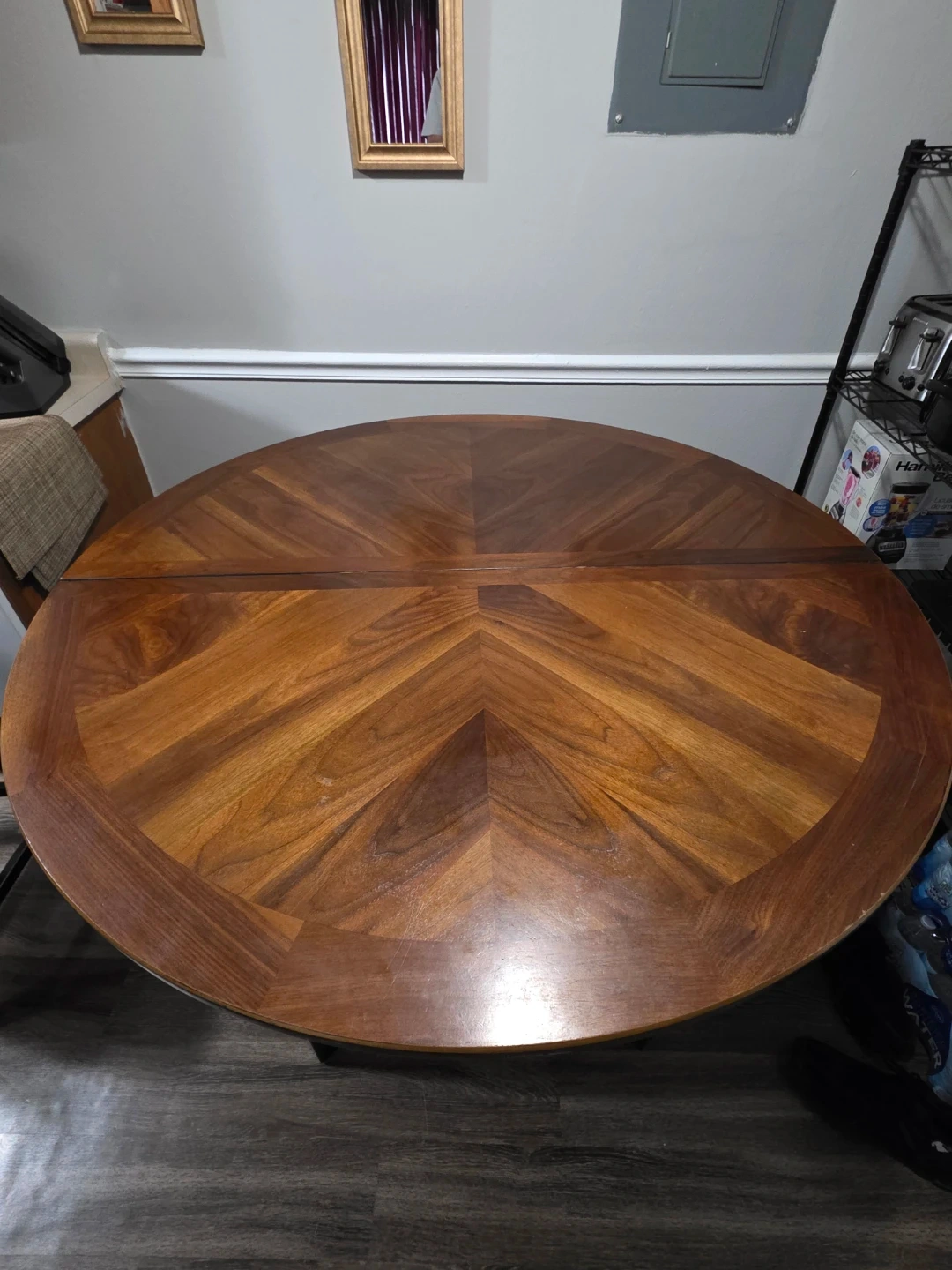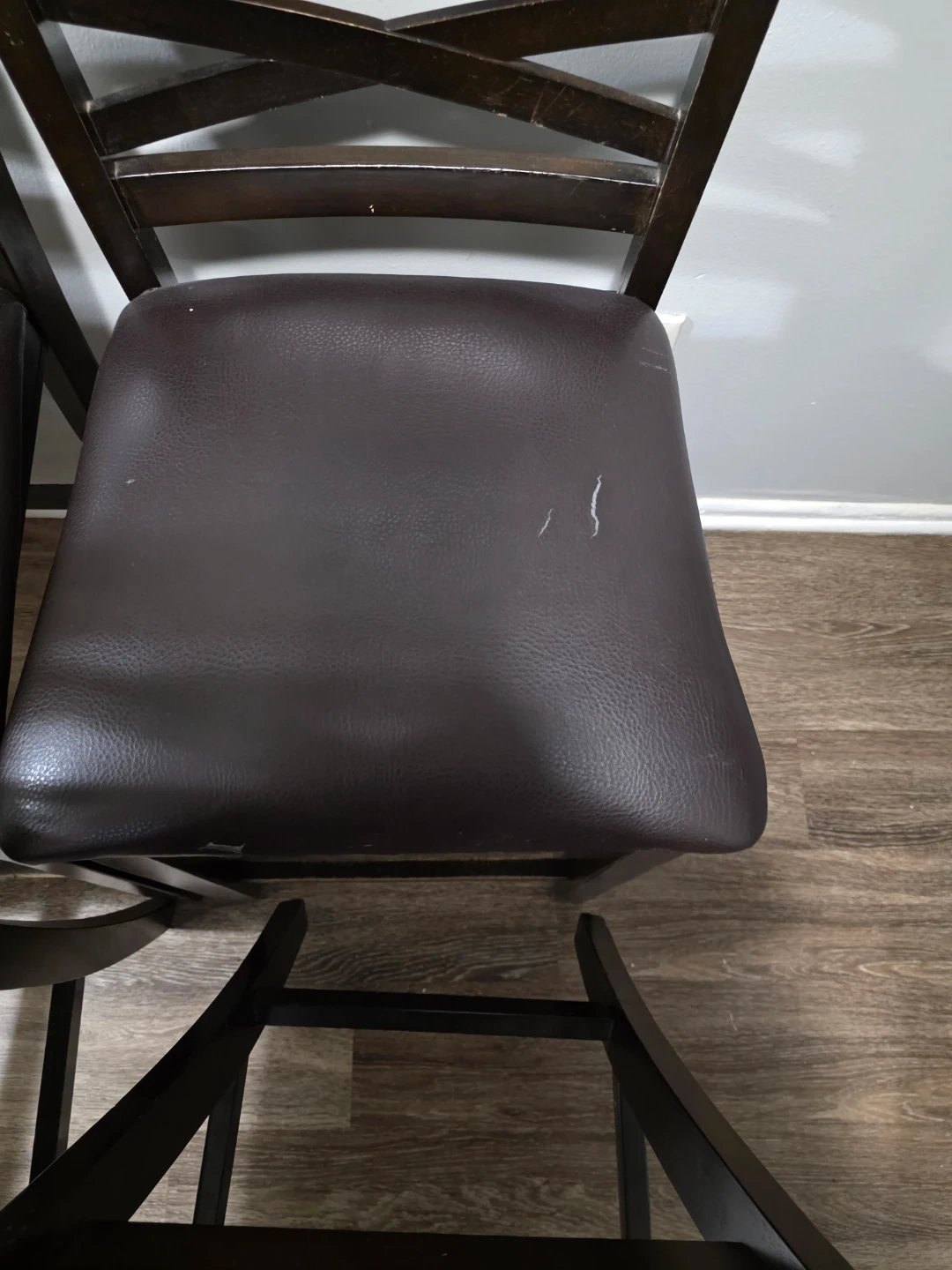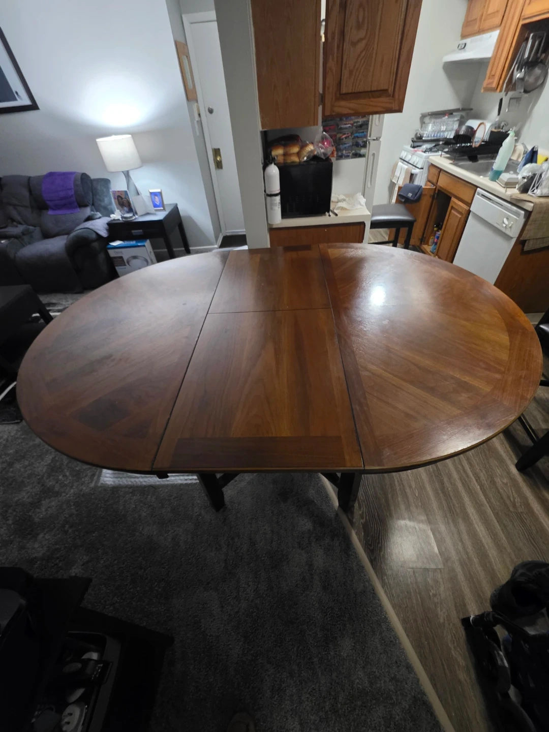 5 pc counter height dining set. Very sturdy and in good condition with built-in leaf extends the table an extra 18in. Minor blemishes on the table. 4 chairs, one has a small crack in the seat. (see photo) Dimensions are in the pics.