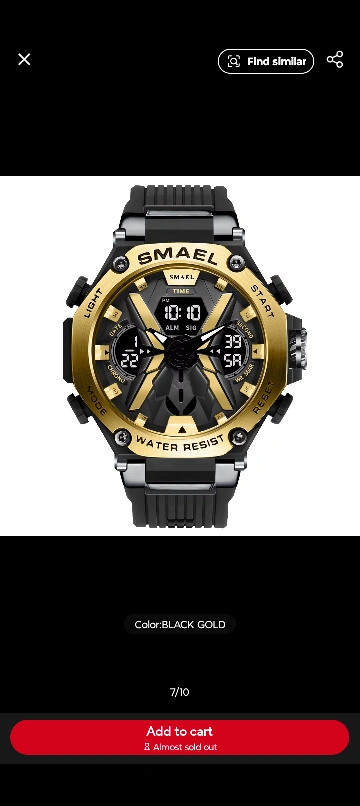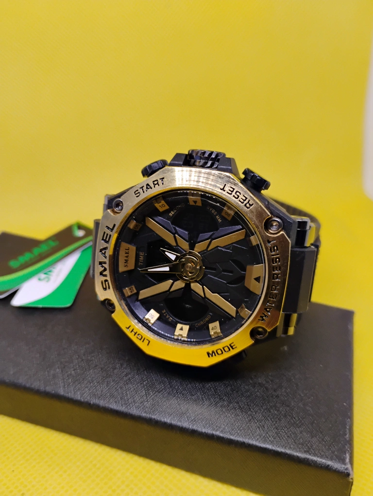 75Men's digital watch. Black and gold color scheme. Water resistant. Multiple functions. brand new