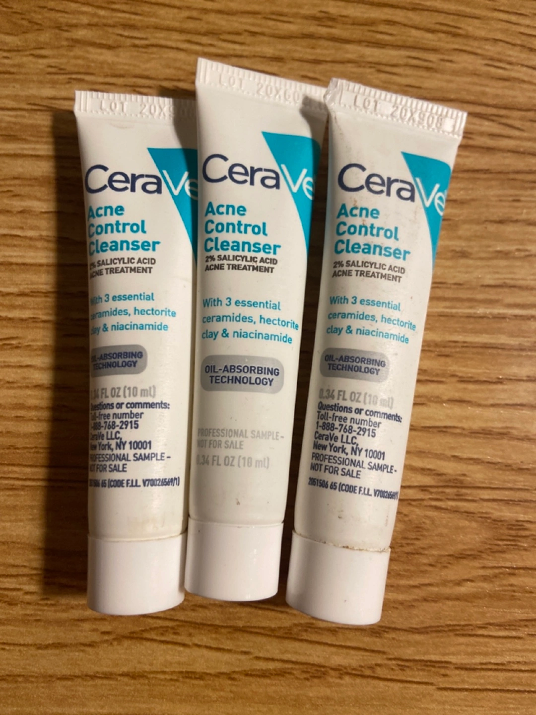 Three mini tubes of CeraVe Acne Control Cleanser. 2% Salicylic Acid acne treatment. Contains ceramides, hectorite clay & niacinamide. Oil-absorbing technology.