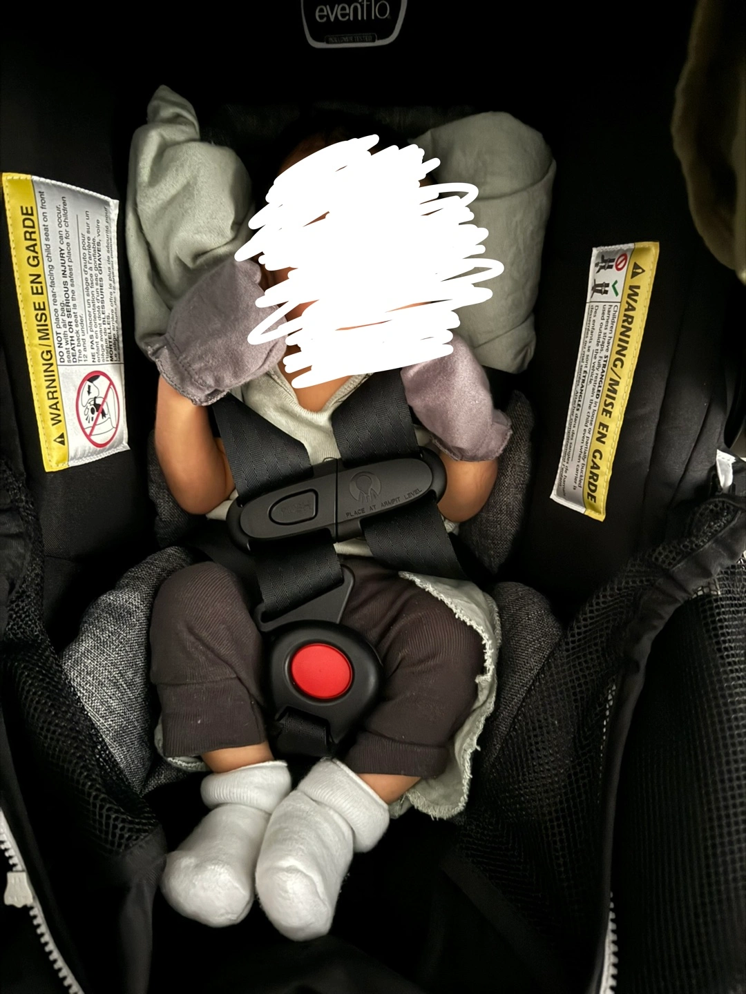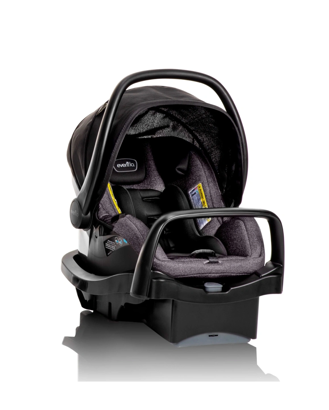 Infant car seat, gray fabric, black base. Includes canopy and base.