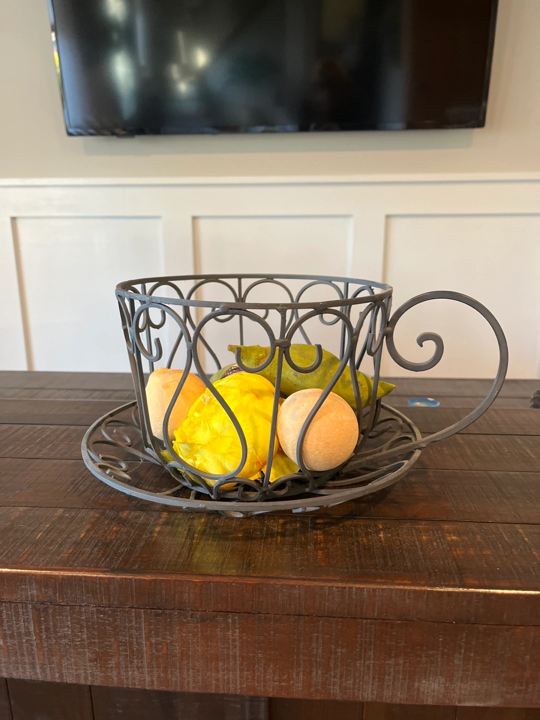 Ornate metal teacup-shaped bowl. Perfect for decorative fruit or other small items. Features a swirling handle and detailed metalwork.