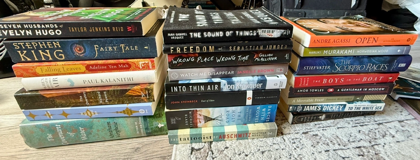 Stack of various fiction and non-fiction books. Many different authors and titles. Good for readers or collectors.
