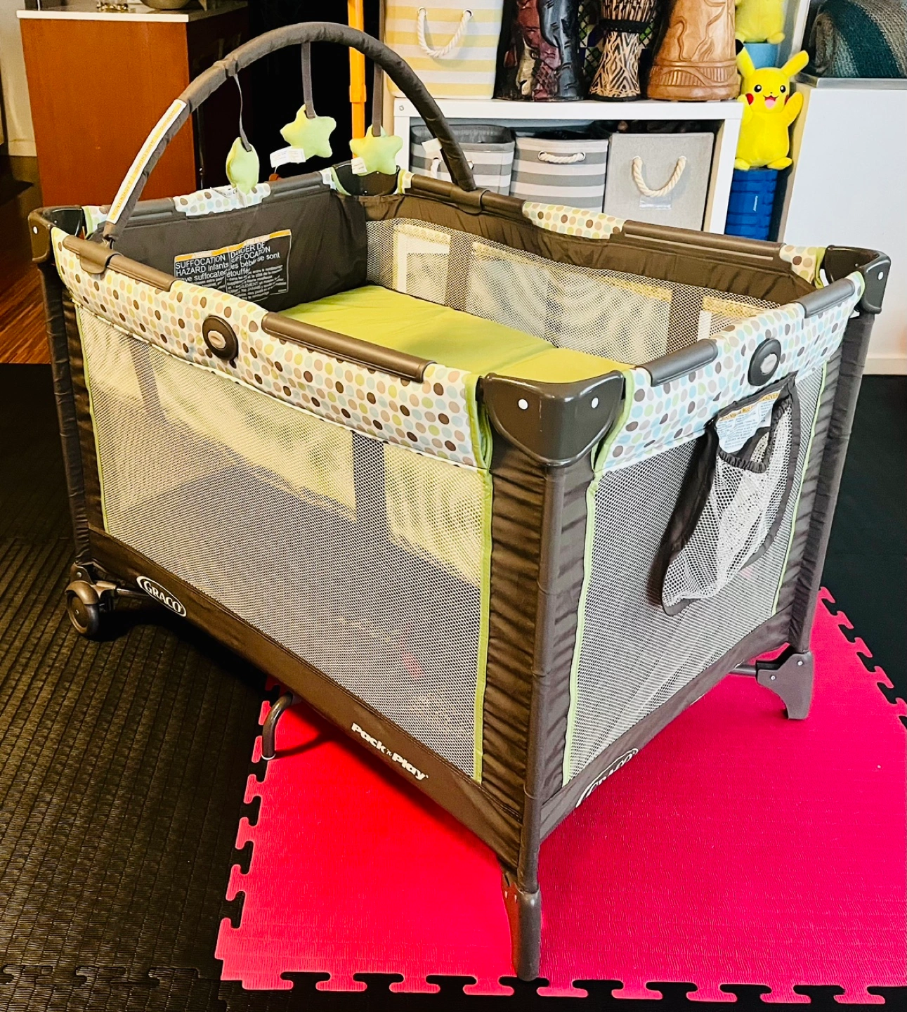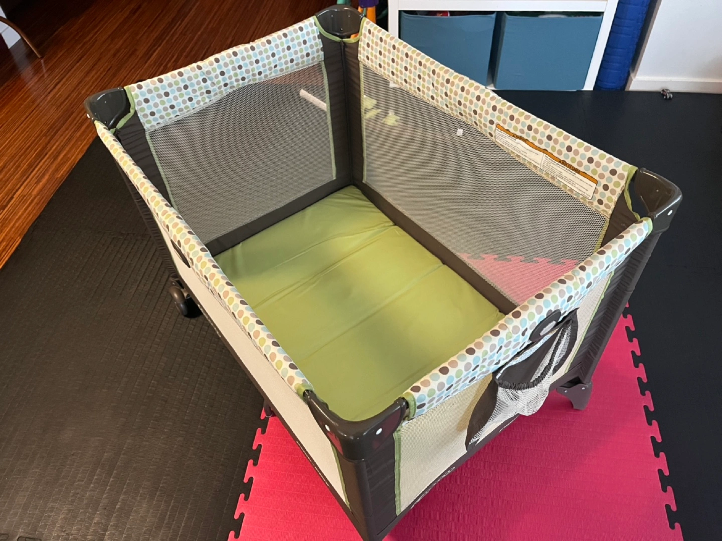 Portable playard, easy setup. Lightweight and convenient. Features a carrying bag (not pictured). Includes a mat. Suitable for babies and toddlers.