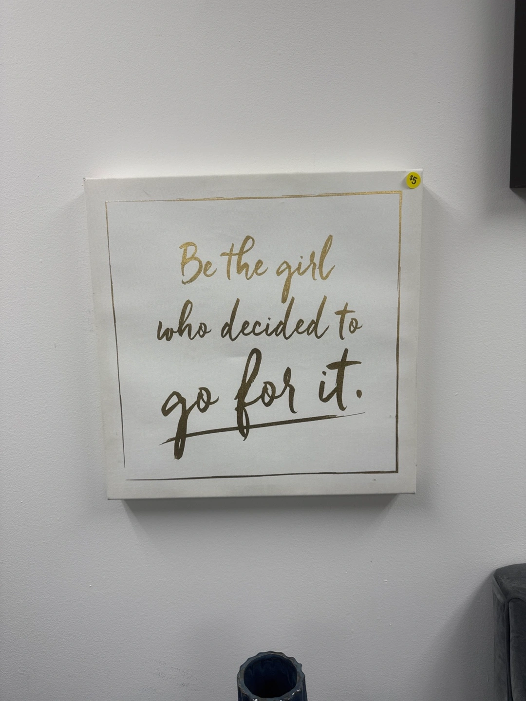 Canvas wall art featuring gold lettering. Motivational quote: Be the girl who decided to go for it.