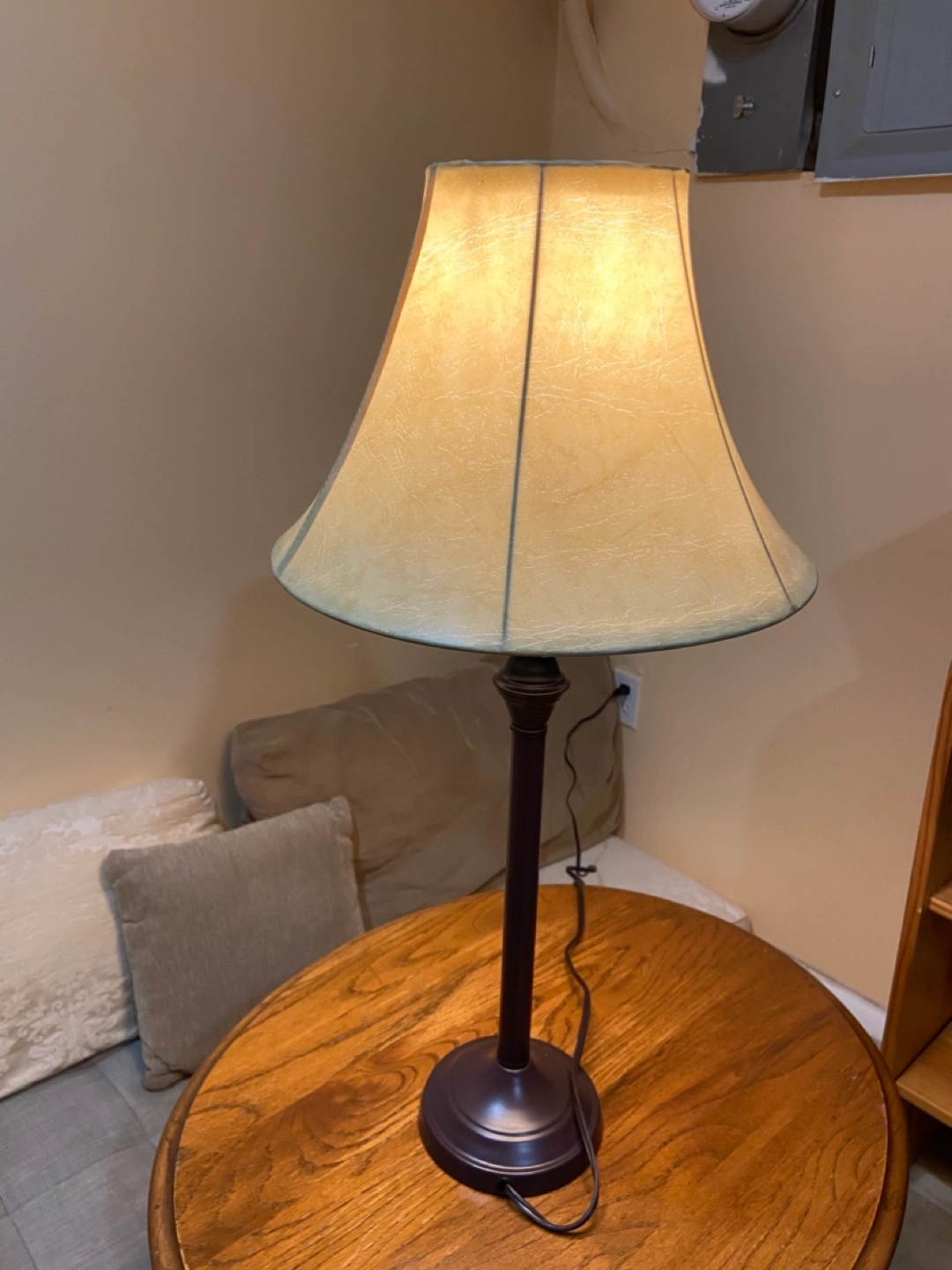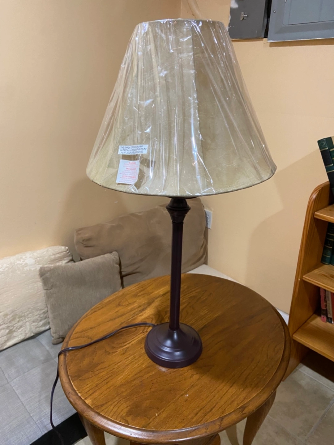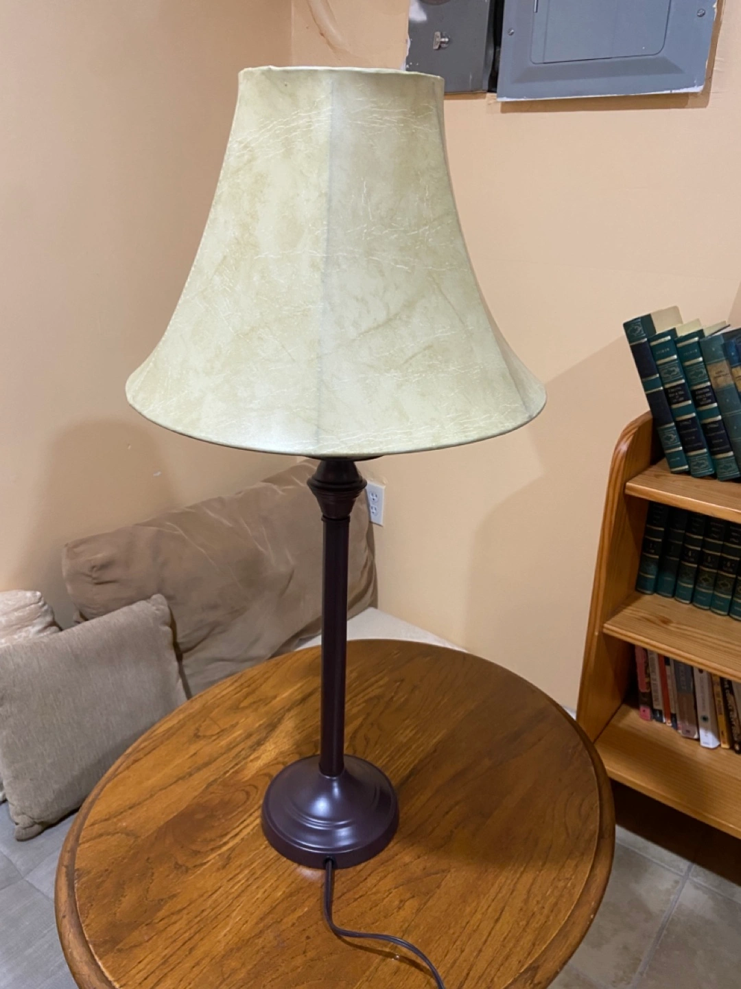 Dark brown metal table lamp. Beige fabric shade. Cord included. Good condition. Perfect for a bedroom or living room. 29” high. Brand new i have two new lamps