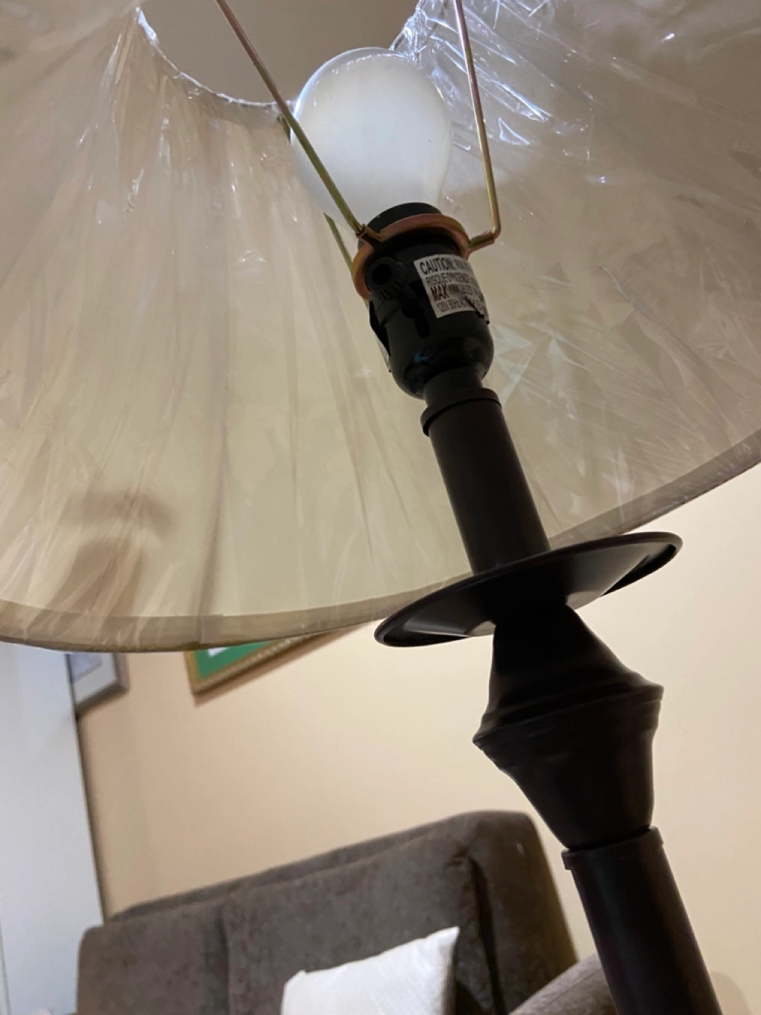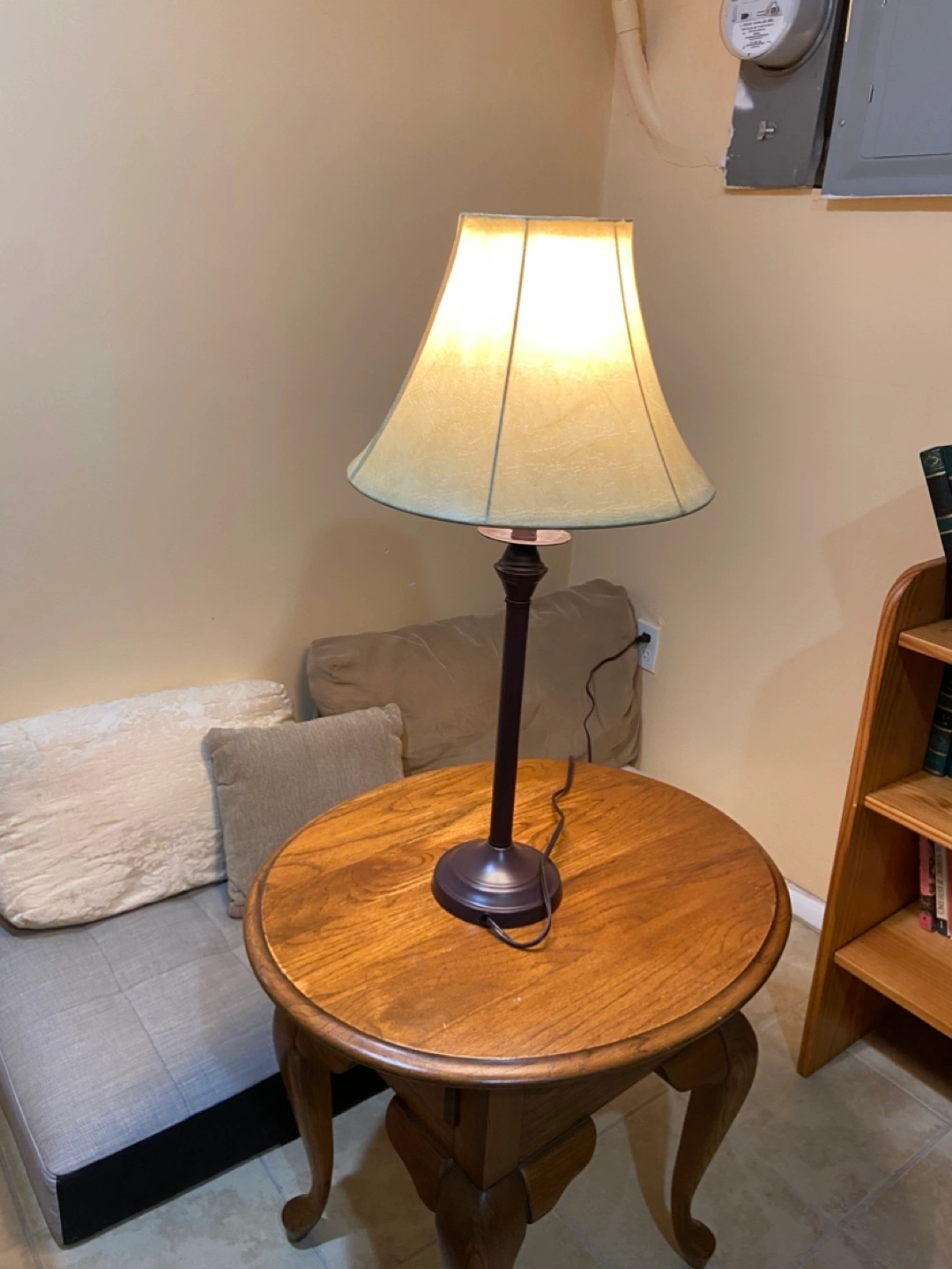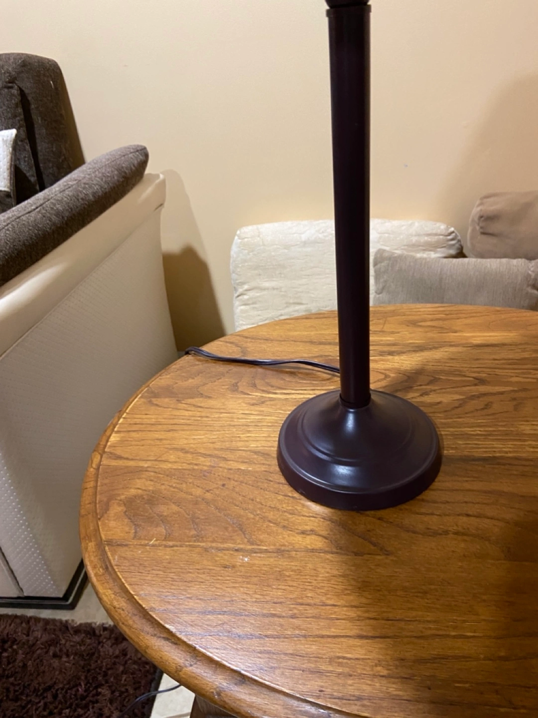 Dark brown metal table lamp. Beige fabric shade. Cord included. Good condition. Perfect for a bedroom or living room. 29” high. Brand new i have two new lamps
