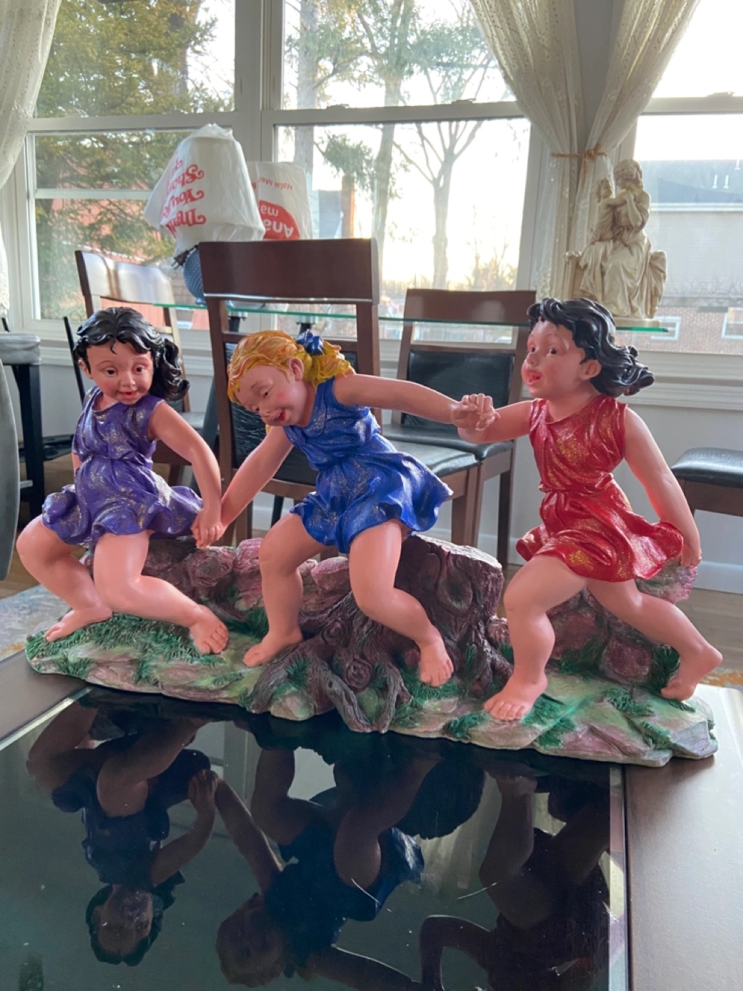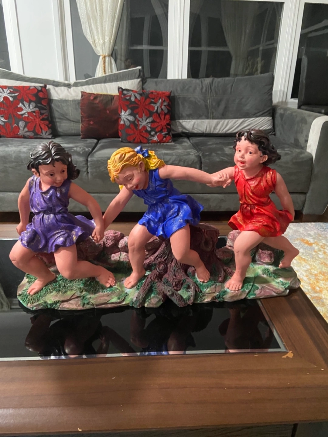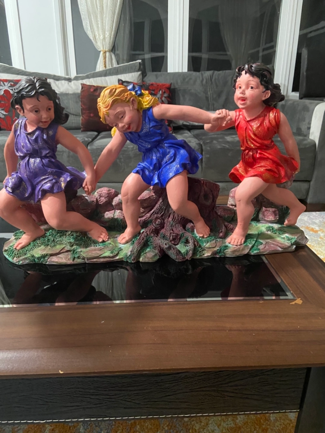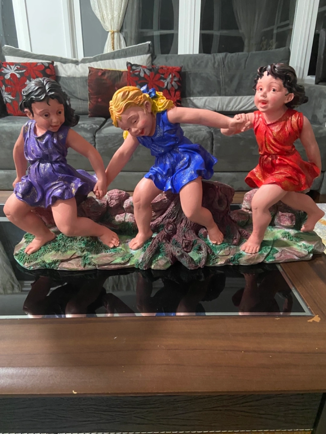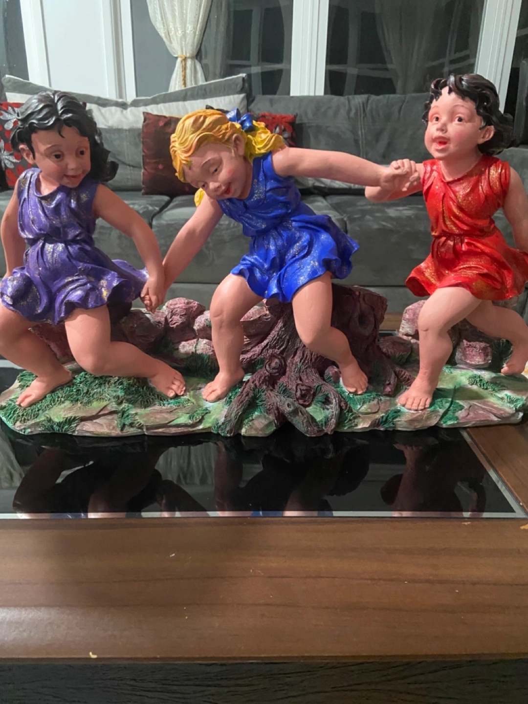 Colorful resin statuette. Three girls holding hands. Playful design. Great accent piece.