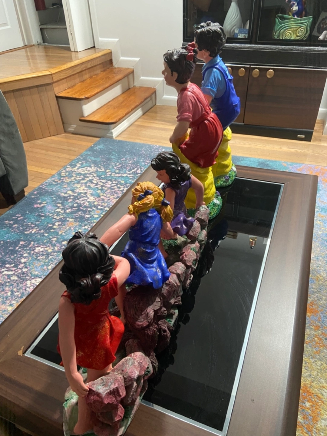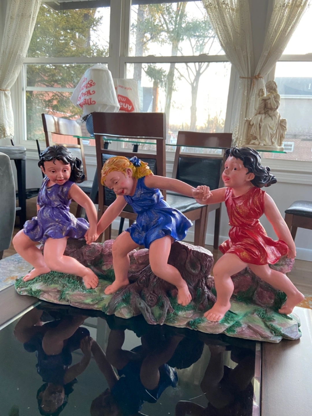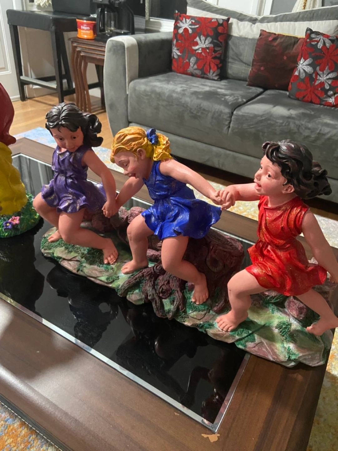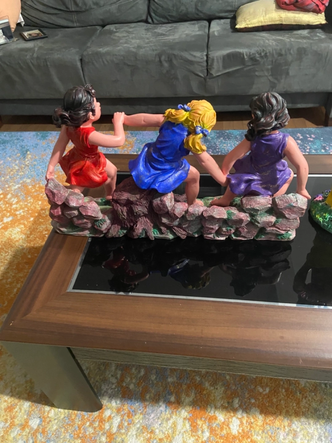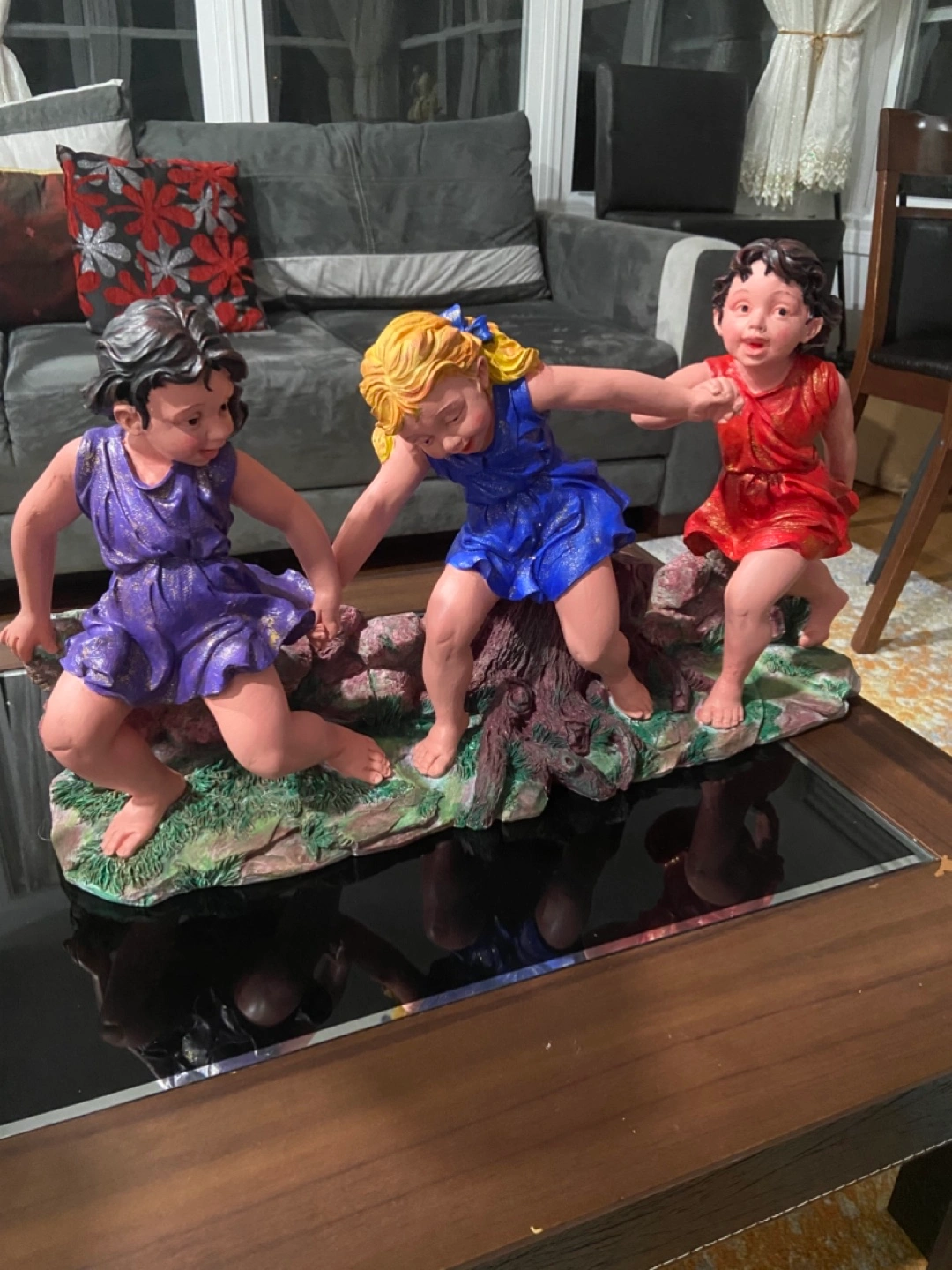 Colorful resin statuette. Three girls holding hands. Playful design. Great accent piece.