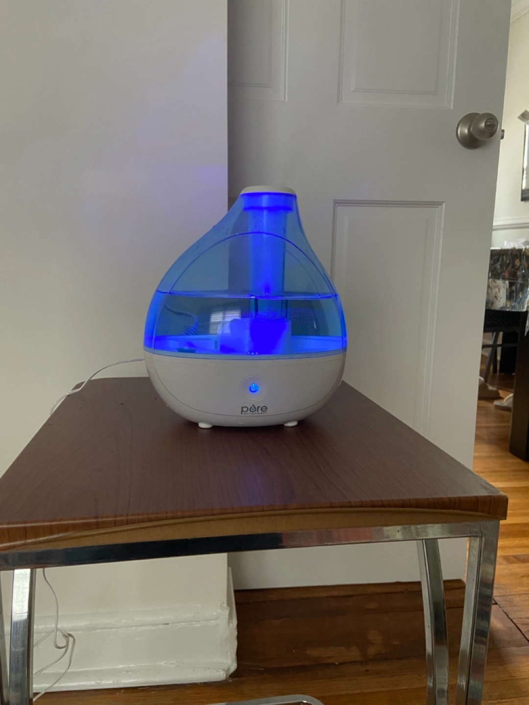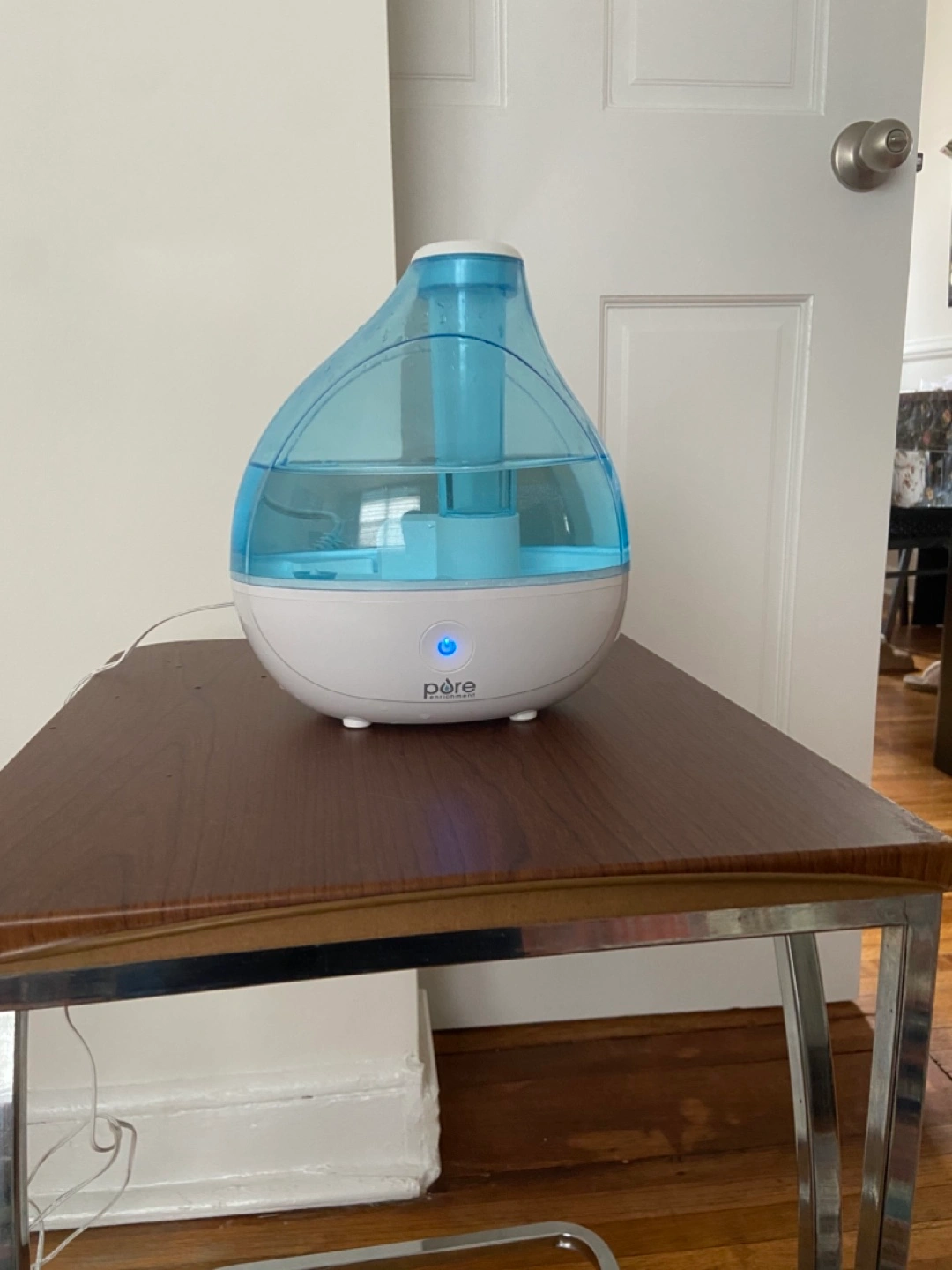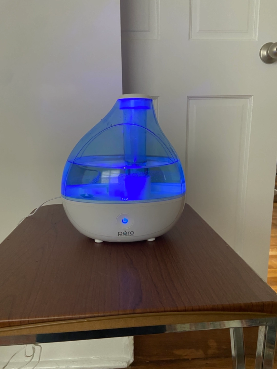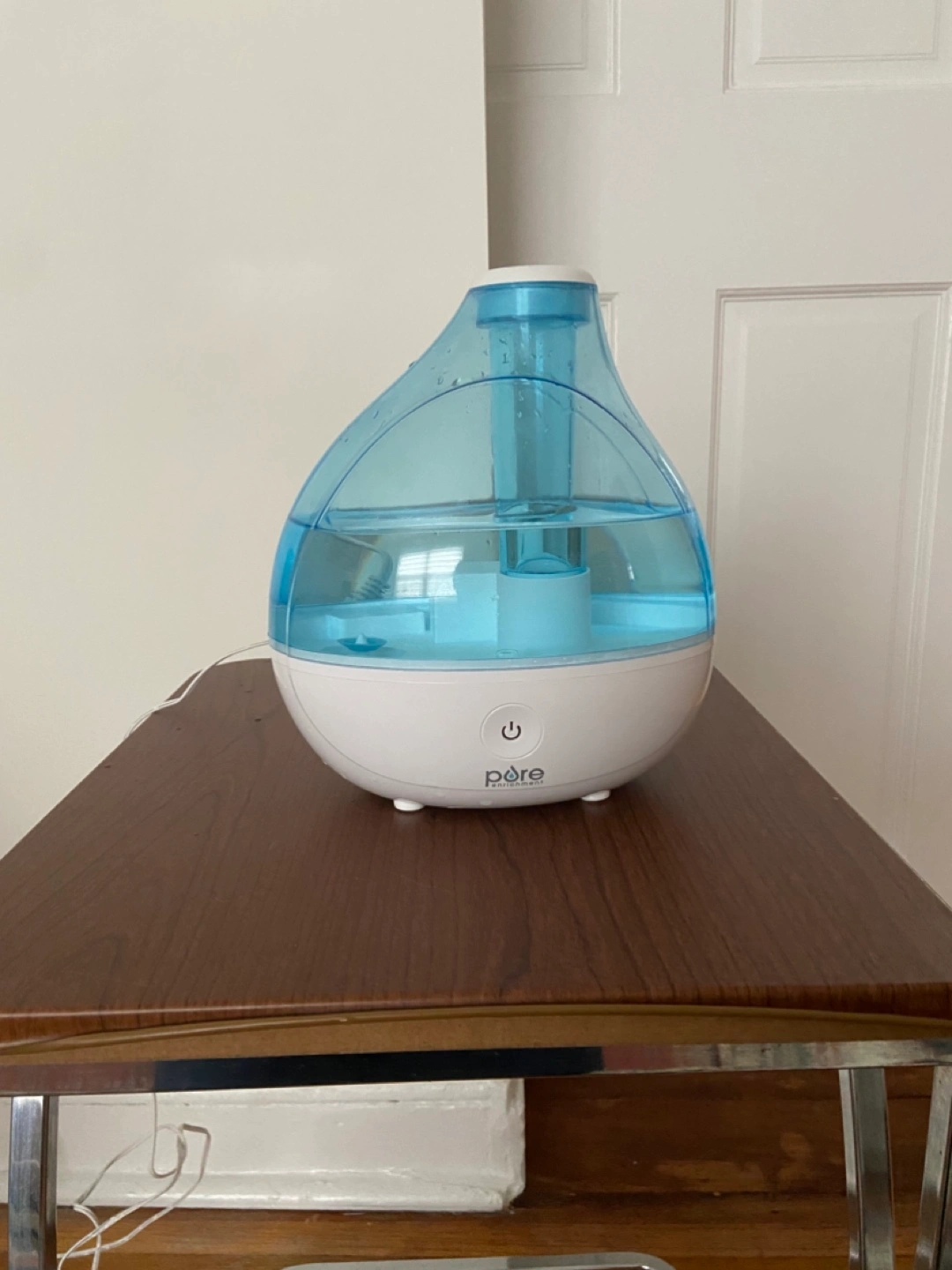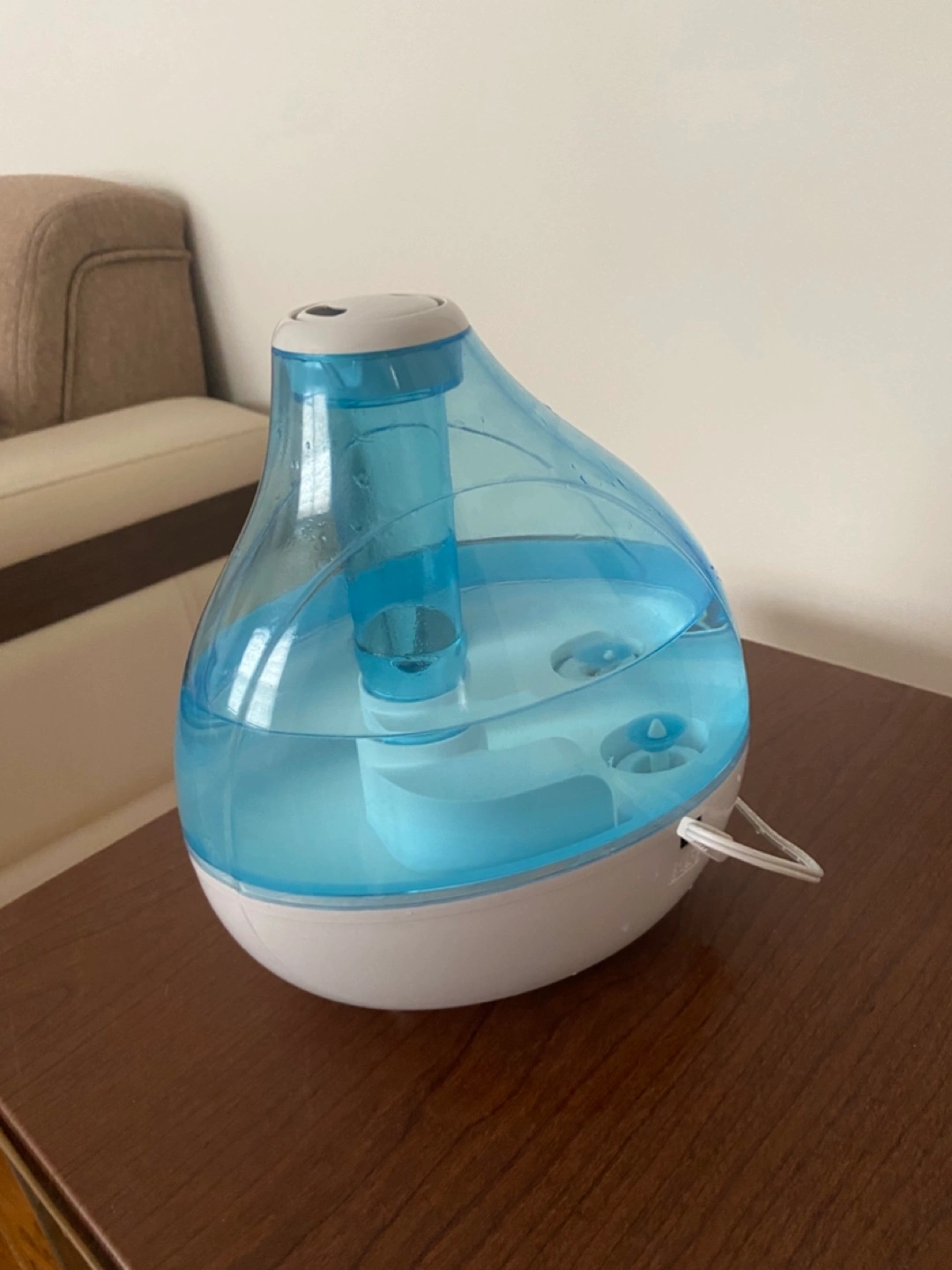 Ultrasonic cool mist humidifier. White and blue. Great for dry air. Quiet operation.