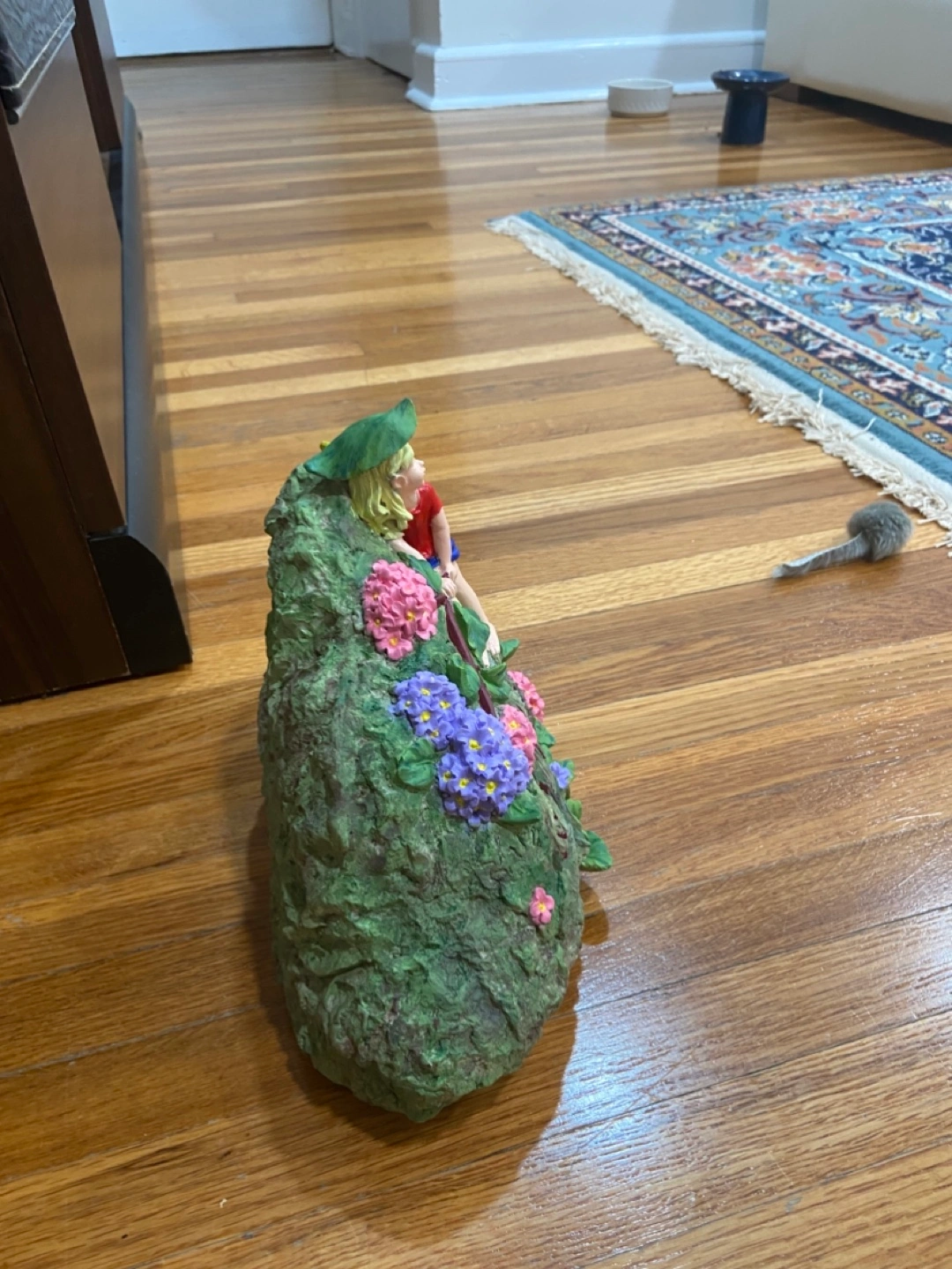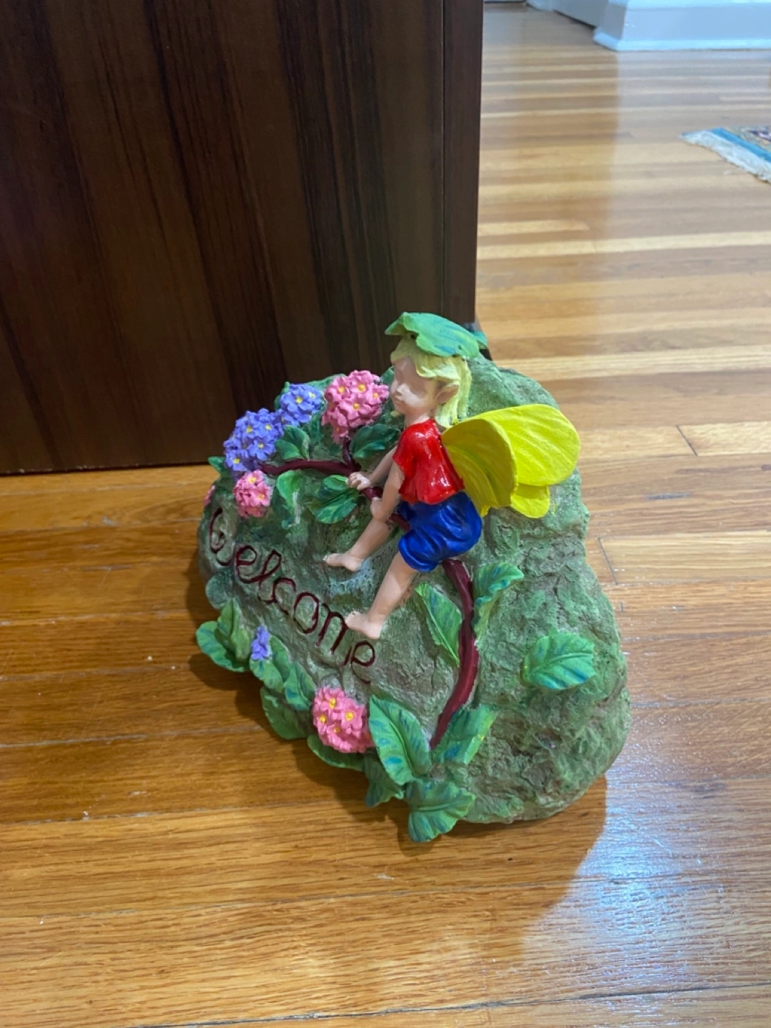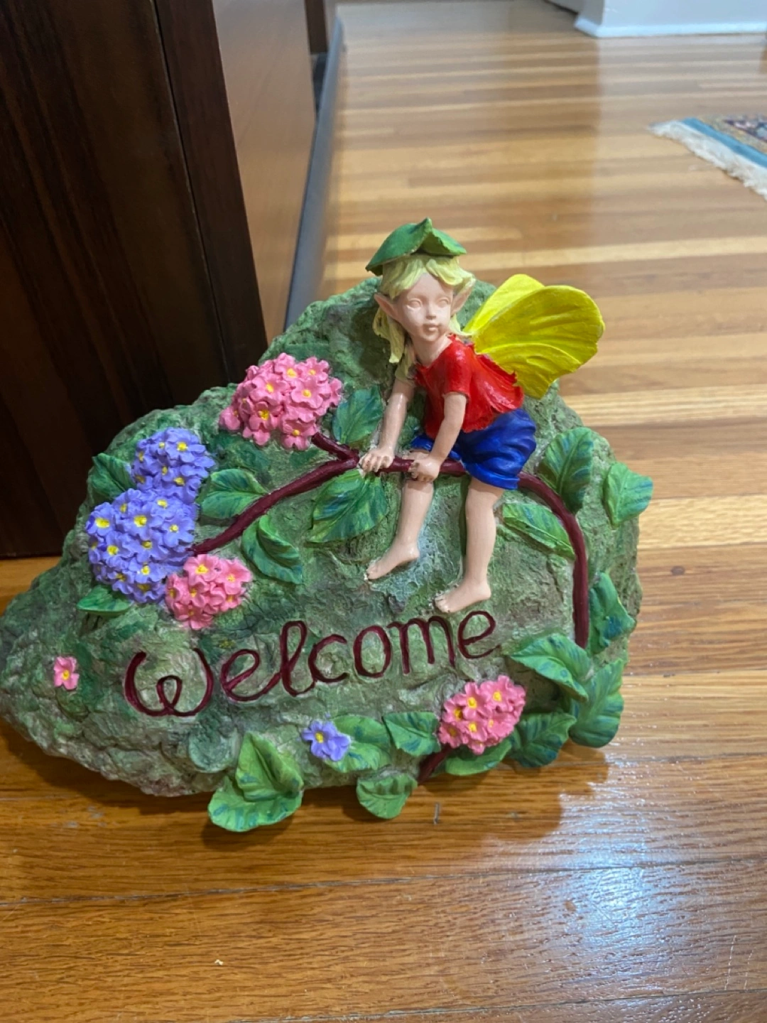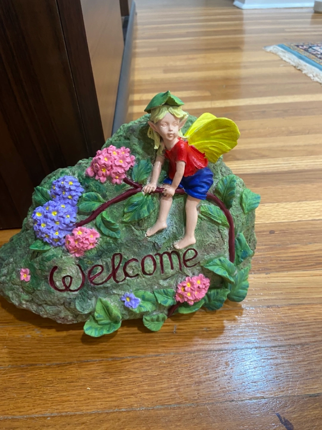 Adorable fairy figurine sitting on a rock. Colorful flowers and welcome sign. Perfect garden decoration.
