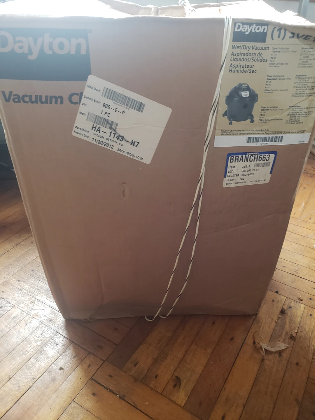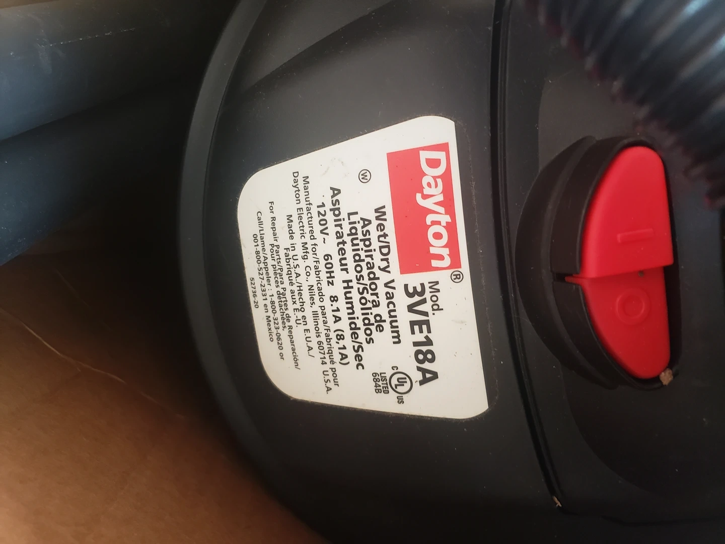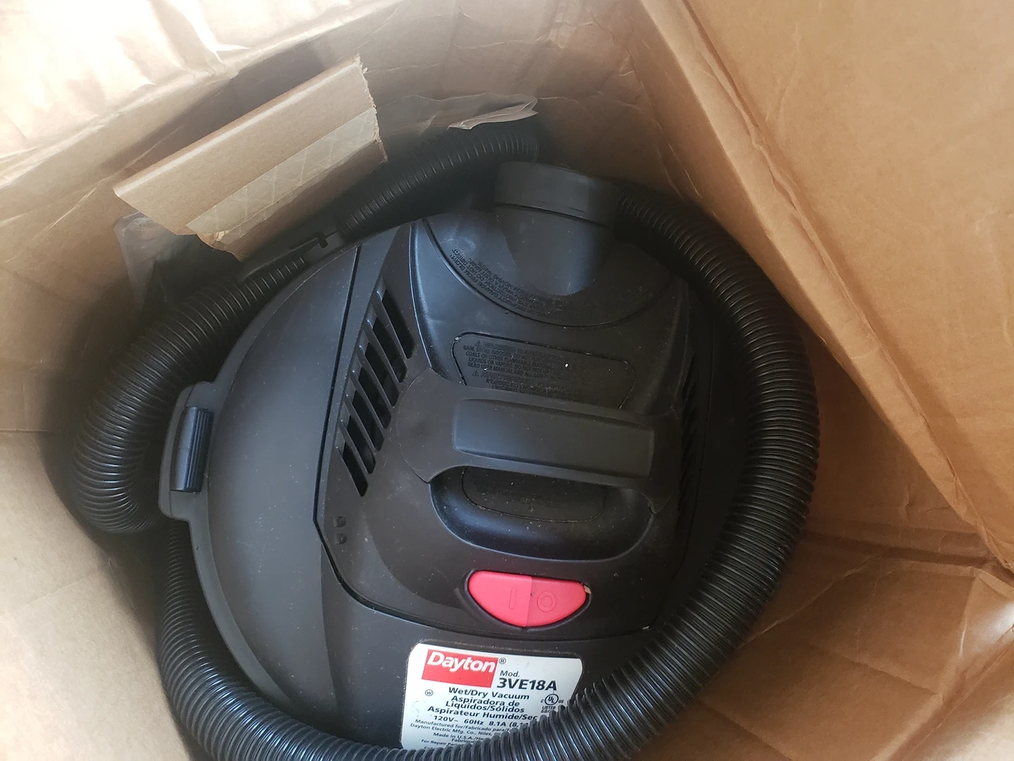 new in box Dayton 6 gallon wet/dry vacuum type: single stage capacity: 6 gal (22.7 liters) v: 120 hz: 60 A: 8.1 Filter: cartridge and foam sleeve